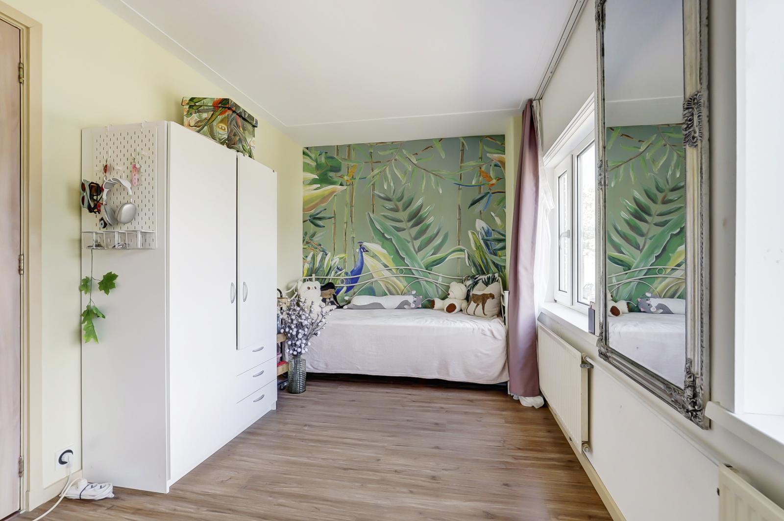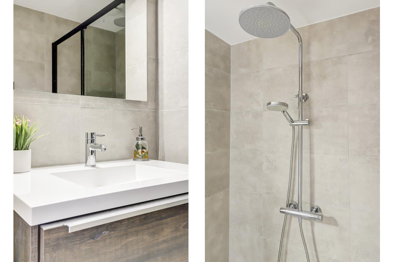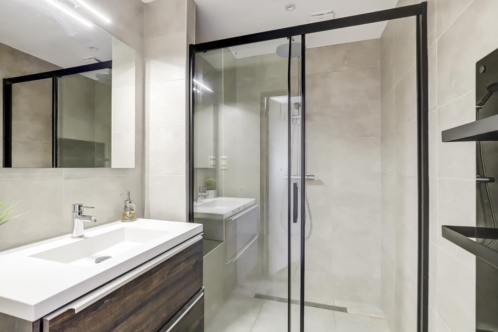 Eerste verdieping: overloop, twee goed bemeten slaapkamers (waarvan één toegang geeft tot het dakterras aan de achterzijde van de woning), moderne badkamer uit 2024 met ruime douche en een wastafelmeubel.