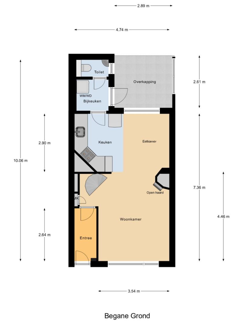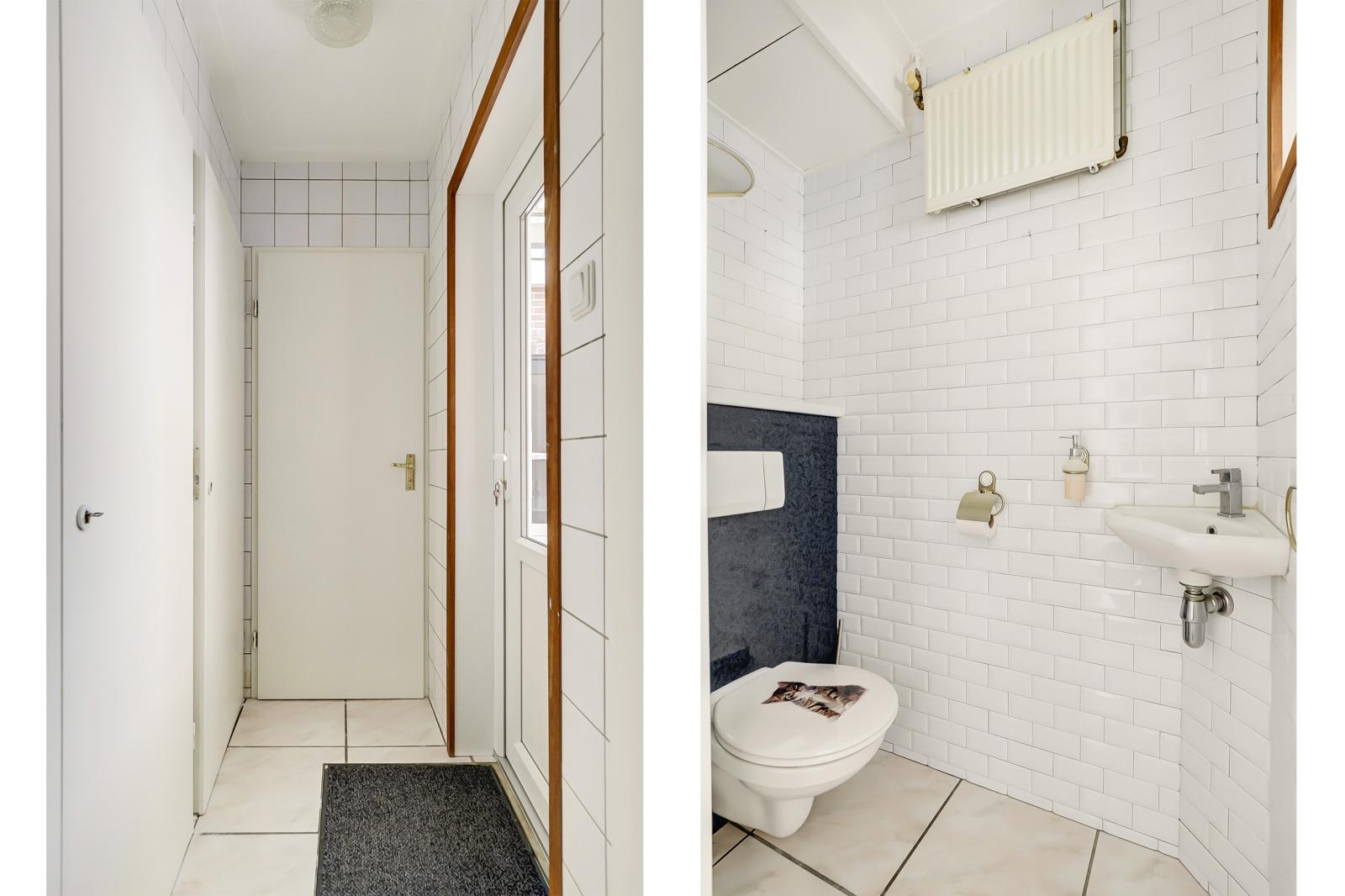 Begane grond: entree, hal, woonkamer met plavuizen vloer voorzien van vloerverwarming en een actieve open haard, meterkast voorzien van een nieuwe groepenkast, open keuken voorzien van inbouwapparatuur (gasfornuis, afzuigkap, oven, vaatwasser), bijkeuken met opstelling voor de wasmachine en de droger, toilet, deur naar de achtertuin op het zuiden, vrijstaande berging.