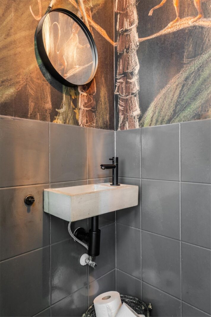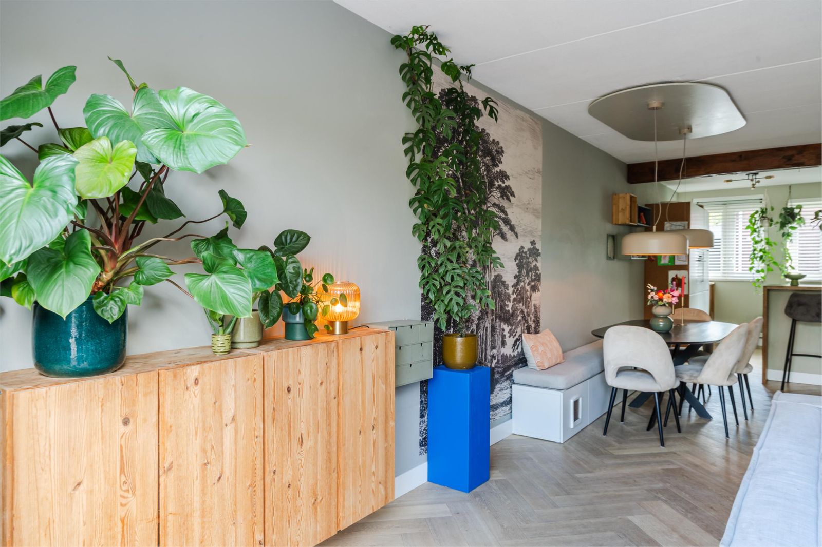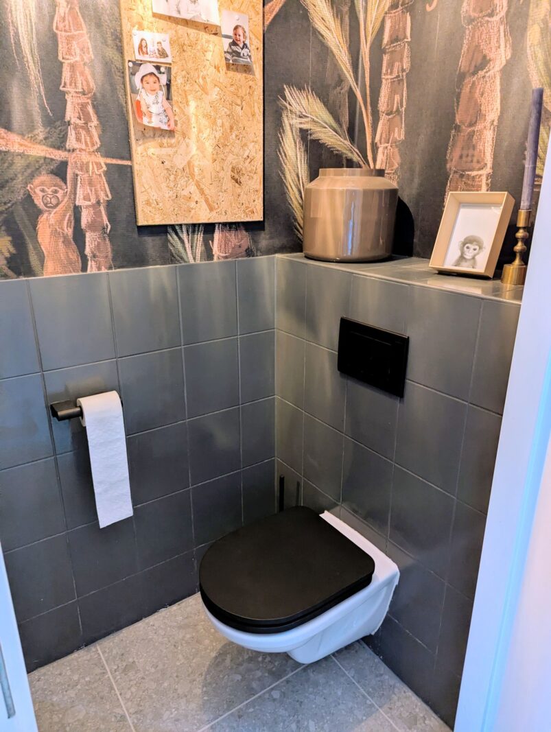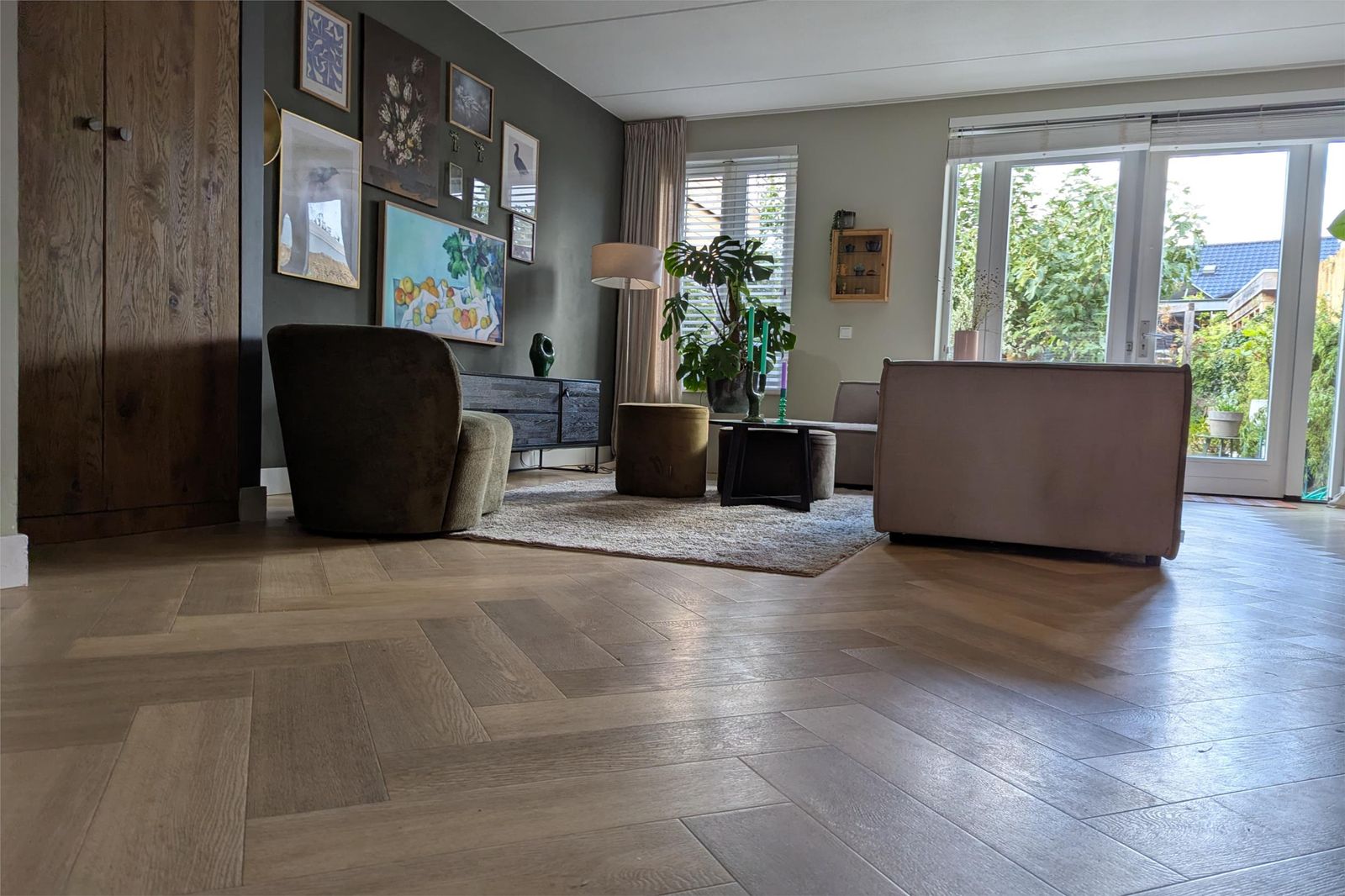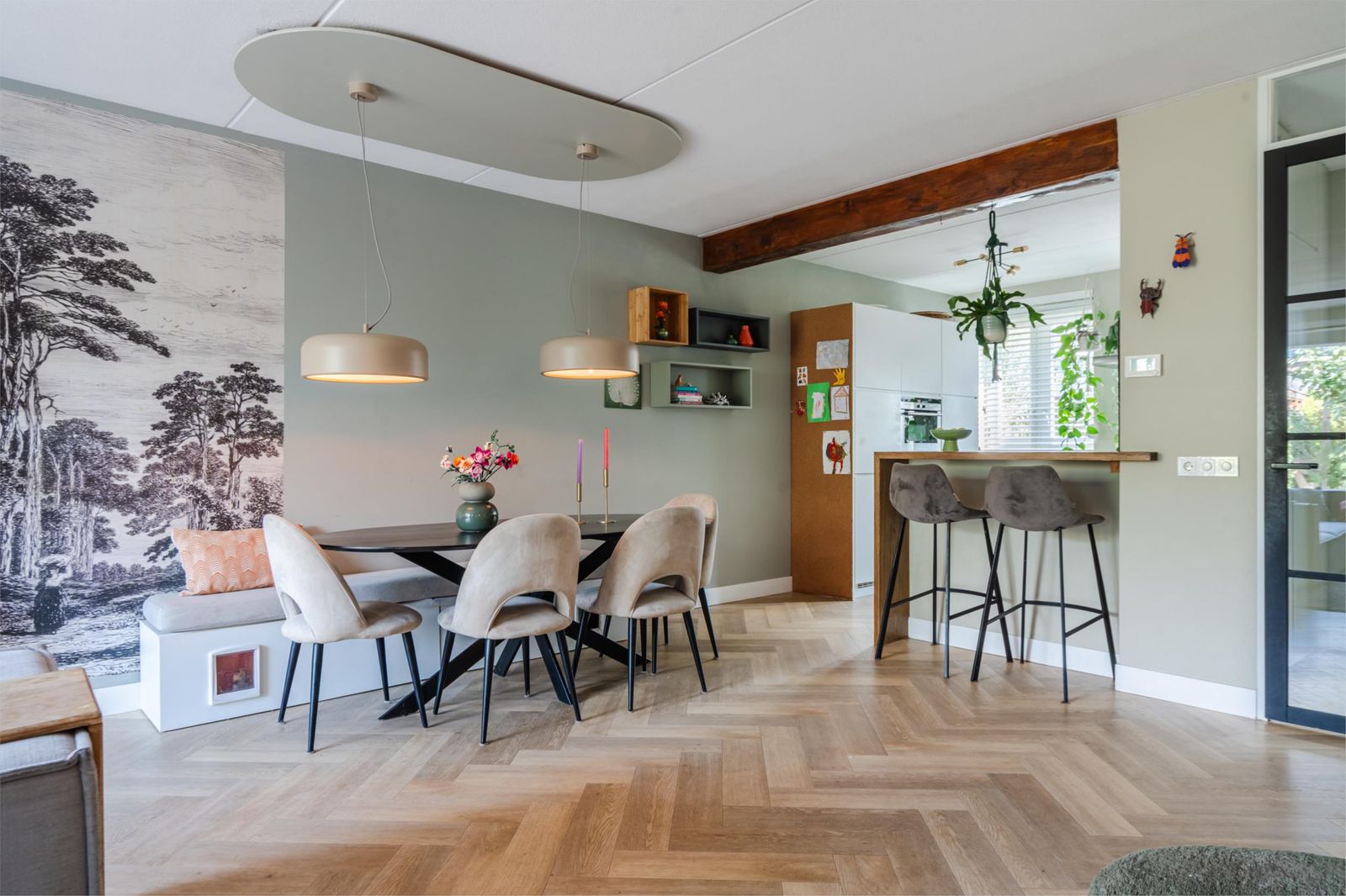 Er ligt een stijlvolle visgraad pvc vloer (2020) die doorloopt in de keuken en toilet met vloerverwarming. Gegarandeerd warme voeten dus!