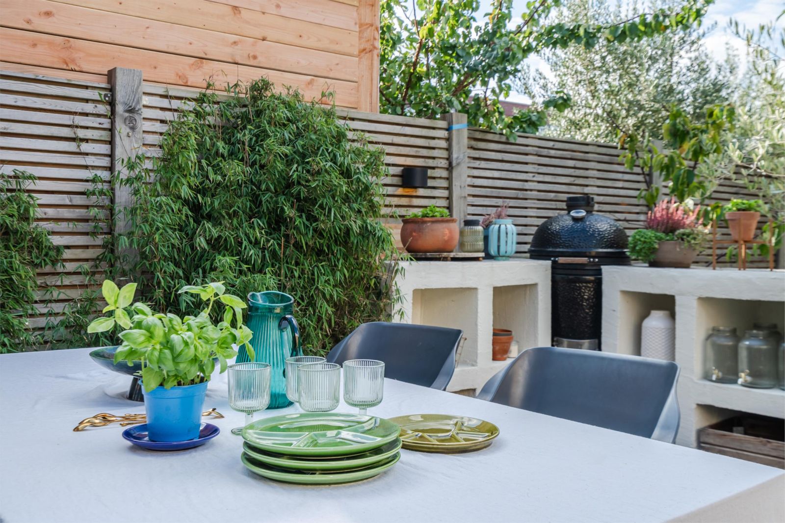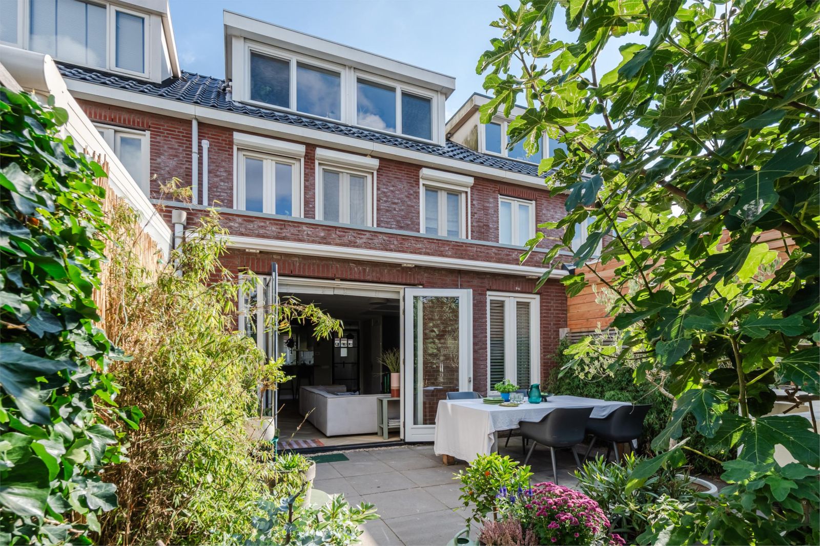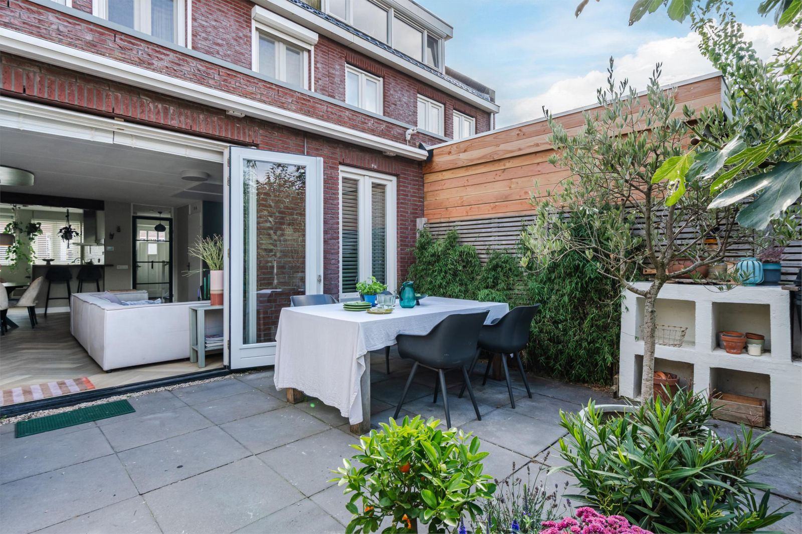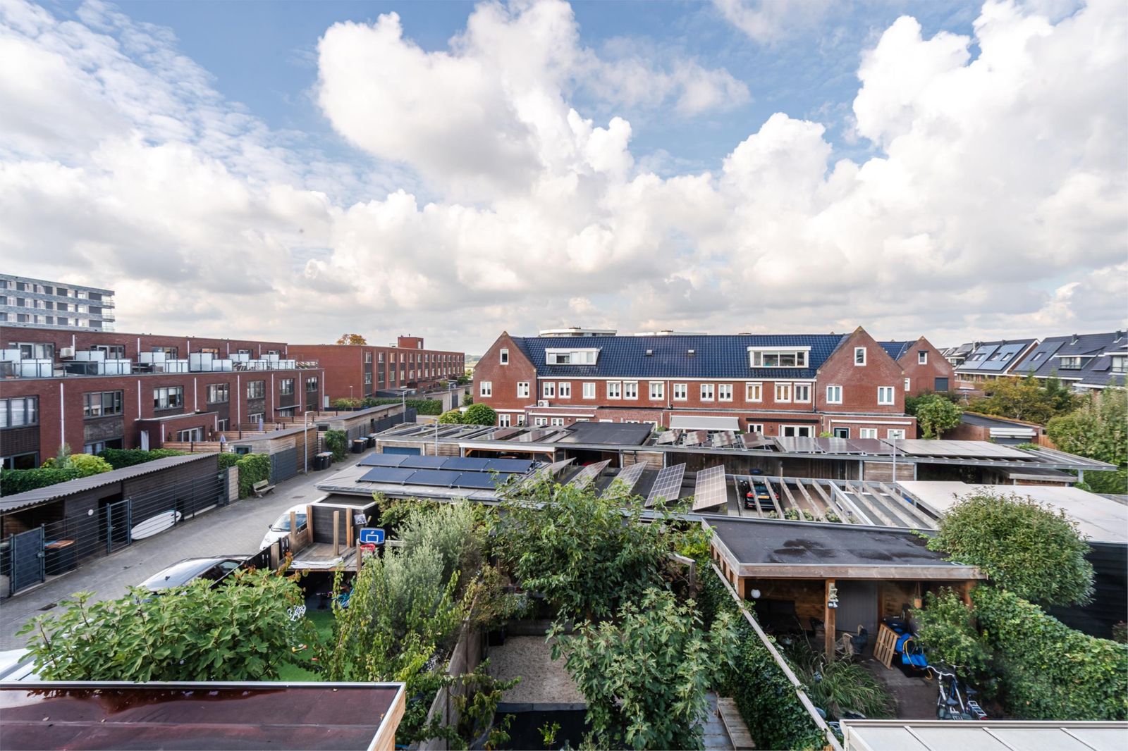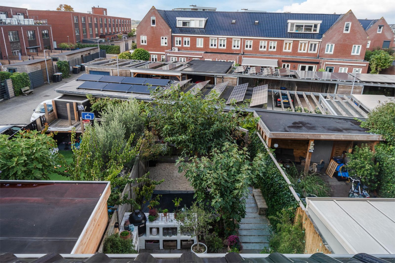En dan de tuin: meer dan 20 meter diep met een fijne overkapping en een carport voor 2 auto's met eigen oplaadpunt. De tuin ligt op het westen waardoor je tot zonsondergang van het zonnetje kunt genieten.