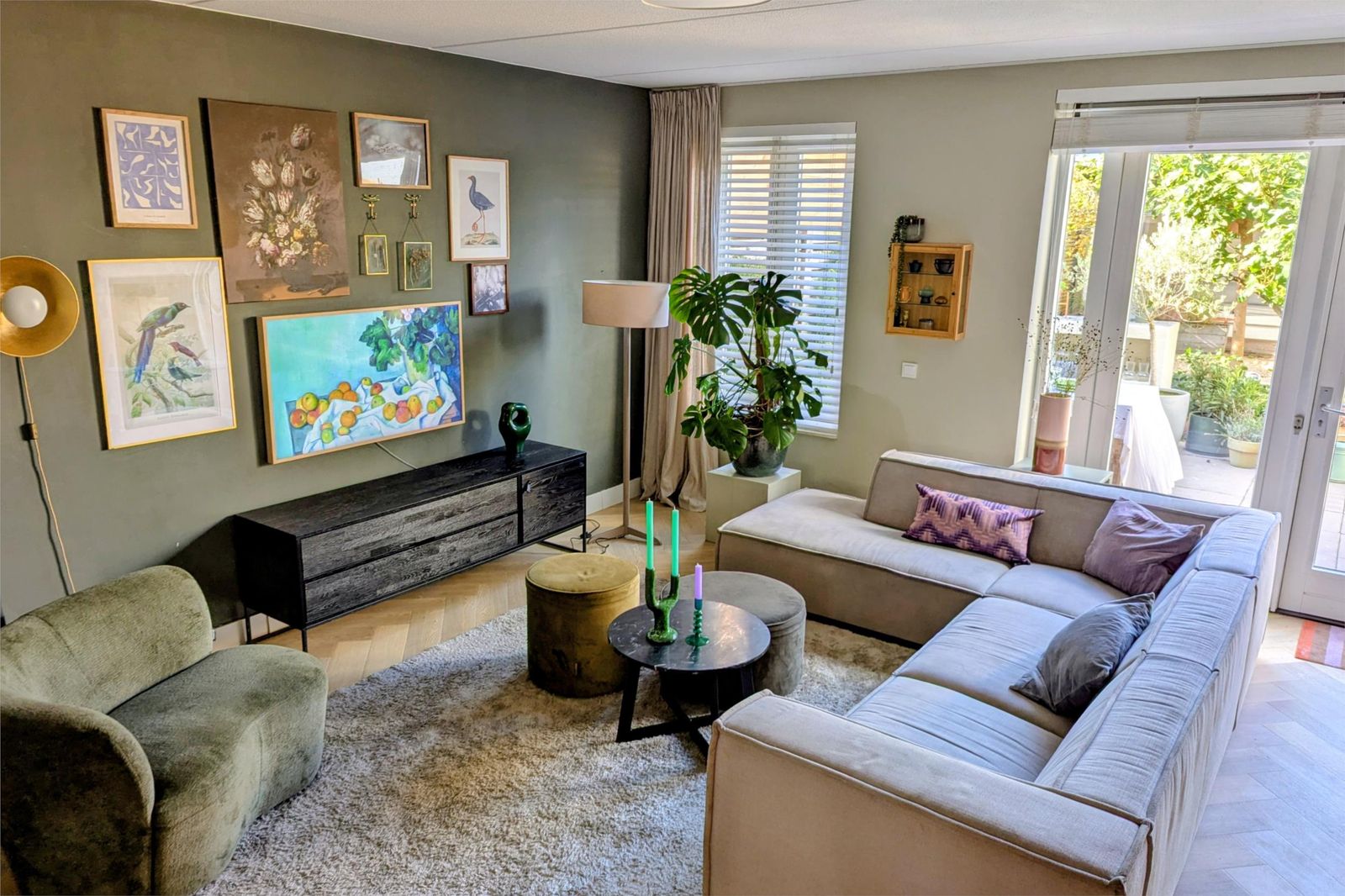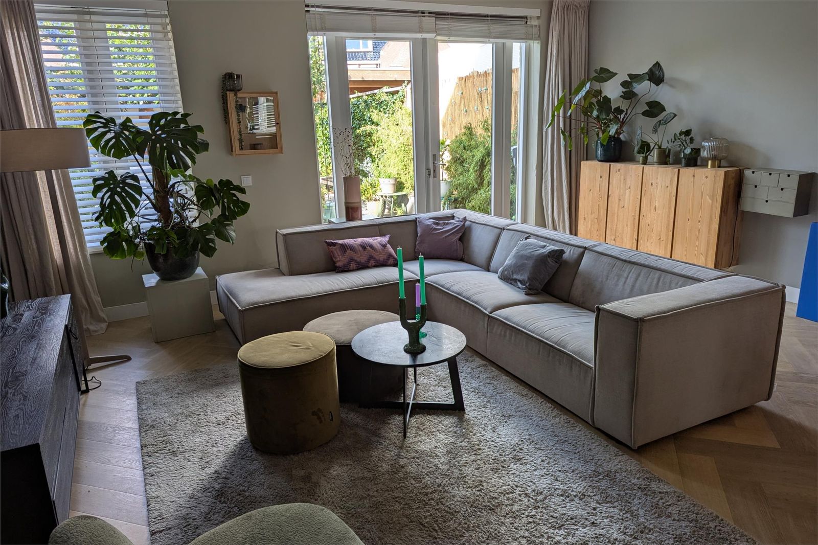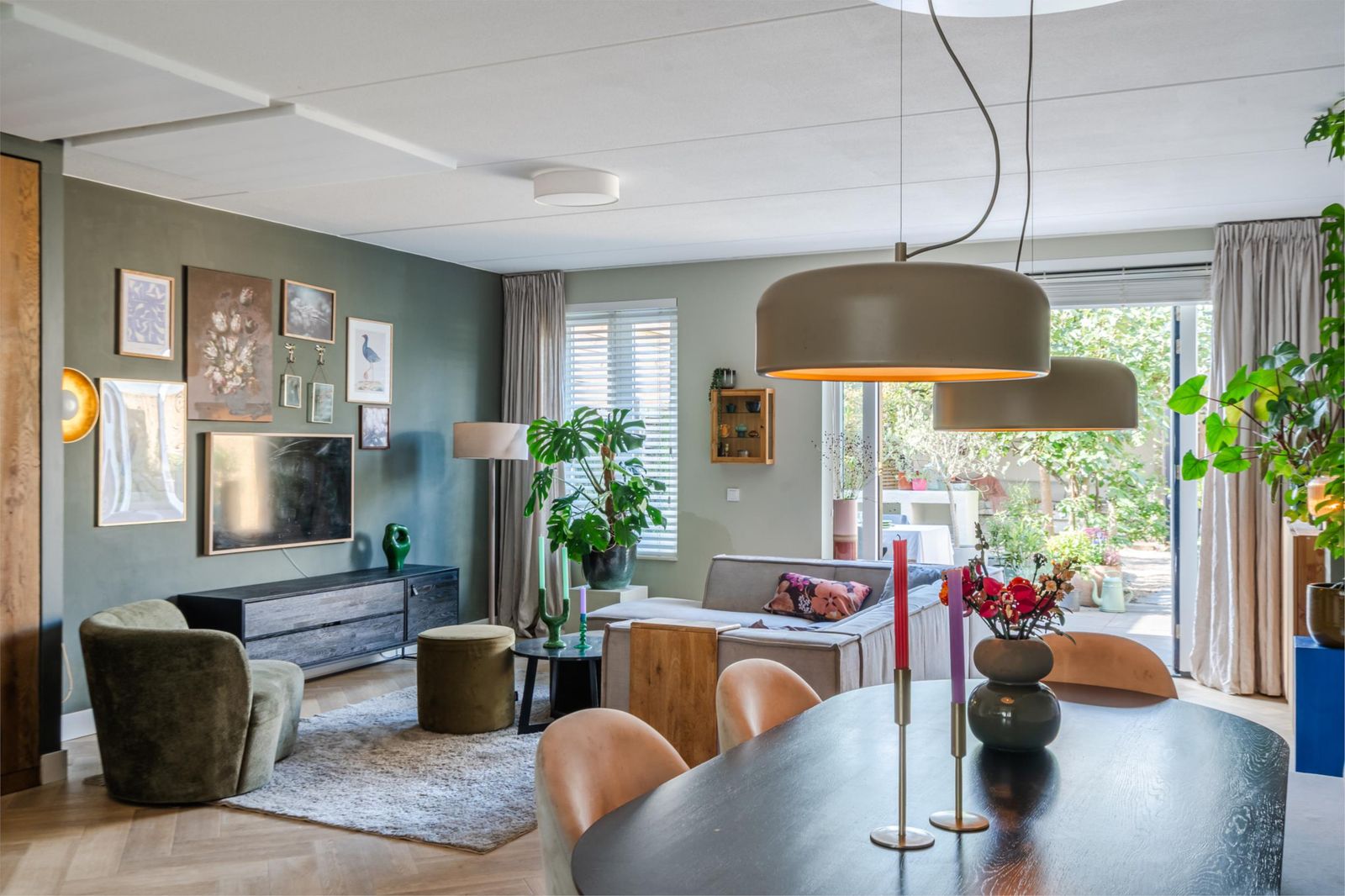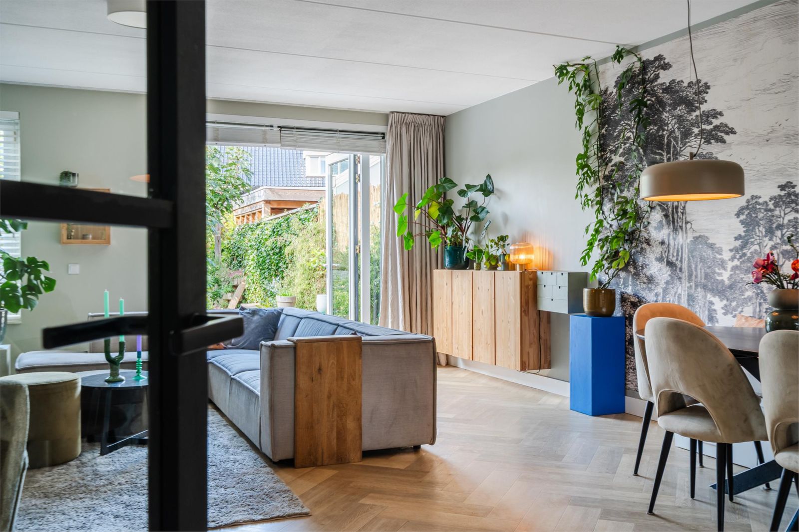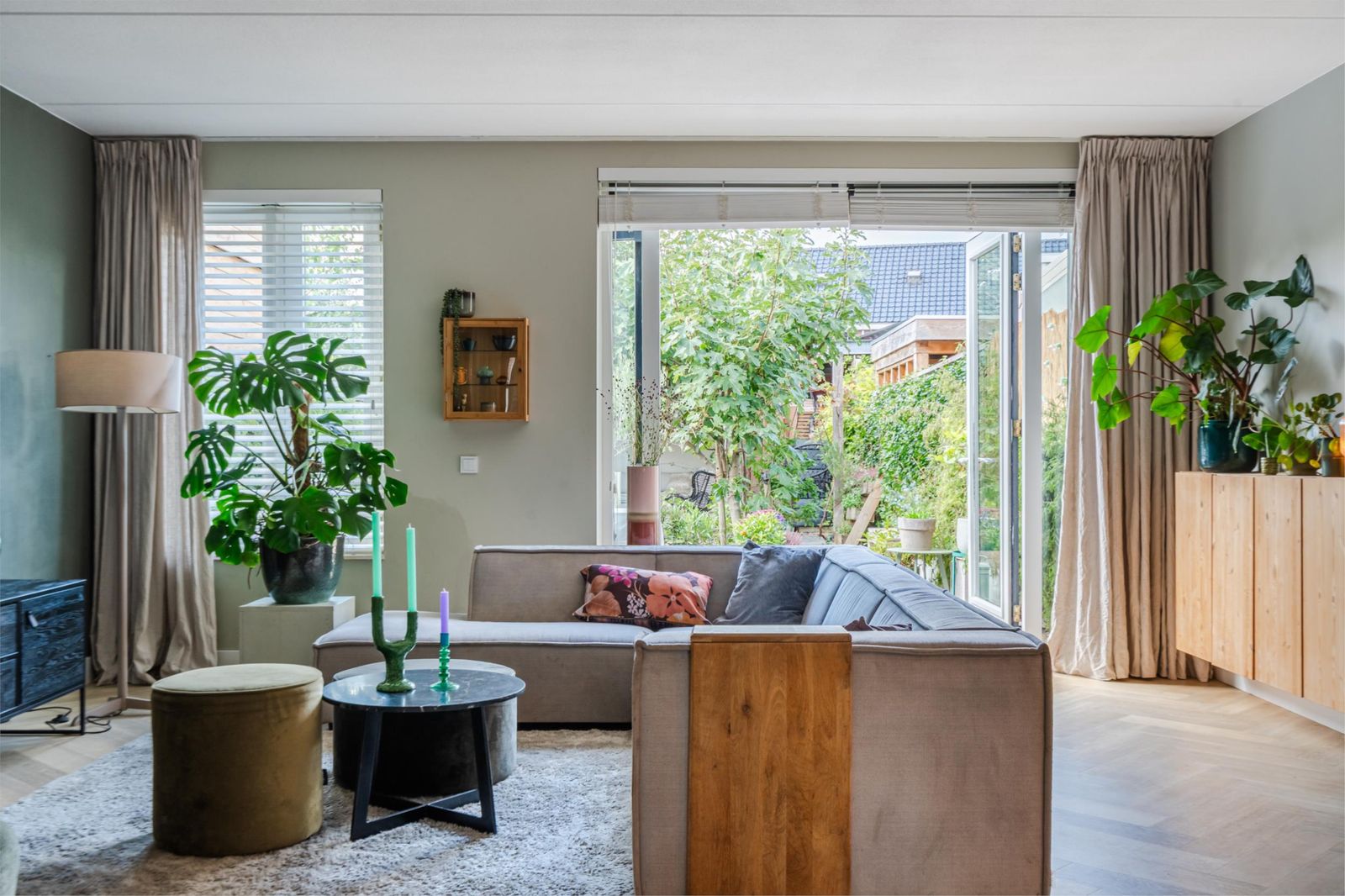 De woonkamer, met hoge plafonds van 2.65m, is door de uitbouw heerlijk ruim en de openslaande tuindeuren zorgen voor zicht op de mooie groene tuin.