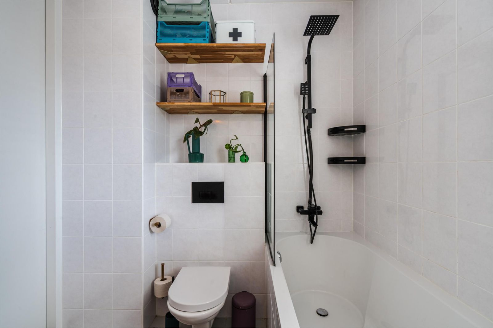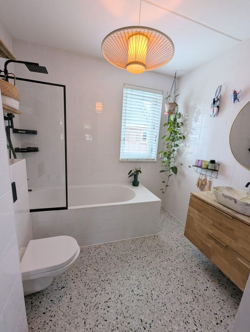 De frisse lichte badkamer is volledig betegeld en heeft een bad met douche, een wasbak en een toilet.
