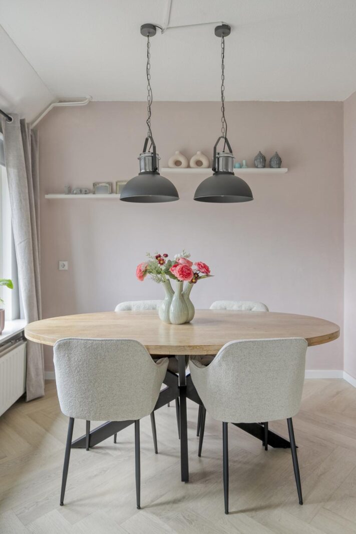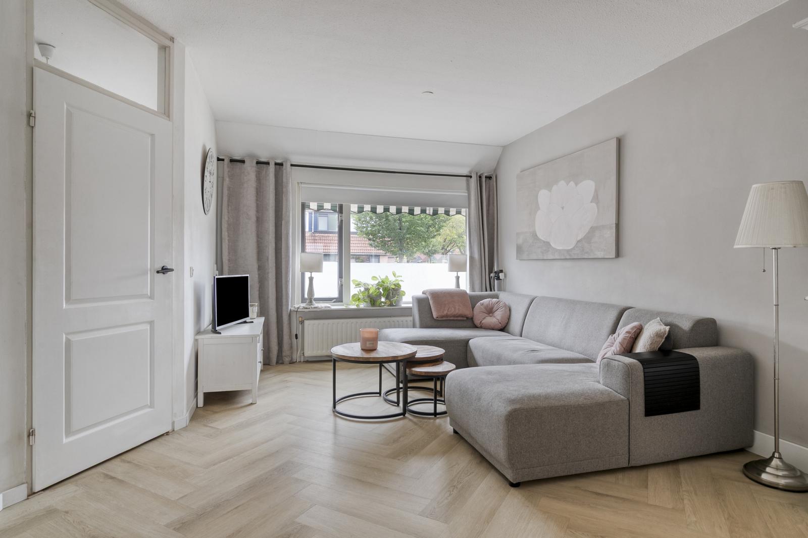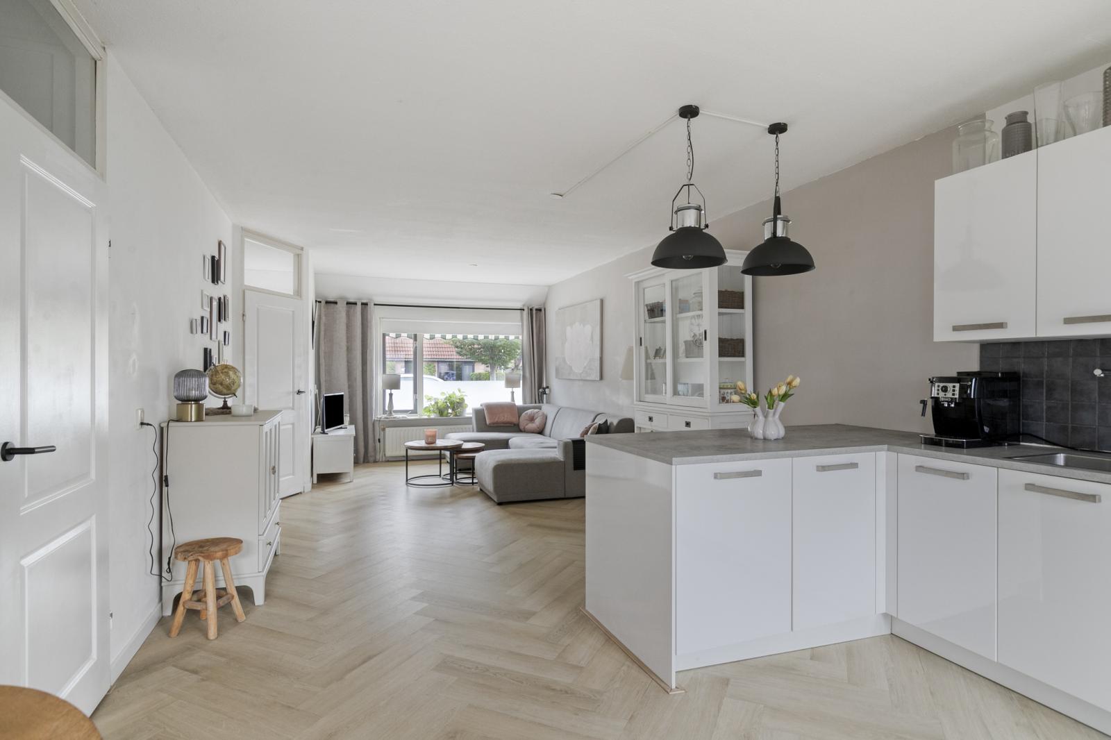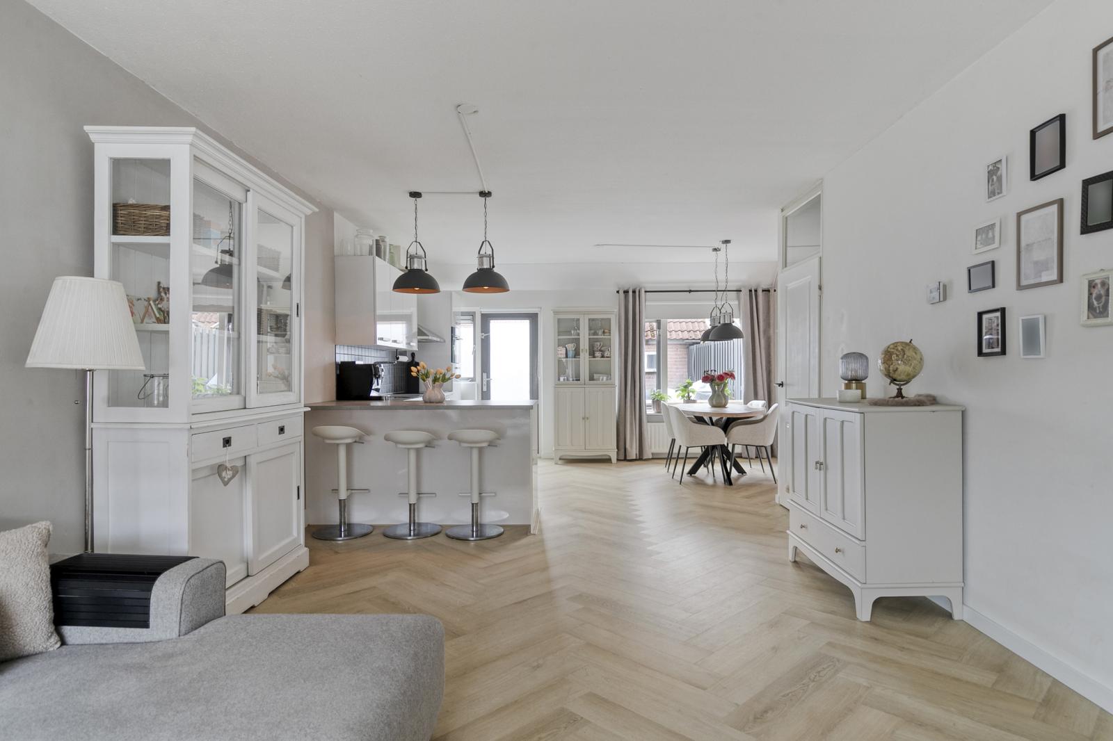 De woonkamer is verrassend ruim, licht en sfeervol. De moderne visgraat PVC vloer in lichte houtlook loopt door over de gehele begane grond, wat zorgt voor een mooi, ruimtelijk geheel. De combinatie van de lichte vloer, neutrale wanden en de flinke raampartijen zorgt voor een frisse, eigentijdse uitstraling en een aangenaam gevoel van ruimte.