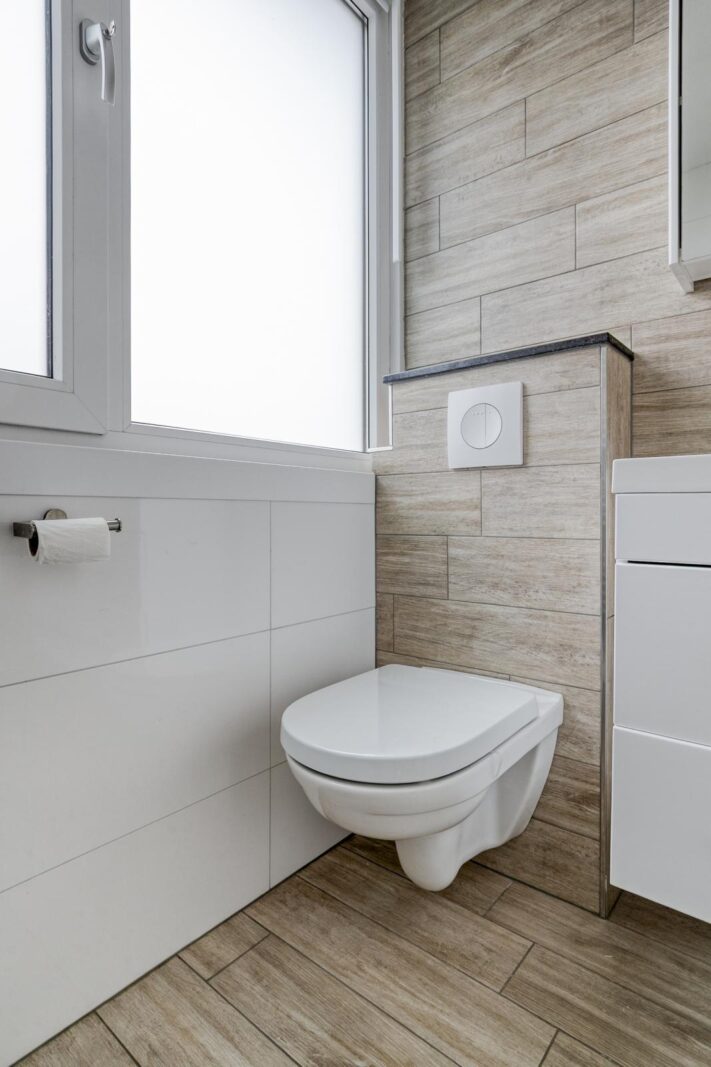 De betegeling in warme- en wittinten geeft de badkamer een stijlvolle, rustgevende uitstraling. De mechanische ventilatie is eenvoudig te bedienen via een afstandsbediening.