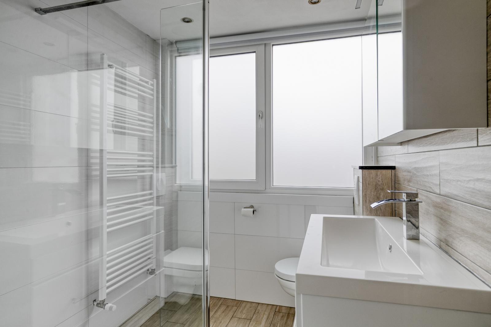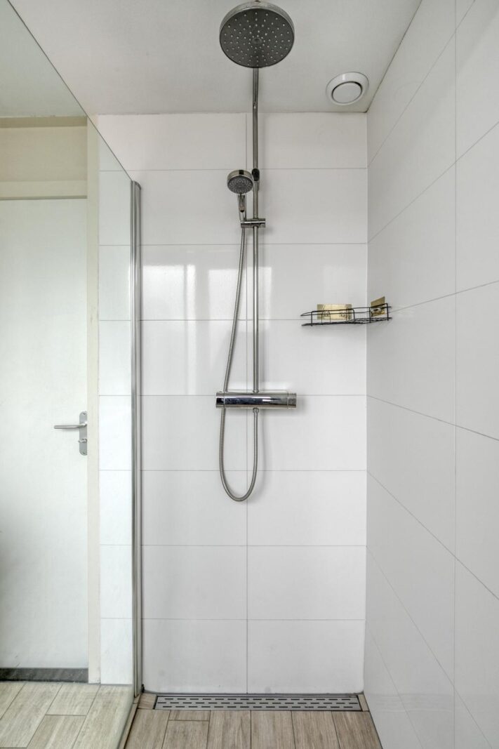 De badkamer is modern uitgevoerd en van alle gemakken voorzien. Hier vind je een ruime inloopdouche met regen- én handdouche, een zwevend tweede toilet, een wastafelmeubel met veel opbergruimte en een grote spiegelkast.