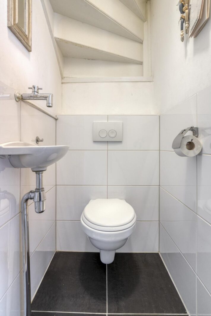 Het toilet bevindt zich in een apart halletje, bereikbaar via een deur in de woonkamer _ een praktische en nette oplossing.