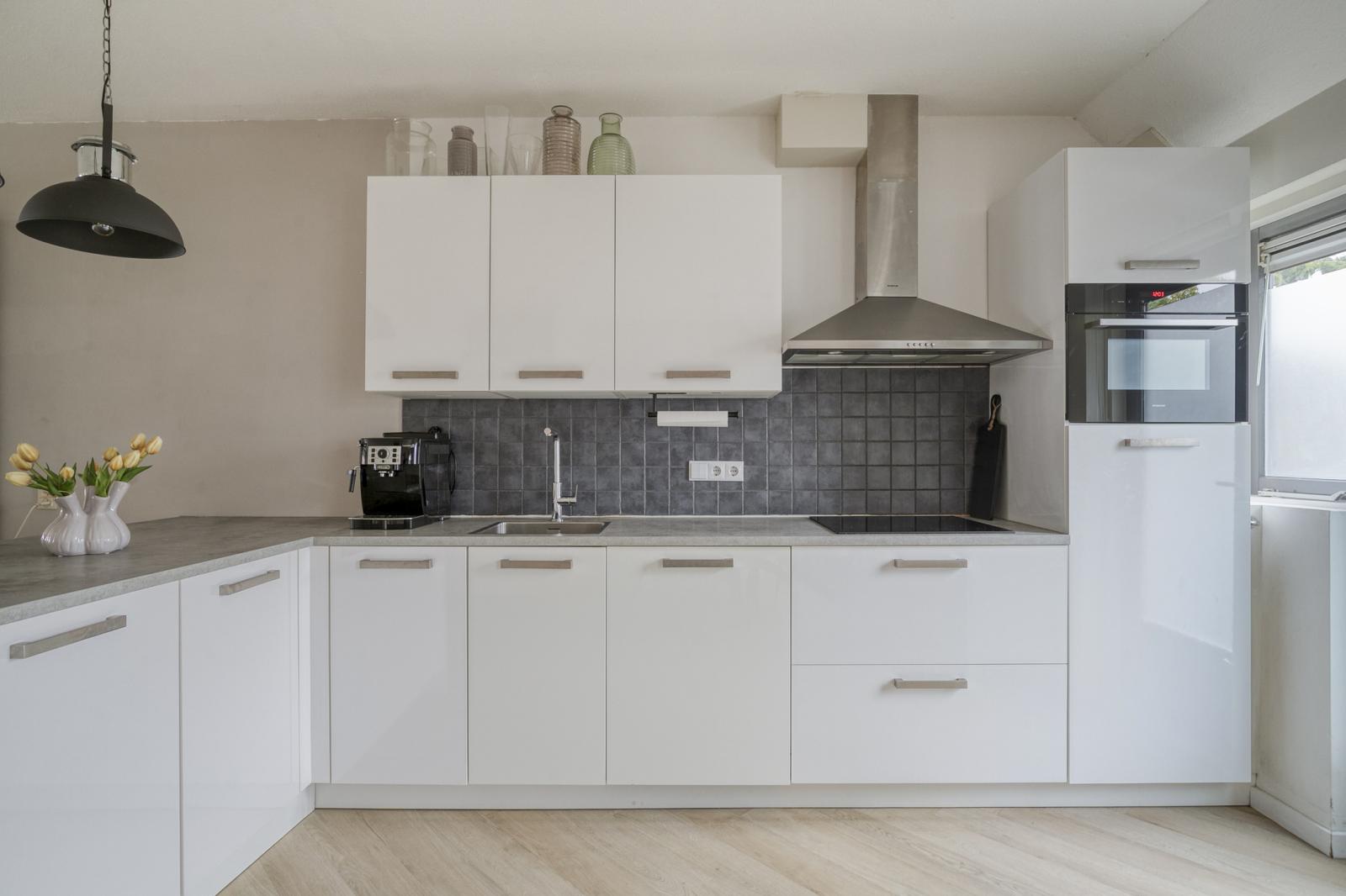 De keuken is opgesteld in een praktische L-vorm en voorzien van een gezellig barretje. Hierdoor ontstaat een natuurlijke scheiding tussen het kookgedeelte en de woonkamer, zonder het open karakter te verliezen. Er is bovendien nog ruimte genoeg voor een eettafel, waar gezellig getafeld kan worden met familie of vrienden.