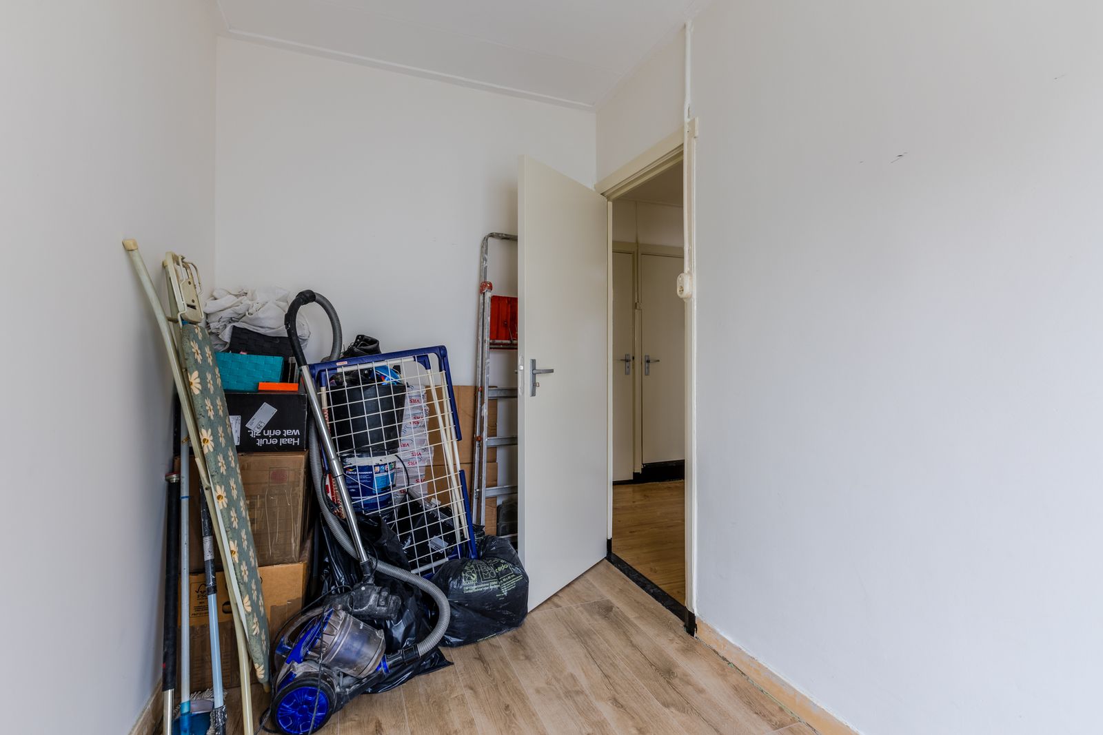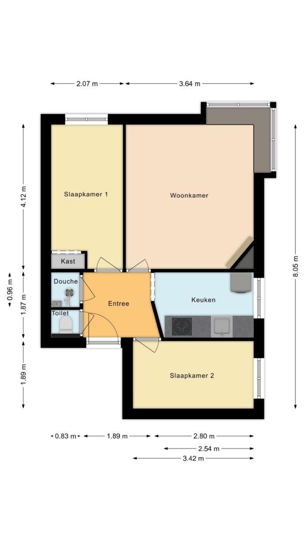 Het appartement beschikt over twee slaapkamers, ideaal als hoofdslaapkamer en bijvoorbeeld een werk-, logeer- of kinderkamer. De keuken is voorzien van een praktisch keukenblok en losse apparatuur. Daarnaast is er een aparte toiletruimte en een douche.