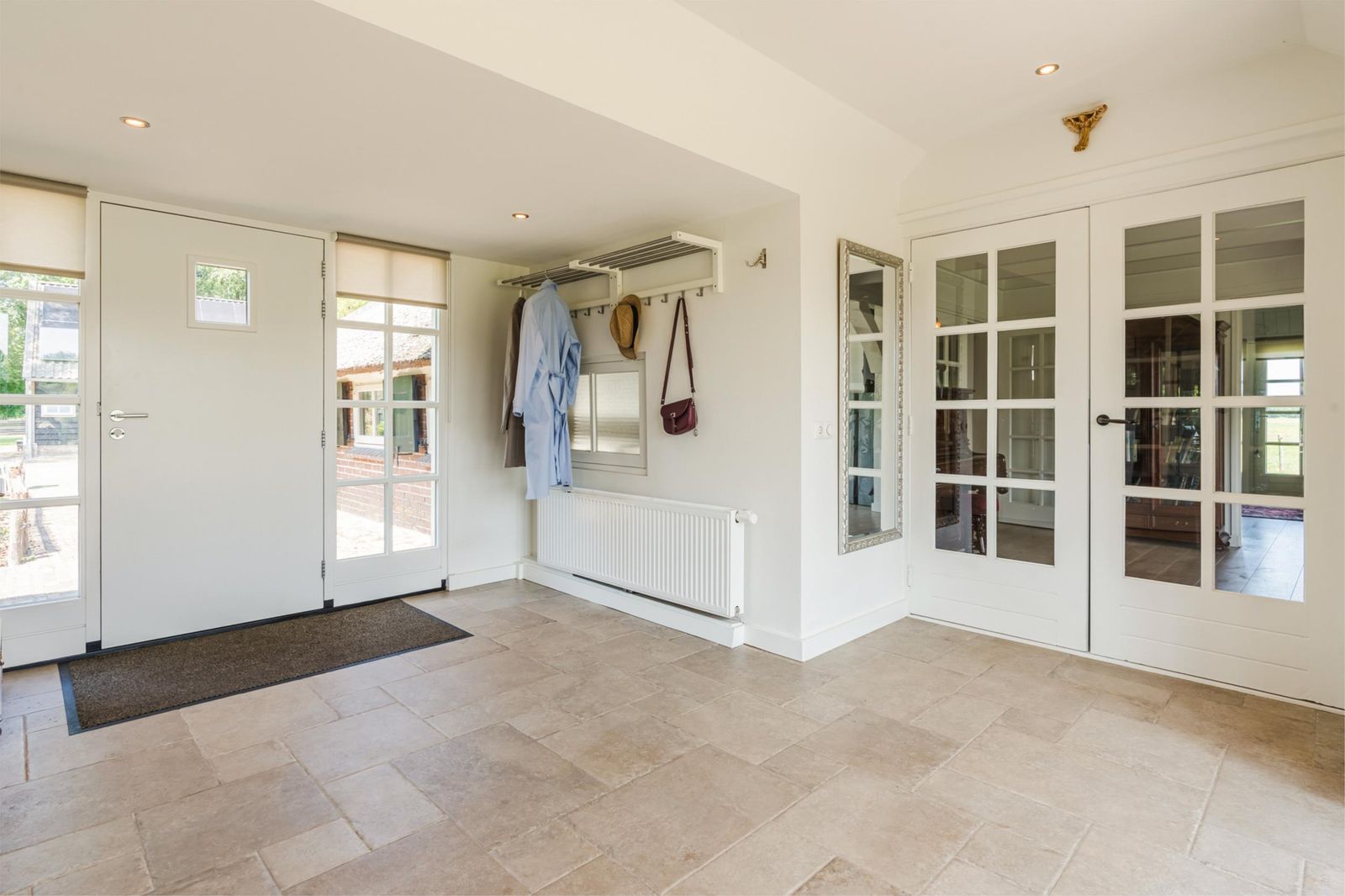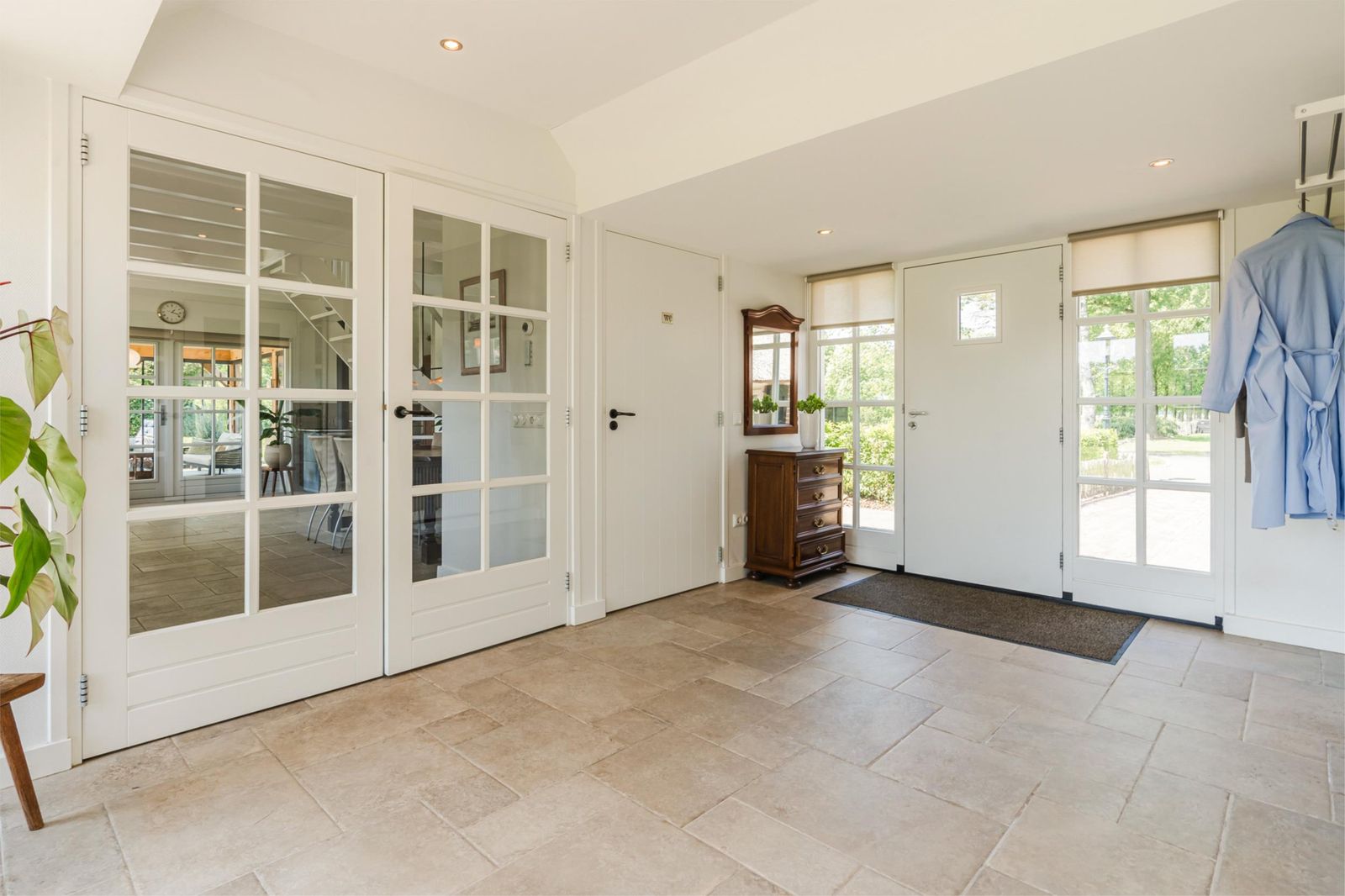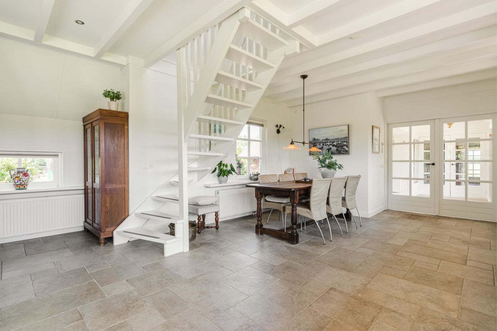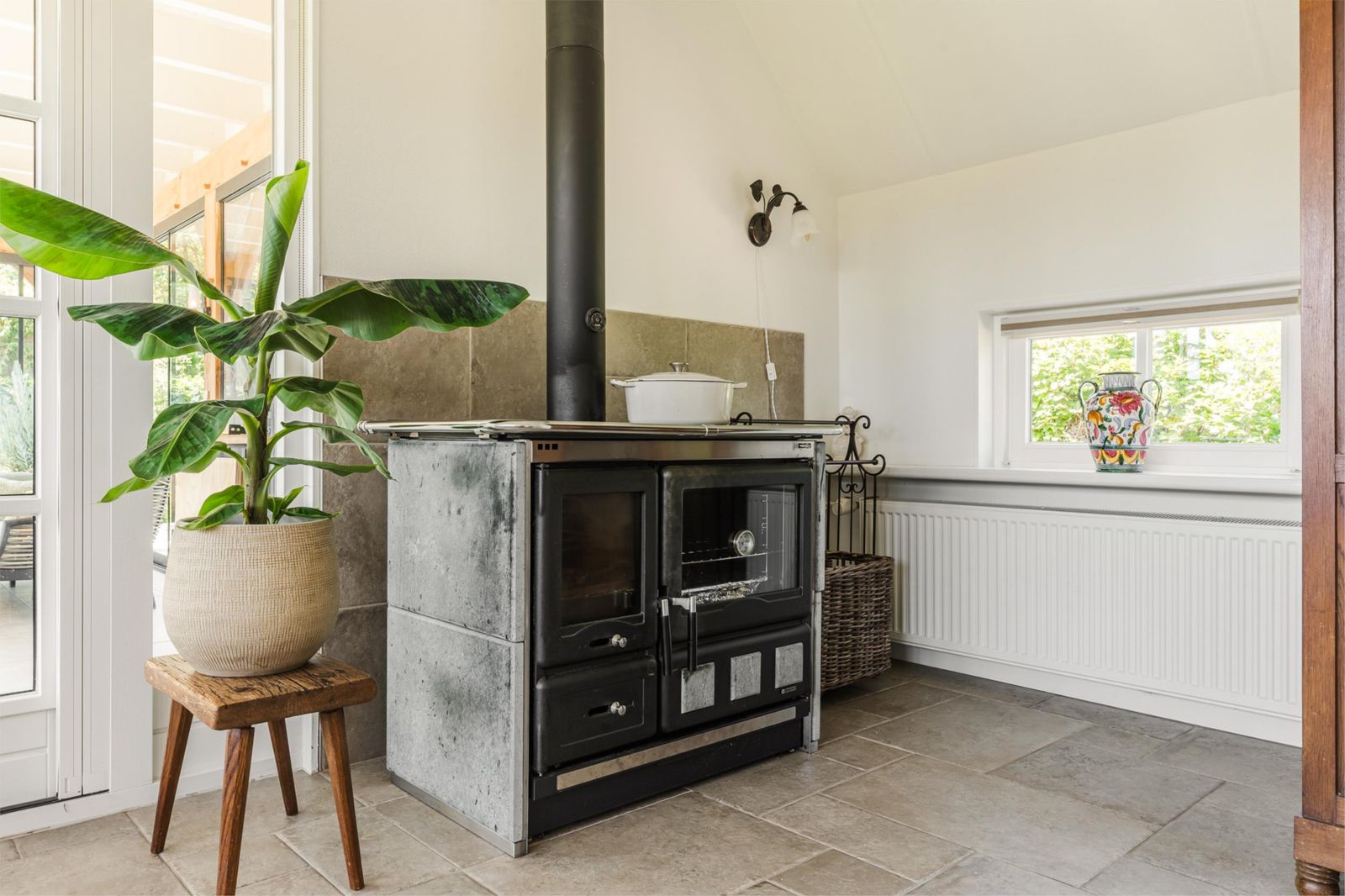 Aan de andere zijde van de entreehaal bevindt zich de zeer royale lichte landelijke woon- en leefkeuken kenmerkt zich door een lang en extra diep granieten aanrecht, Quooker, Boretti inductiefornuis én hout gestookt speksteenfornuis. Vanuit de keuken heb je een spectaculair op de tuin en de weilanden waar je niet zelden de reeën ziet grazen.