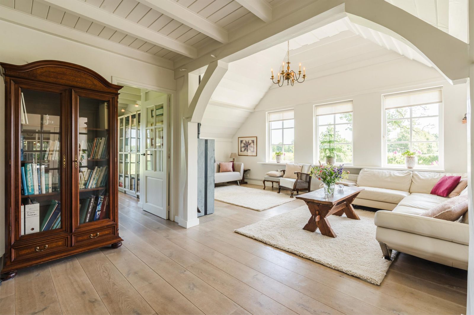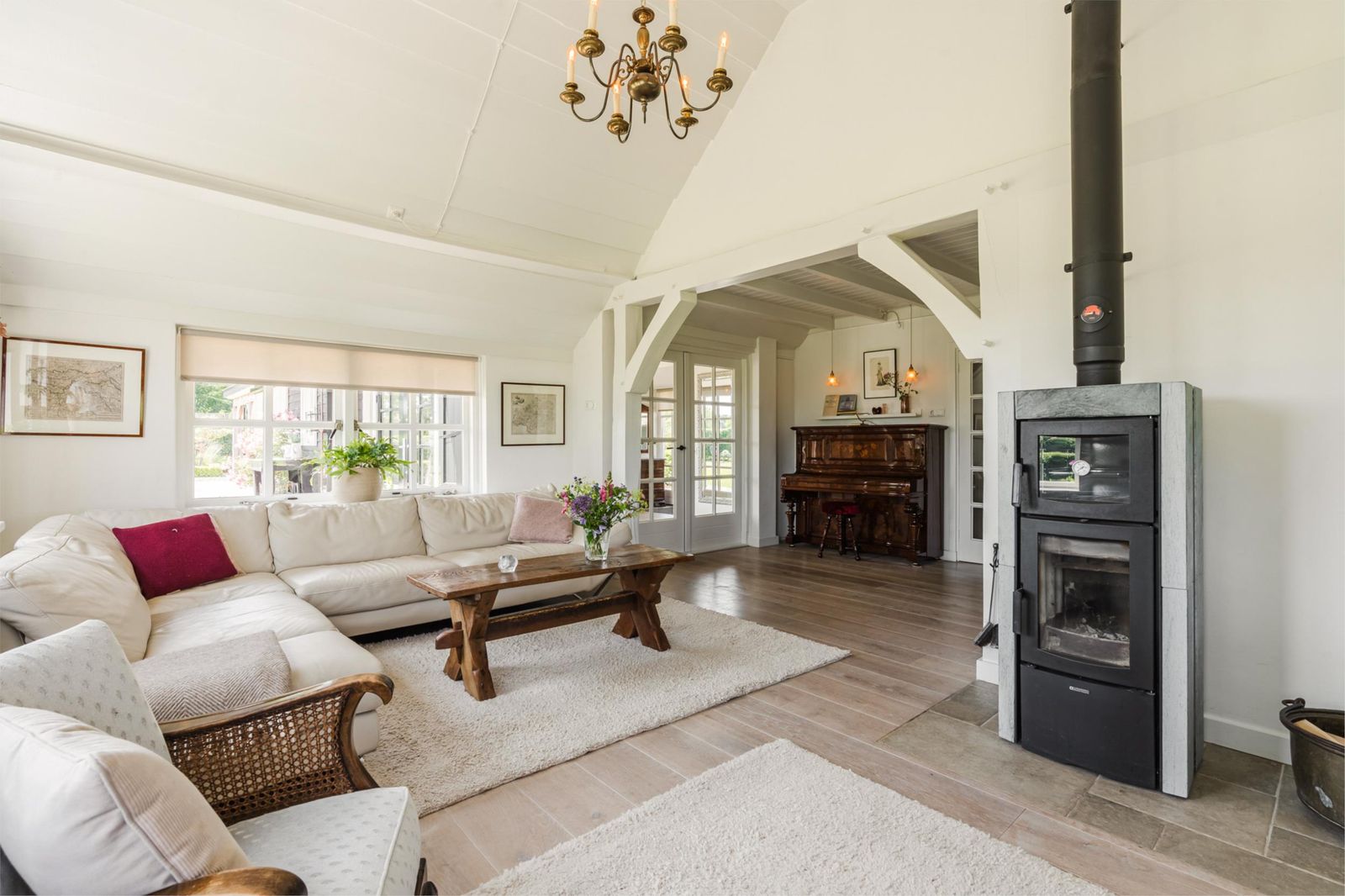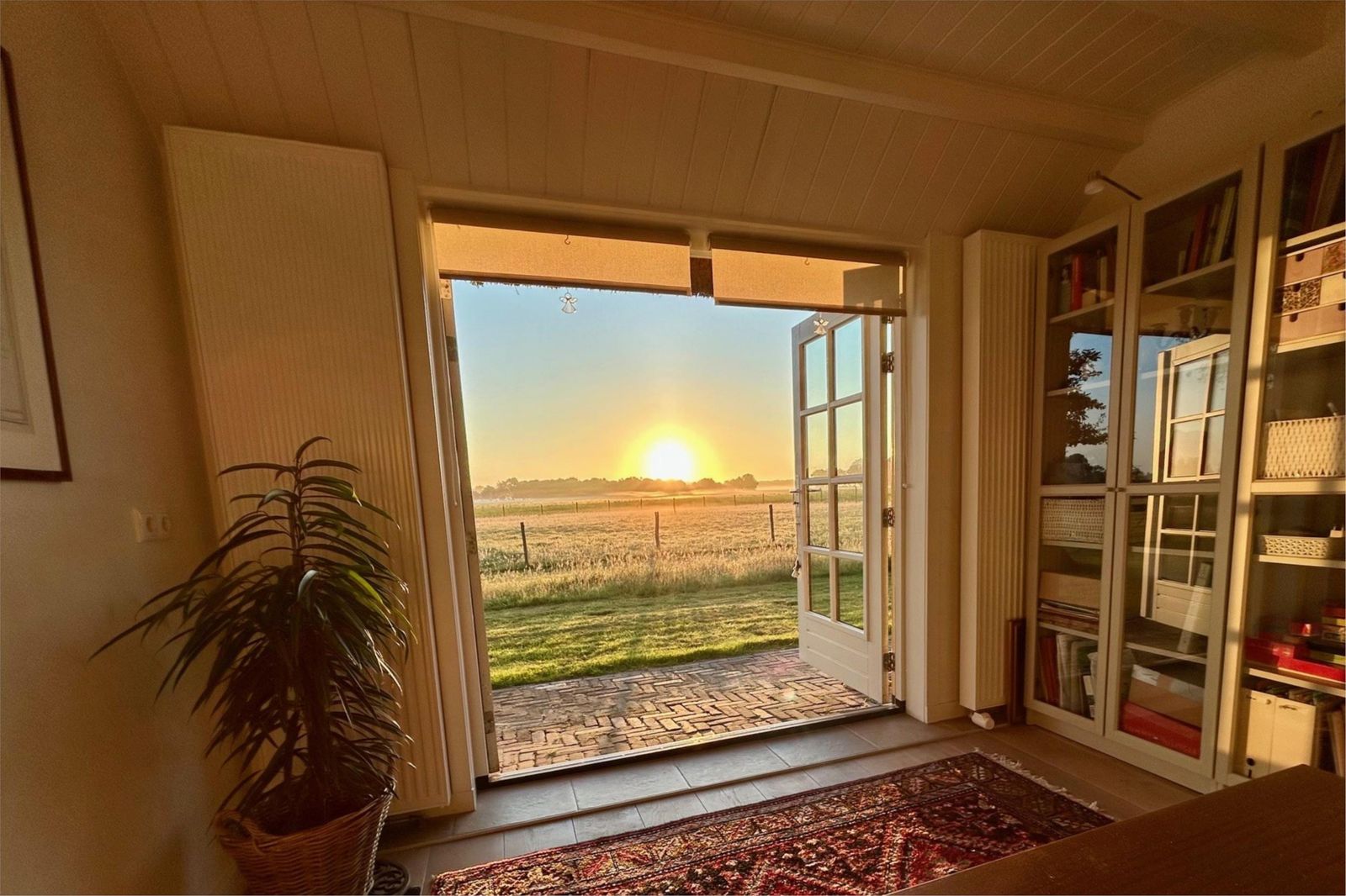 Woonkamer met uitzicht op de landerijen, eiken houtenvloer en speksteenhoutkachel met oven. Aangrenzend aan de woonkamer een werkkamer met openslaande deuren en vrij uitzicht.