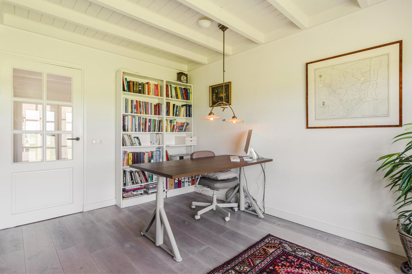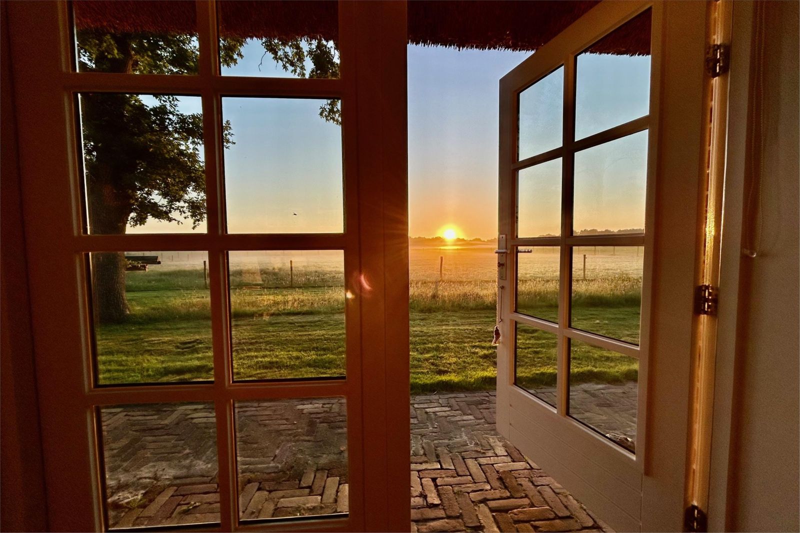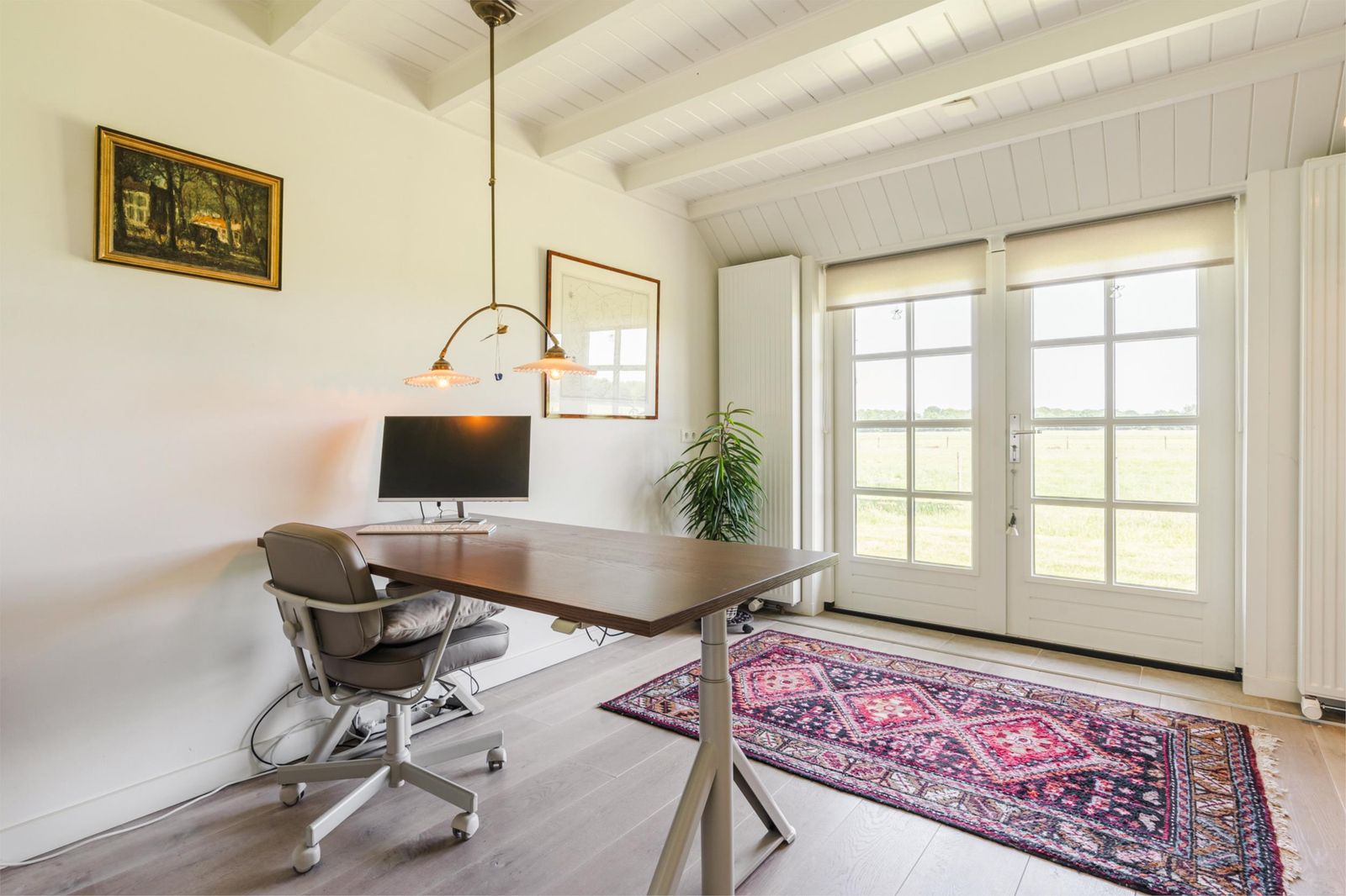 Woonkamer met uitzicht op de landerijen, eiken houtenvloer en speksteenhoutkachel met oven. Aangrenzend aan de woonkamer een werkkamer met openslaande deuren en vrij uitzicht.