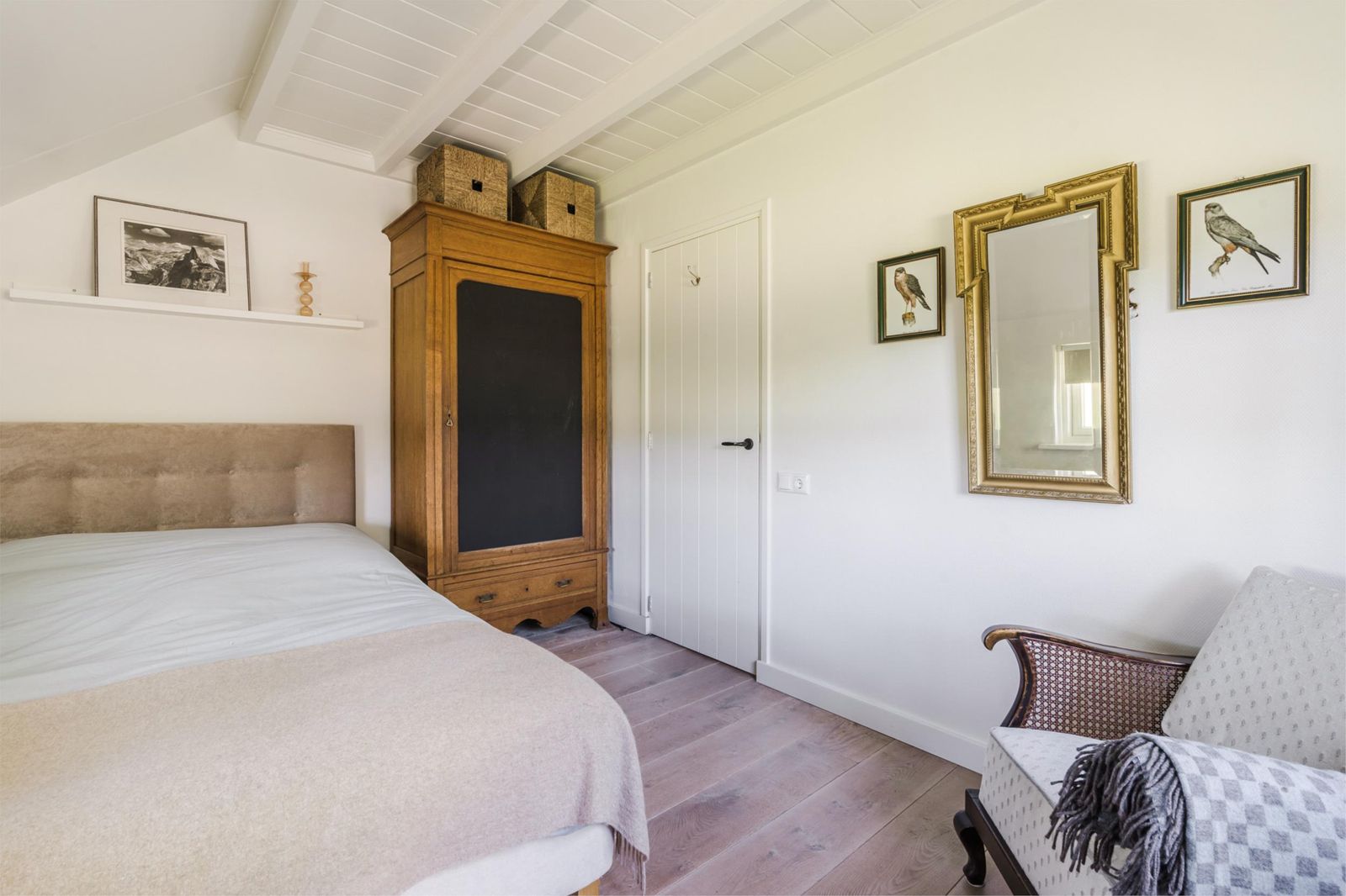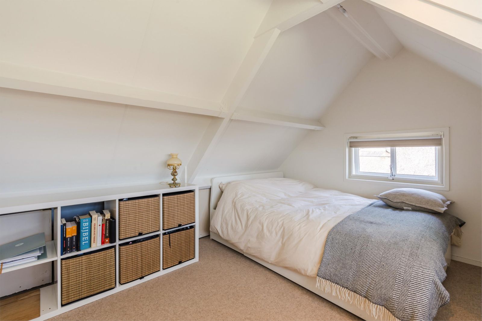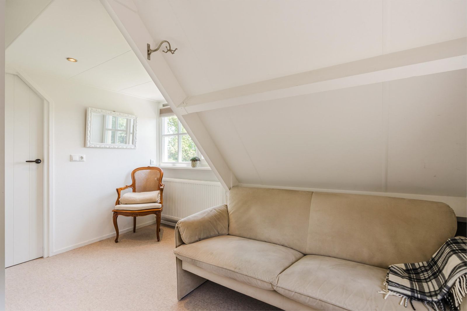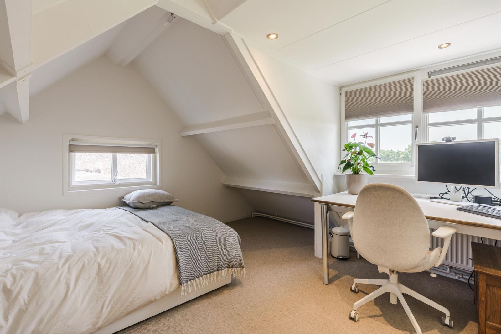 Op de tweede bovenverdieping (boven de keuken) een overloop en eveneens een slaap/werkkamer voorzien van een dakkapel. Het uitzicht is adembenemend met zicht op weiland en de natuurvijver. De verdieping is voorzien van (geiten)wollen vloerbedekking in lichte kleurstelling.