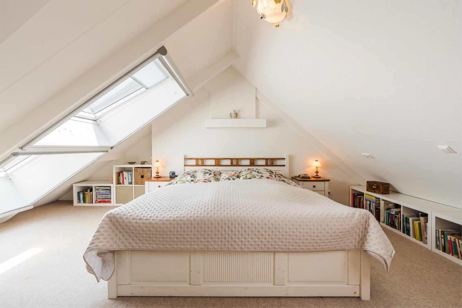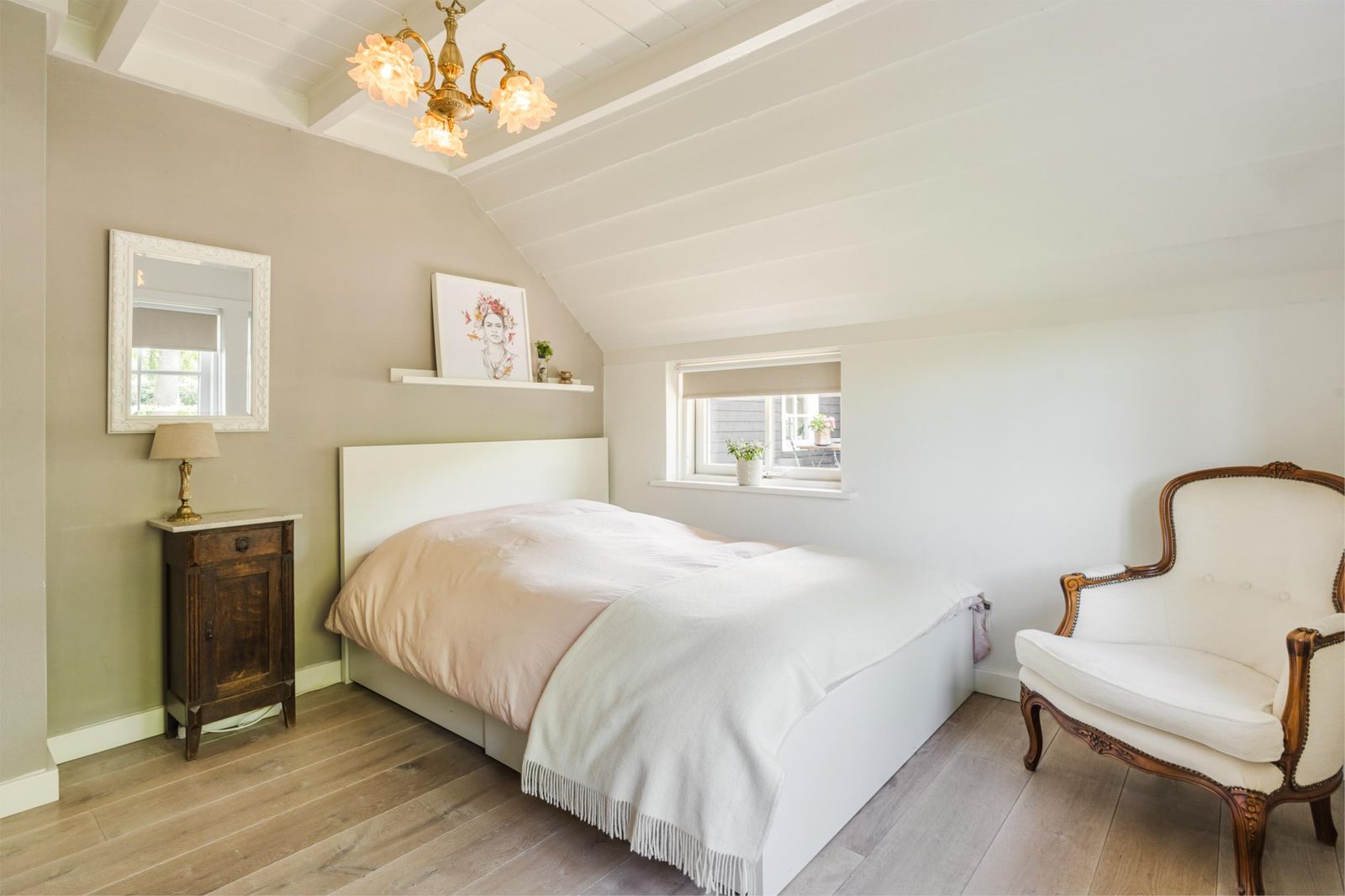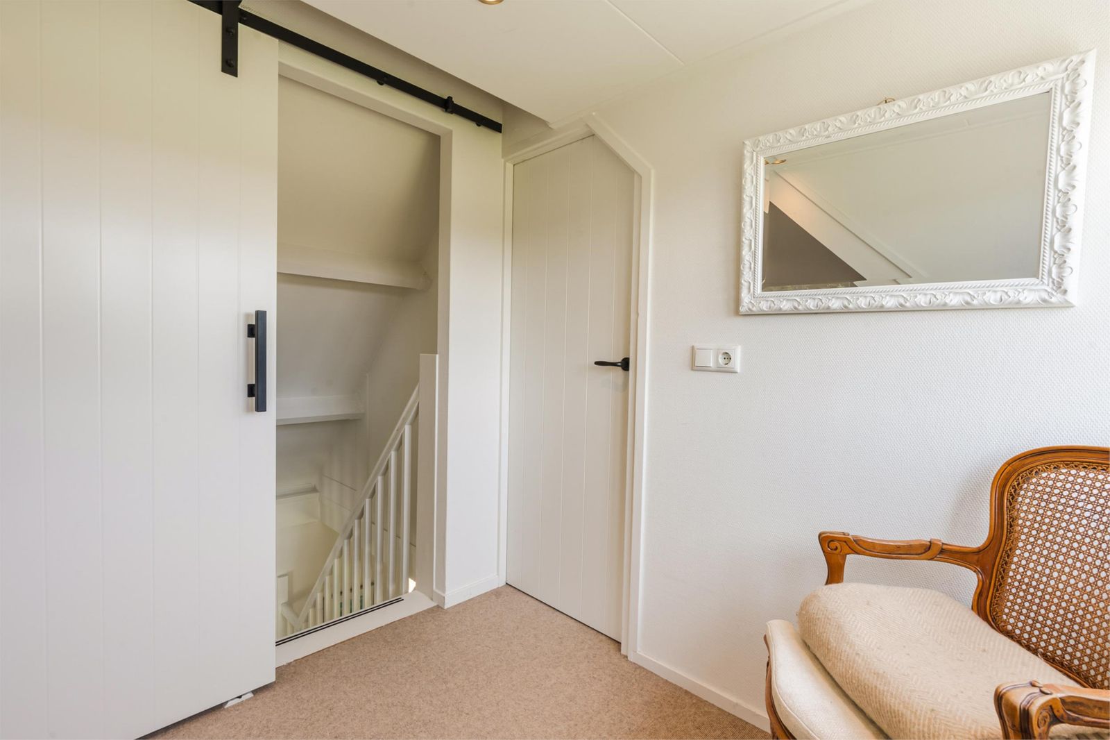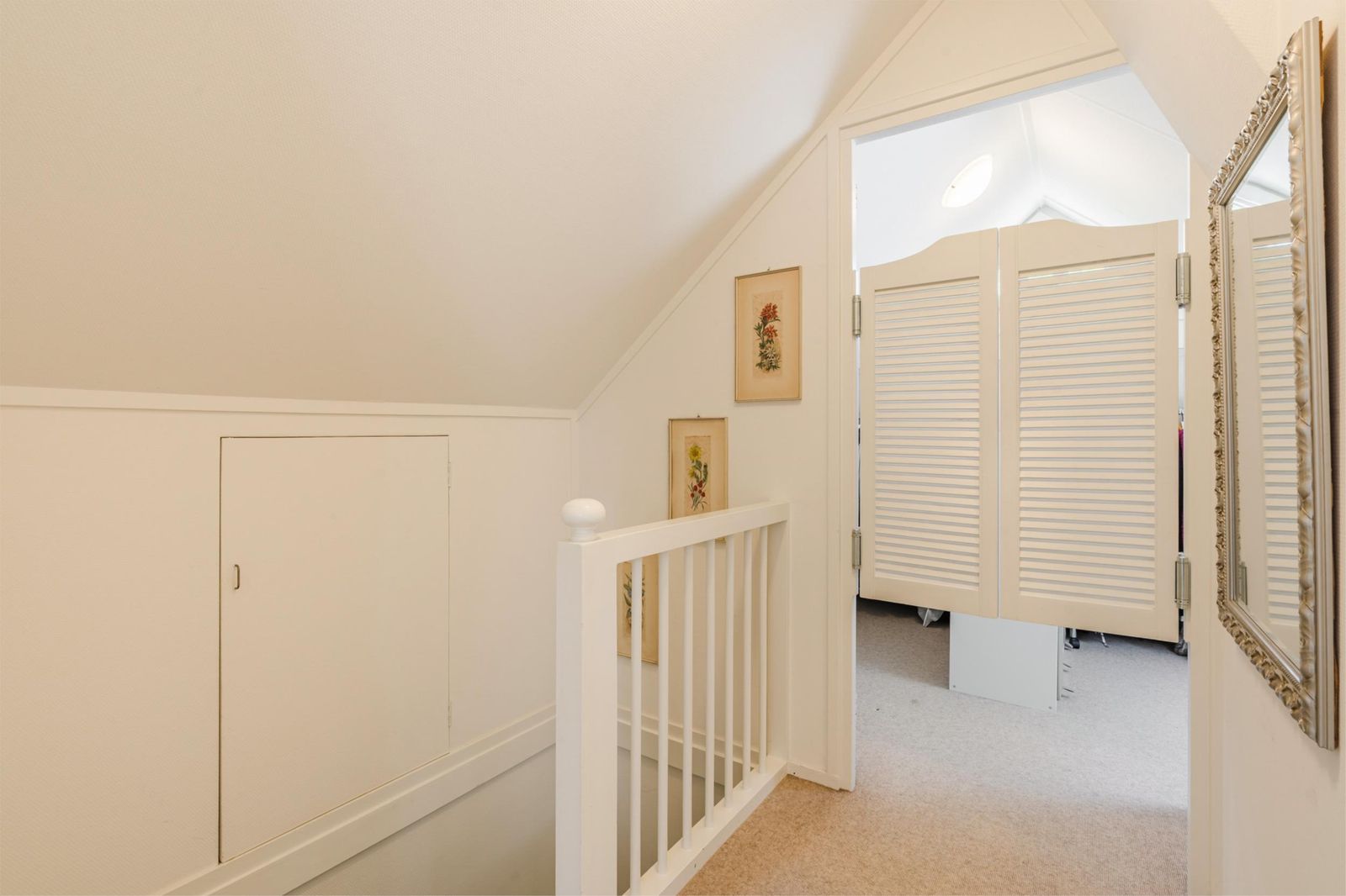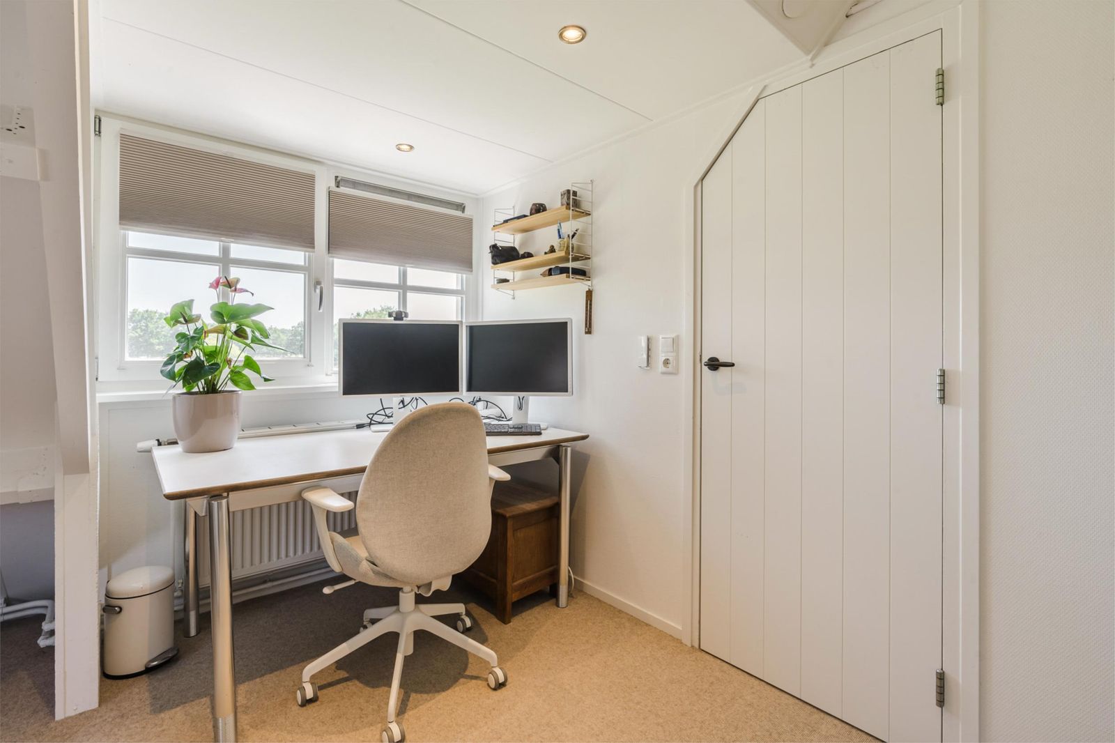Op de tweede bovenverdieping (boven de keuken) een overloop en eveneens een slaap/werkkamer voorzien van een dakkapel. Het uitzicht is adembenemend met zicht op weiland en de natuurvijver. De verdieping is voorzien van (geiten)wollen vloerbedekking in lichte kleurstelling.