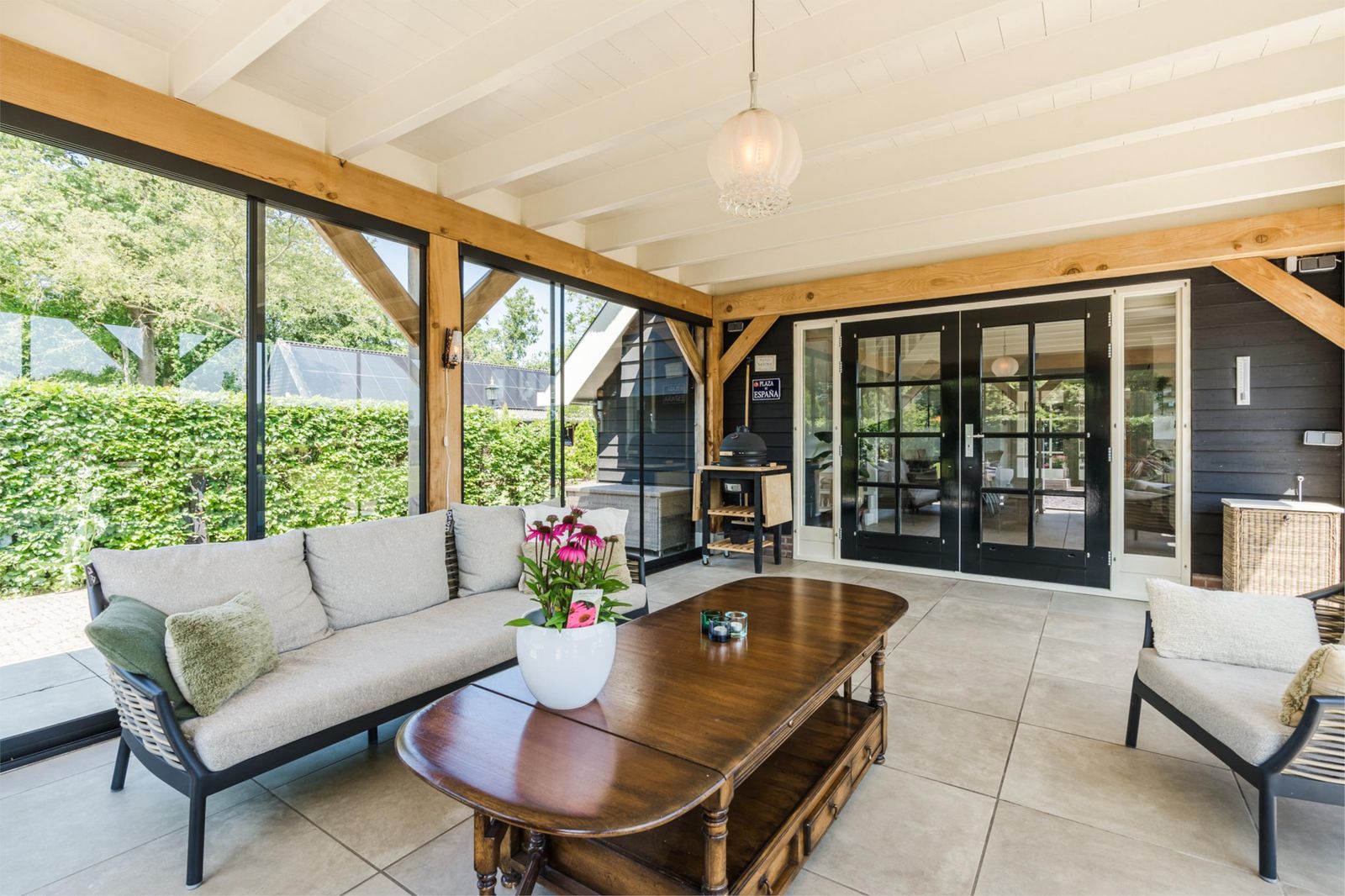Via de openslaande deuren in de keuken bereik je een prachtige en ruime serre met schuifdeuren rondom en houtkachel met oven, waardoor je hier alle seizoenen kunt verblijven.