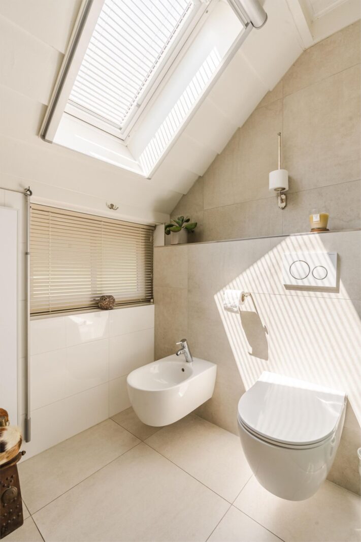 Via dubbele deuren is de woonkamer verbonden met de gang waaraan twee slaapkamers, badkamer en bijkeuken zijn gelegen. Badkamer in lichte kleurstelling op de begane grond met vloerverwarming, ruime inloopdouche, zwevend toilet, dubbele wastafel, en bidet. Tegenover badkamer ligt (in dezelfde kleurstelling) de bijkeuken met aanrechtblad spoelbak, wasmachineaansluiting en mogelijkheden voor voorraden en opslag. Tot slot aan het einde van de gang, twee sfeervolle slaapkamers met eikenhouten vloeren.