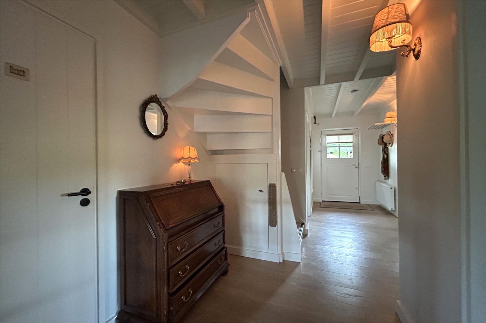Royale en lichte centrale hal met openslaande deuren naar de achterzijde en terrassen. De hal verbind met aan weerszijde dubbele deuren, de oude boerderij met de voormalige schuur die verbouwd is tot woonkeuken. Toiletruimte met zwevend toilet met wastafel (koud en warm water).