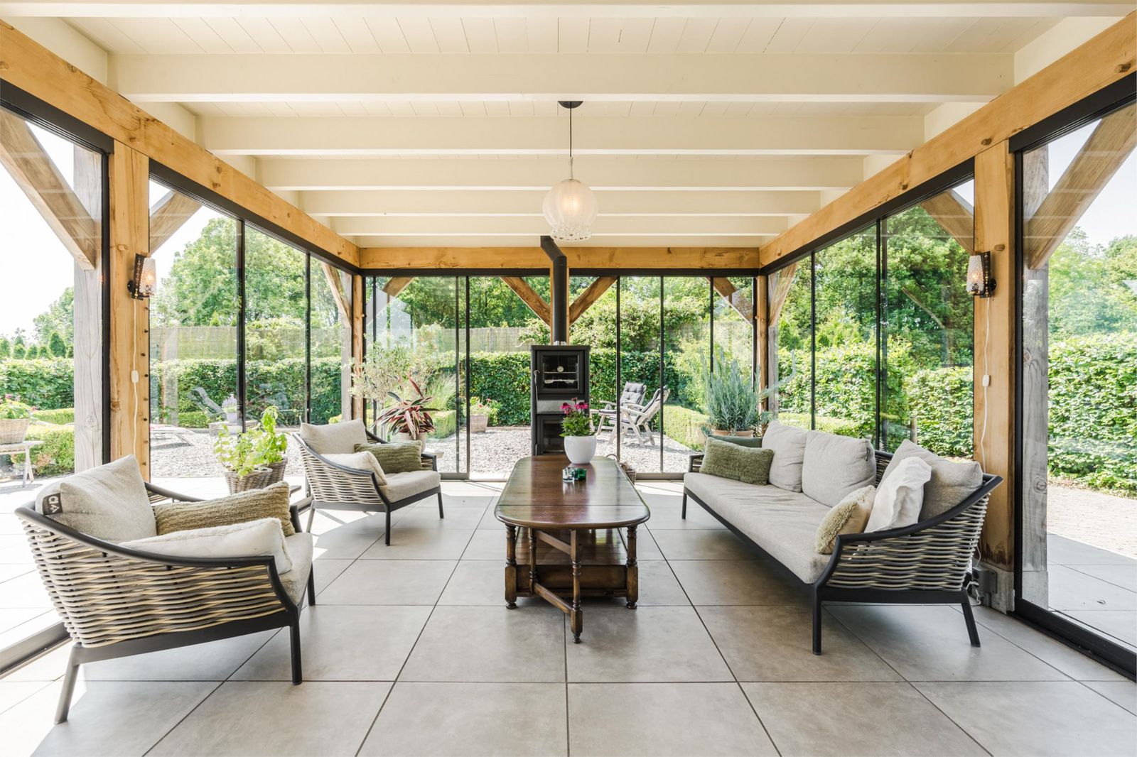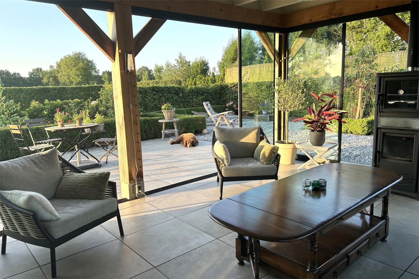Hier beleef je het buitenleven met alle comfort, in alle seizoenen door de aanbouw van een prachtige serre (2020) met speksteen houtkachel (incl. oven) waar je zelfs in de winter tussen glazen schuifdeuren en knapperend haardvuur geniet van uitzicht op reeën, vogels en weidse luchten. Meerdere terrassen bieden altijd een plek in de zon of juist verkoelende schaduw. Of je nu ’s ochtends geniet van koffie in de serre of ’s avonds in stilte naar de sterren kijkt – hier leef je met het ritme van de natuur. Het hoofdterras, grenzend aan de serre, beschut door hagen, is op het zuiden gelegen. De onderhoudsluwe tuin is voorzien van een eigen bron en biedt volop ontwikkelmogelijkheden.