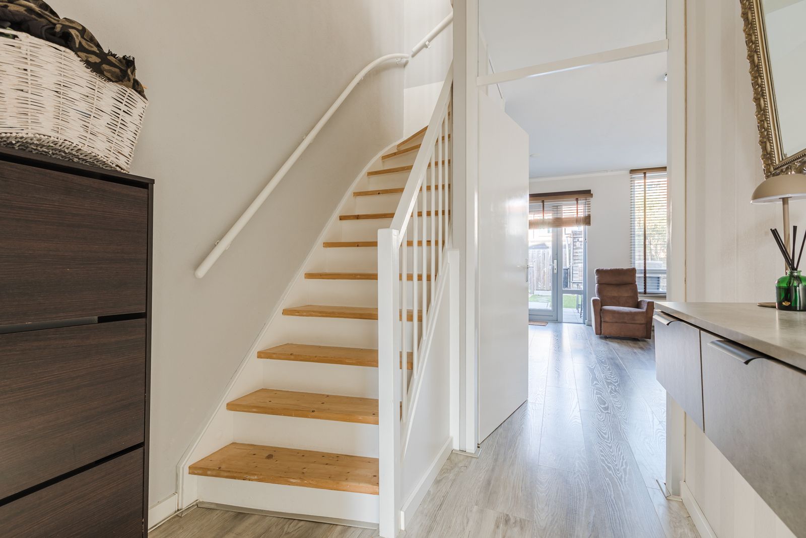 Begane grond: Entree in hal met meterkast, vernieuwde toiletruimte (2023) voorzien van een hangend toilet en fonteintje, en trapopgang. De woonkamer heeft aan de voorzijde een moderne open keuken met diverse inbouwapparatuur, waaronder een inductiekookplaat, koelkast, vriezer, oven en vaatwasser. De tuingerichte woonkamer beschikt over een vaste kast en een deur naar de achtertuin. De woonkamer is voorzien van een laminaatvloer, terwijl de keuken is afgewerkt met plavuizen.