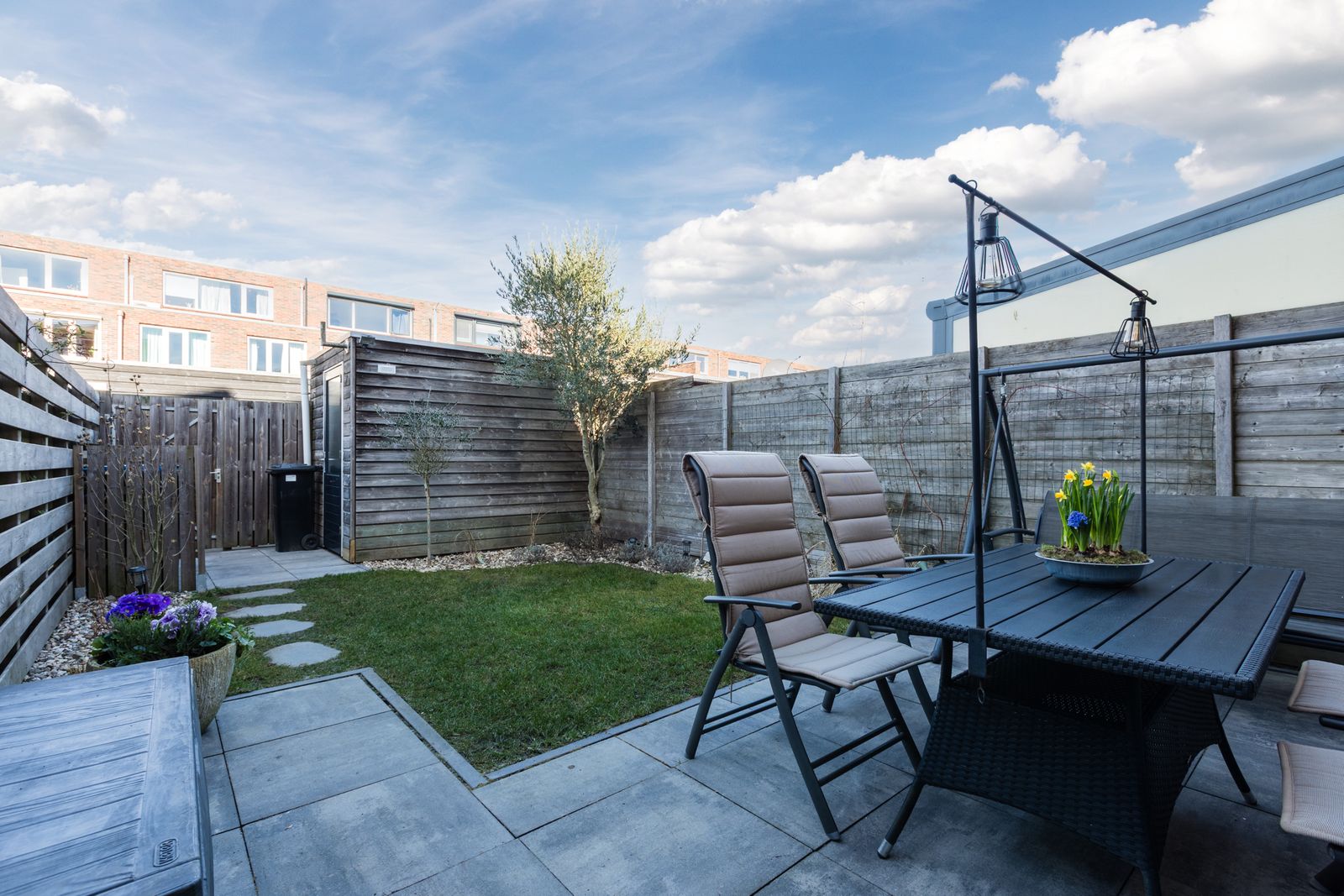 Buiten: De zonnige achtertuin is ruim en deels betegeld (de tegels zijn recent vernieuwd) en heeft een vrijstaande berging.