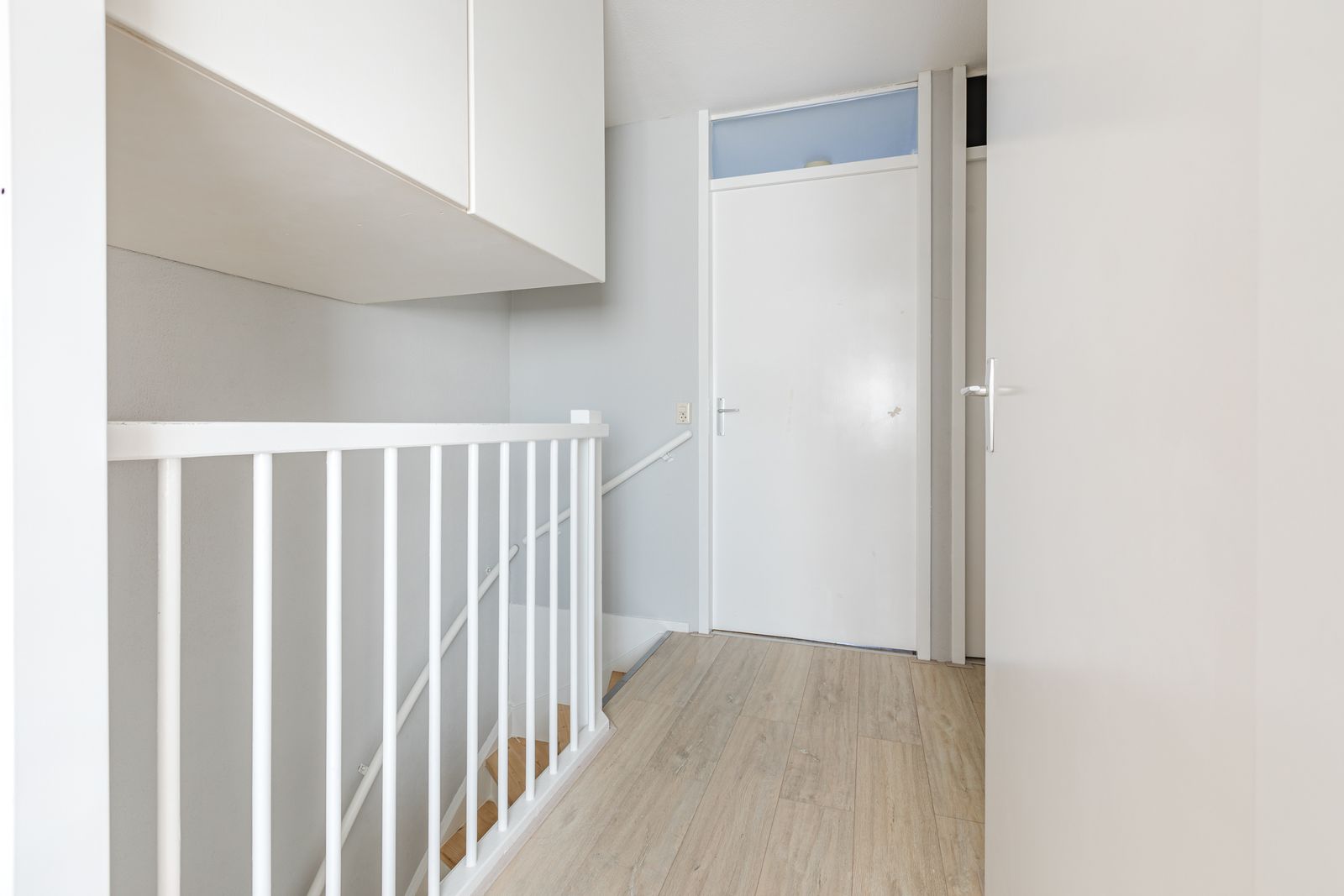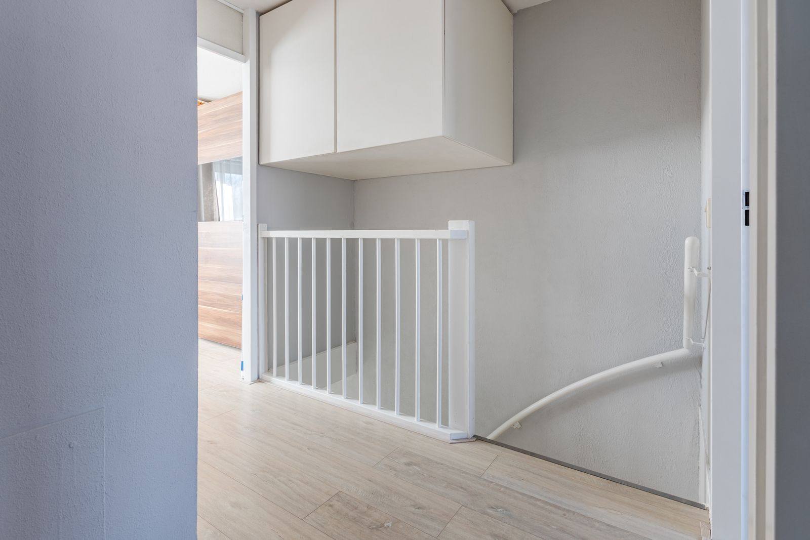 Eerste verdieping: Overloop met bergkast met opstelling CV ketel en balansventilatie-unit (beiden recent vervangen) en toegang tot drie slaapkamers. De verdiepingsvloer is voorzien van een laminaatvloer. De betegelde badkamer heeft een ligbad, toilet, wastafelmeubel en wasmachineaansluiting.