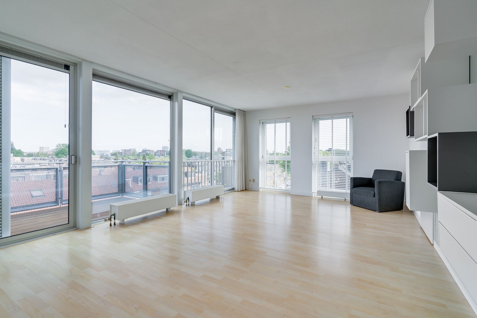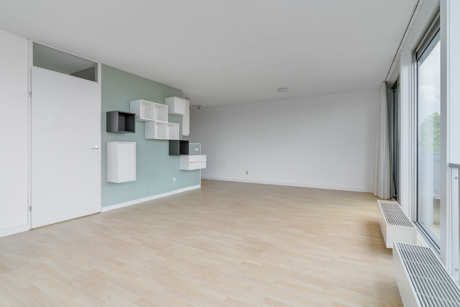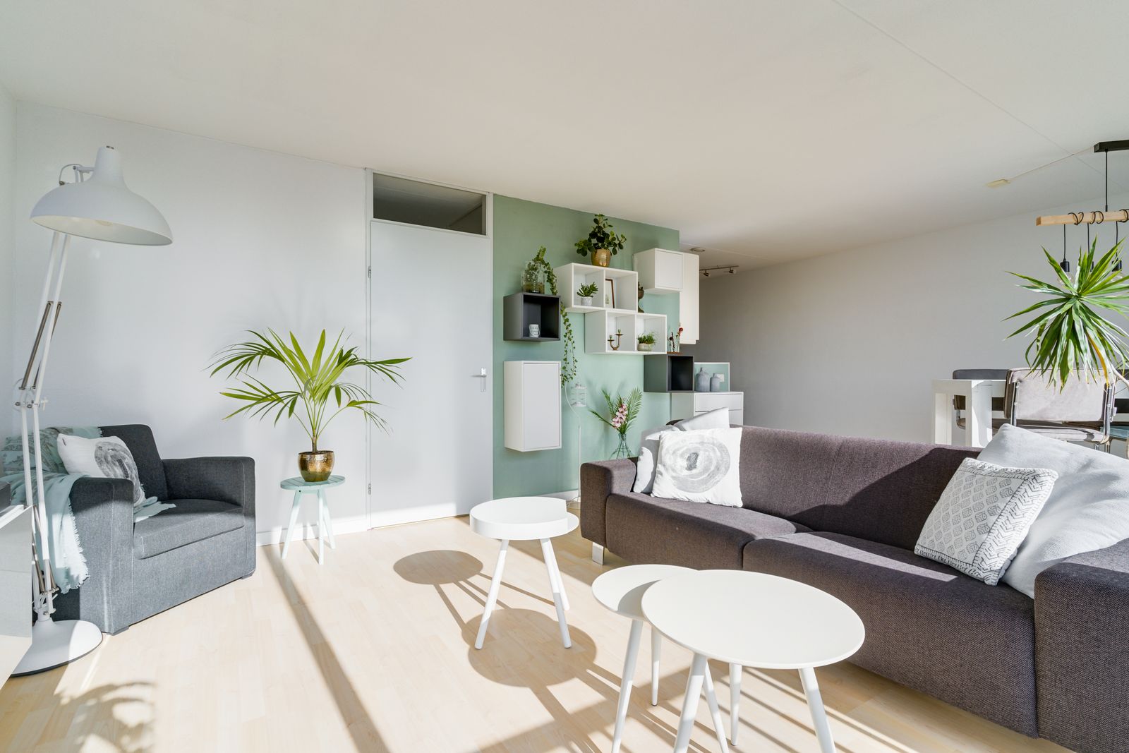 De woonkamer bevindt zich aan de achterzijde en biedt via de schuifpui toegang tot het balkon op het zuidoosten. Hier geniet je van veel lichtinval en een weids uitzicht over Utrecht.
