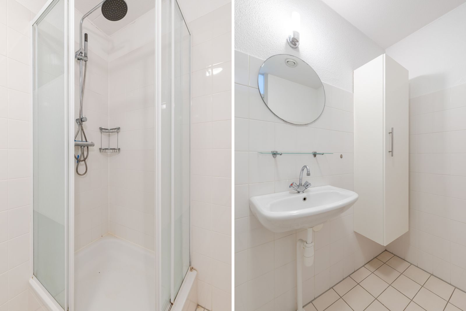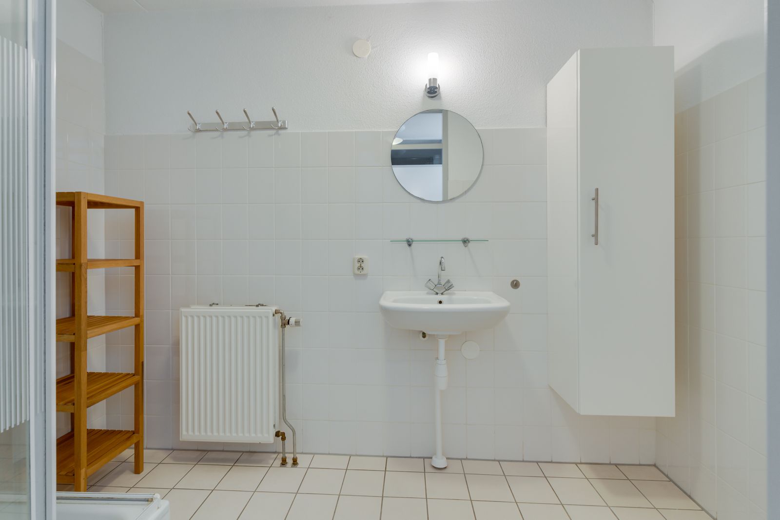 De badkamer is voorzien van een douche en wastafelmeubel. Daarnaast is er een separaat toilet en een praktische wasruimte/berging met aansluitingen voor wasmachine en droger.