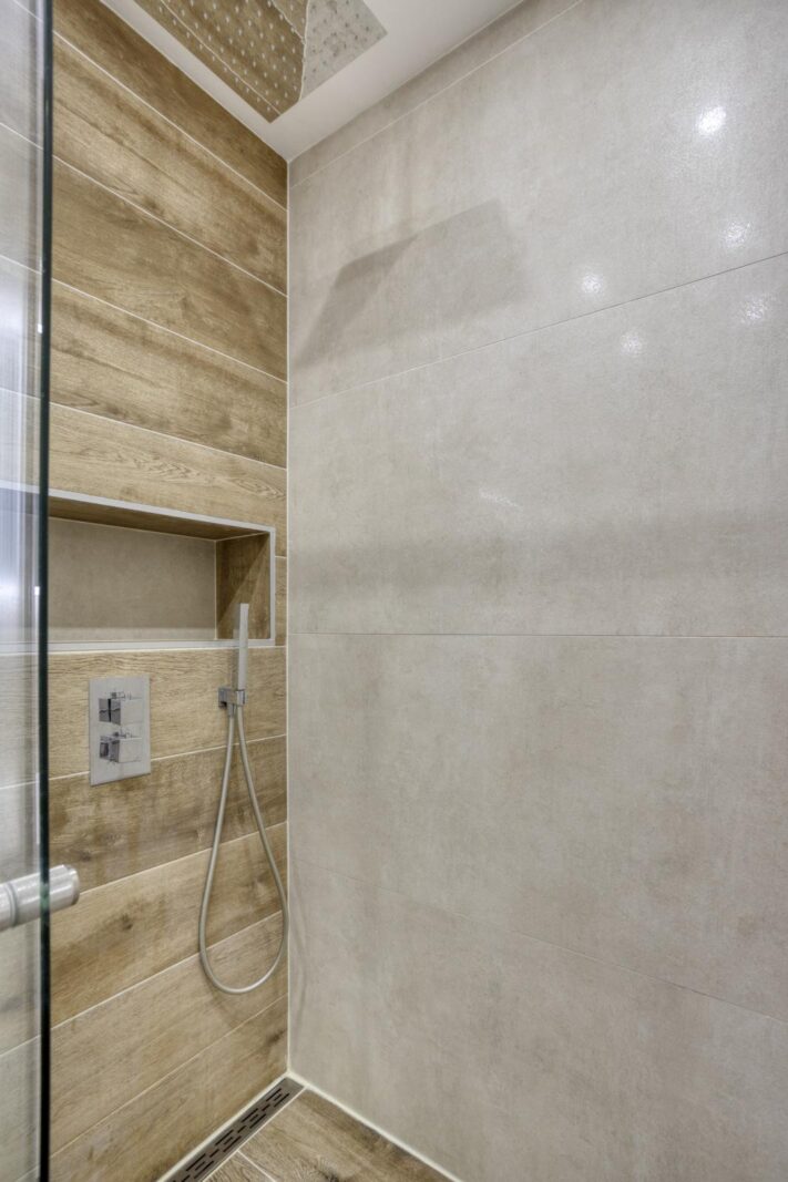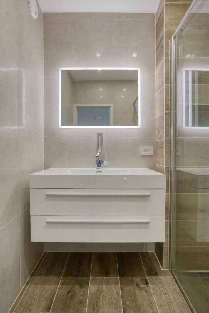 The bathroom was fully renovated in November 2020 and is finished in a modern and timeless style, featuring a walk-in shower and sleek materials.