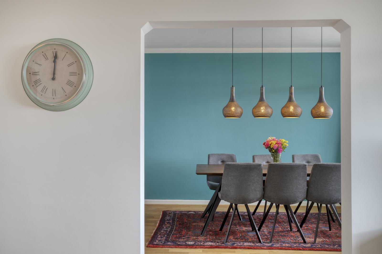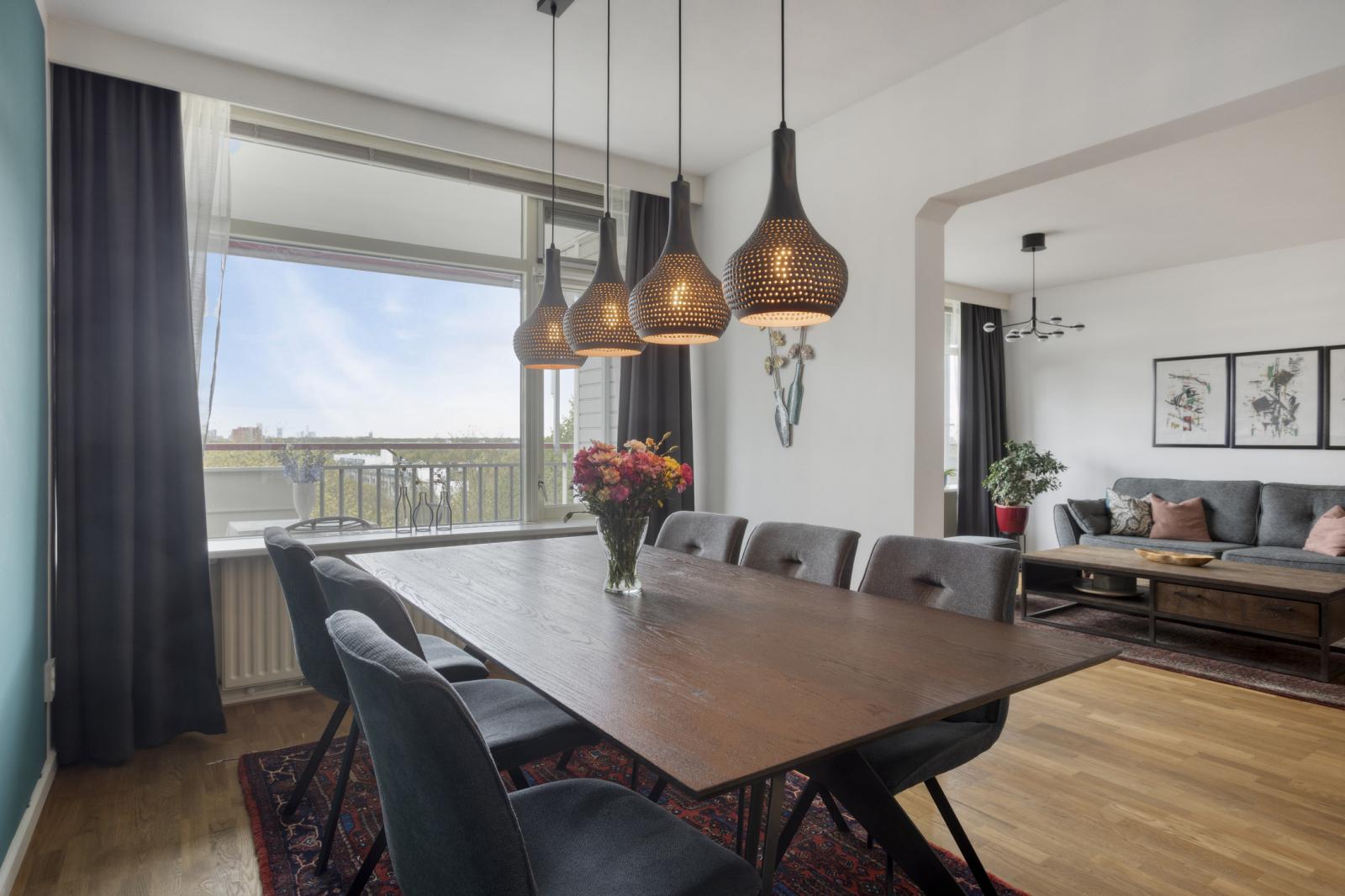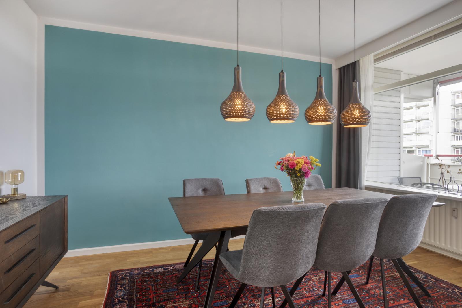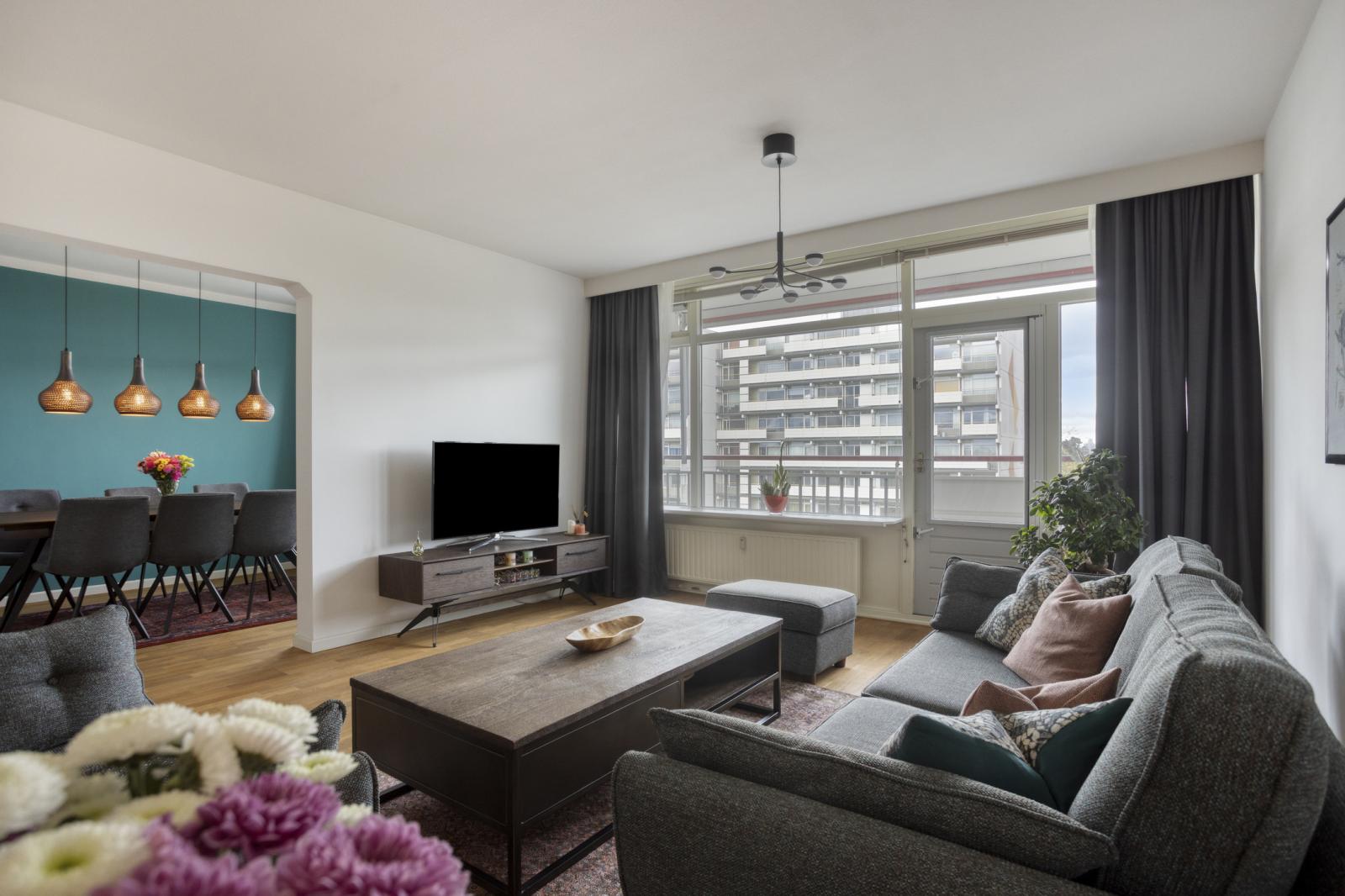 Binnen valt direct de ruimtelijke opzet op. De woonkamer is breed en licht, met grote raampartijen en directe toegang tot het balkon. De aangrenzende eetkamer zorgt voor extra leefruimte en flexibiliteit en is eenvoudig af te sluiten, bijvoorbeeld als werk- of slaapkamer.