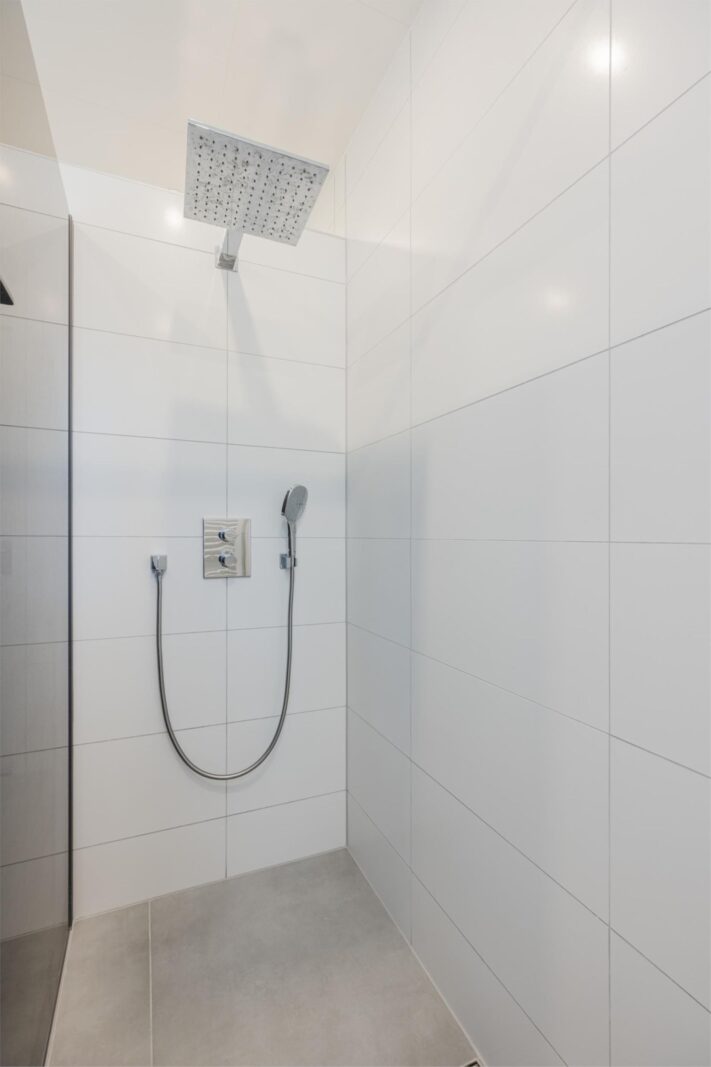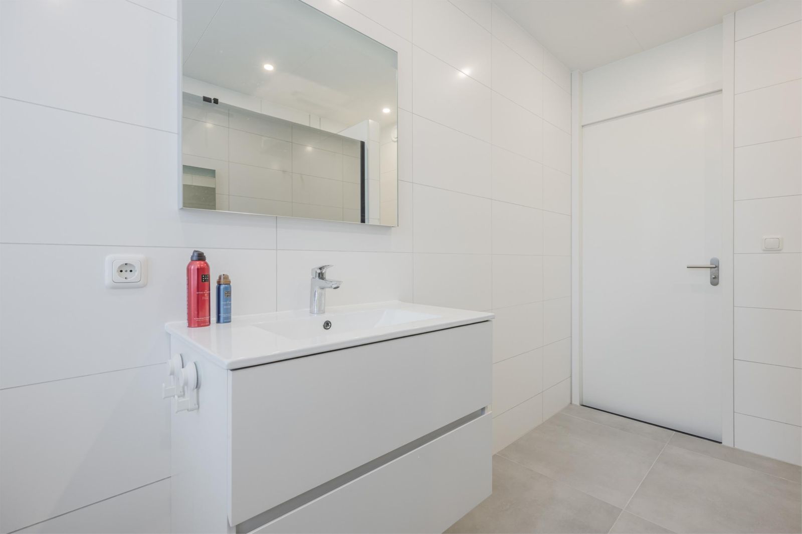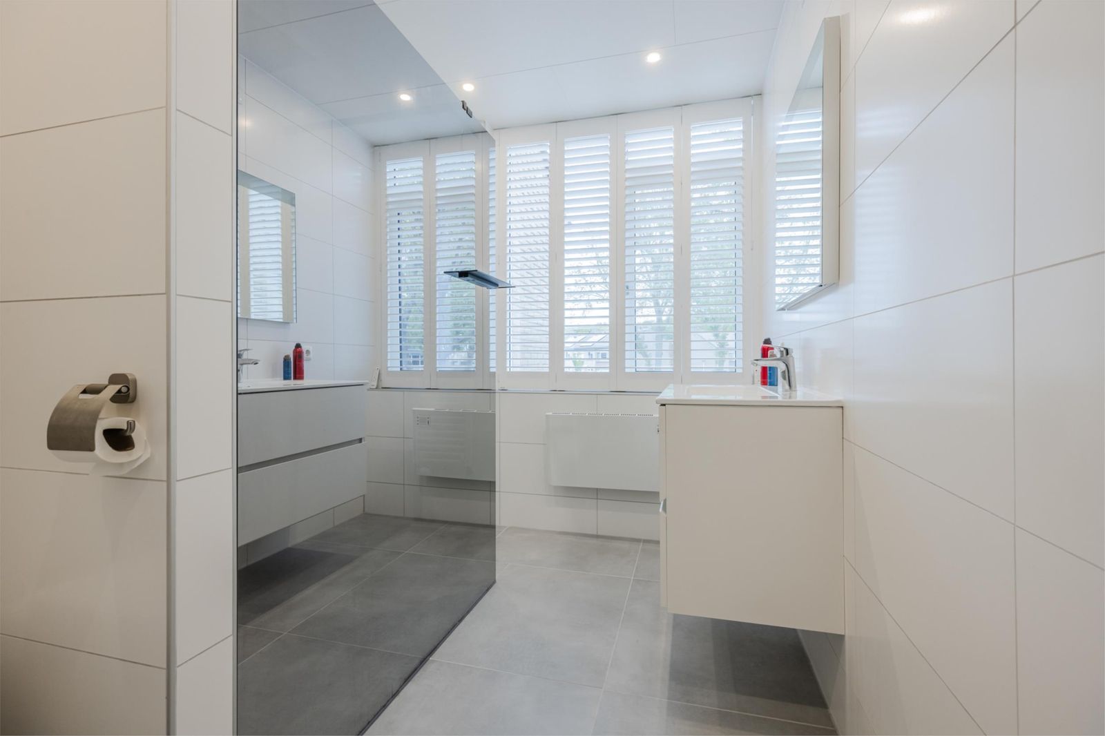 Overloop met trapopgang naar de tweede verdieping en toegang tot de badkamer en drie slaapkamers. De nieuwe volledig betegelde badkamer is voorzien van inloopdouche met glazen scherm, hand- en regendouche, hangend closet en wastafelmeubel. Alle slaapkamers zijn uitgerust met laminaat.