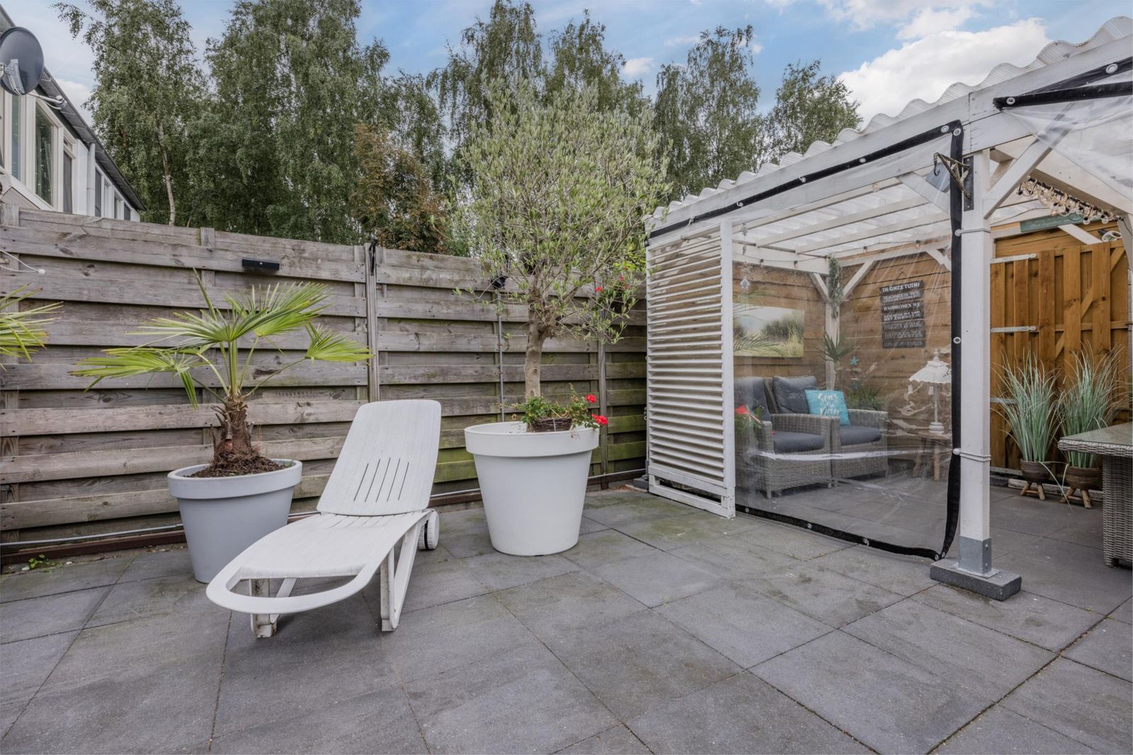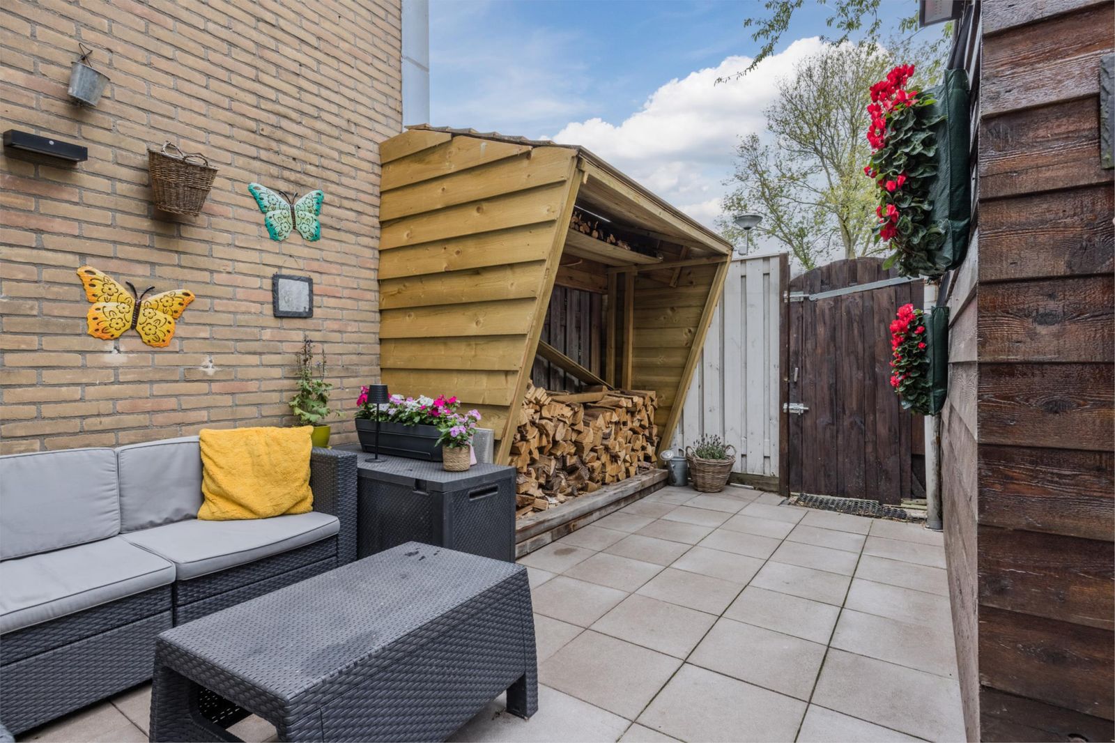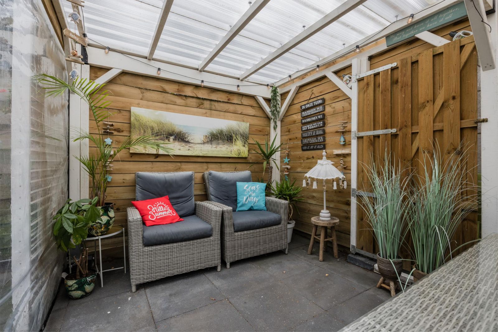 Aan de voorzijde van de woning bevindt zich een vrijstaande houten berging welke is voorzien van elektra. Tevens nog een gezellige zithoek met veel privacy en een opslagplek voor het hout.
