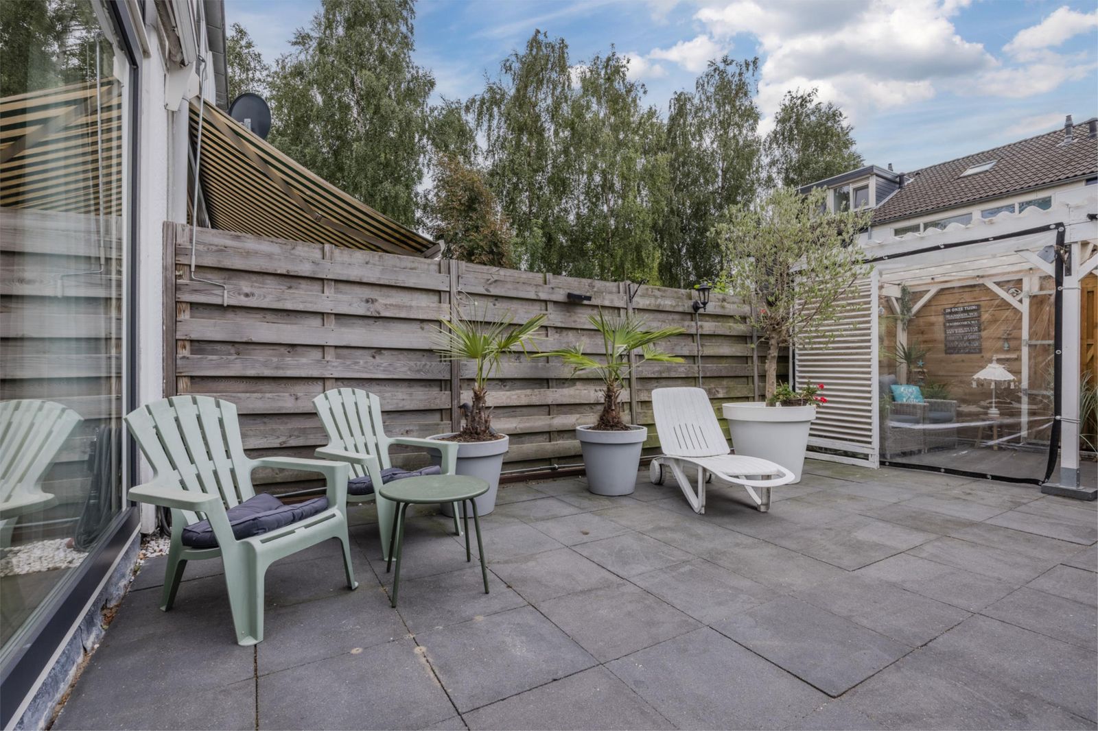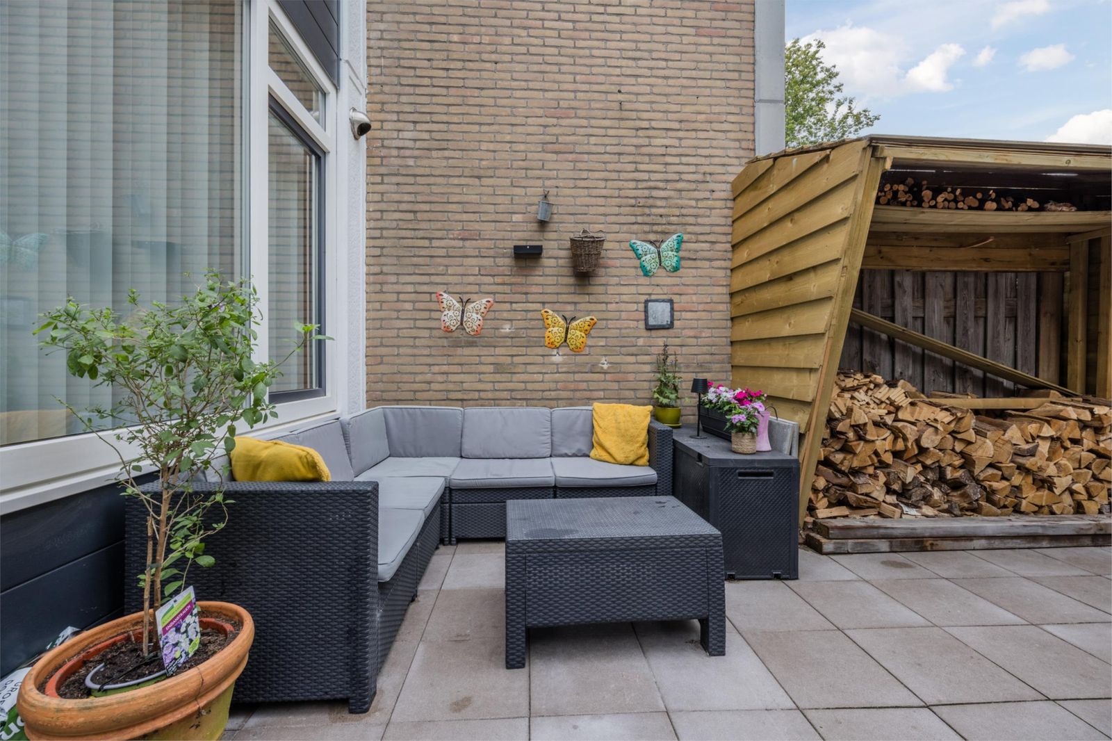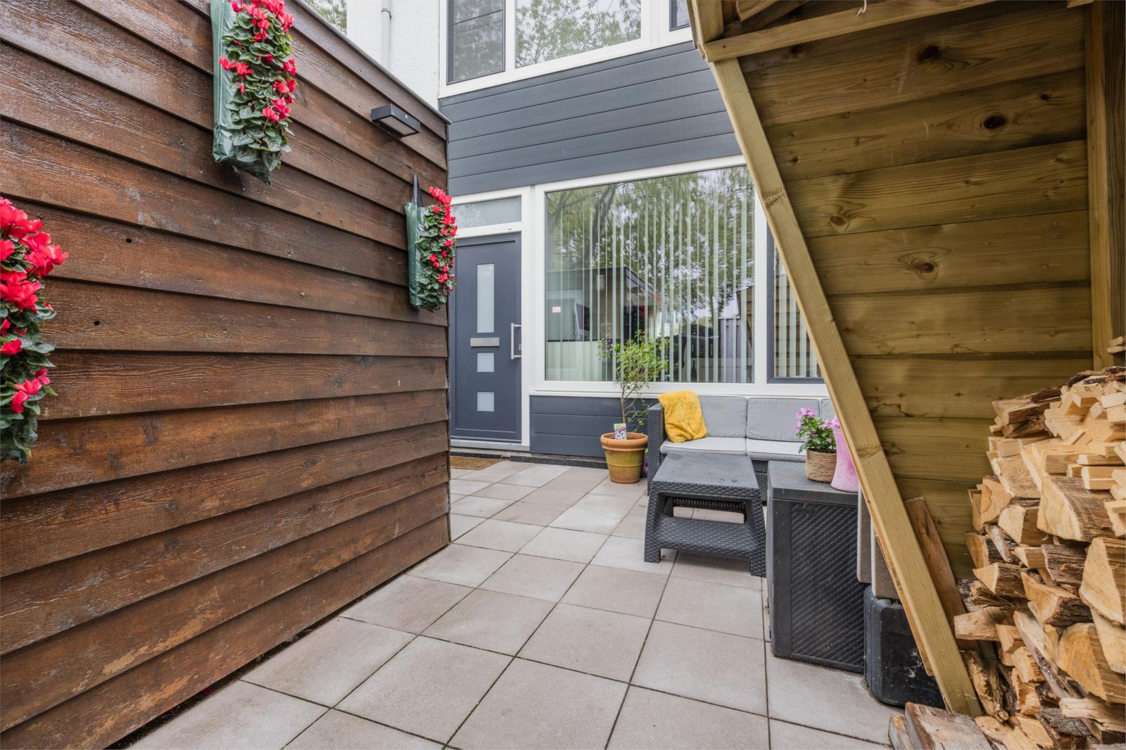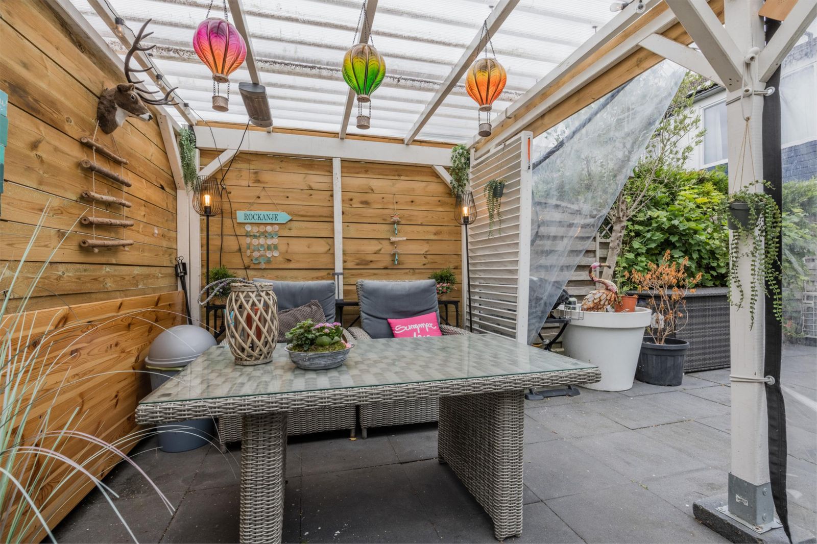 Aan de voorzijde van de woning bevindt zich een vrijstaande houten berging welke is voorzien van elektra. Tevens nog een gezellige zithoek met veel privacy en een opslagplek voor het hout.