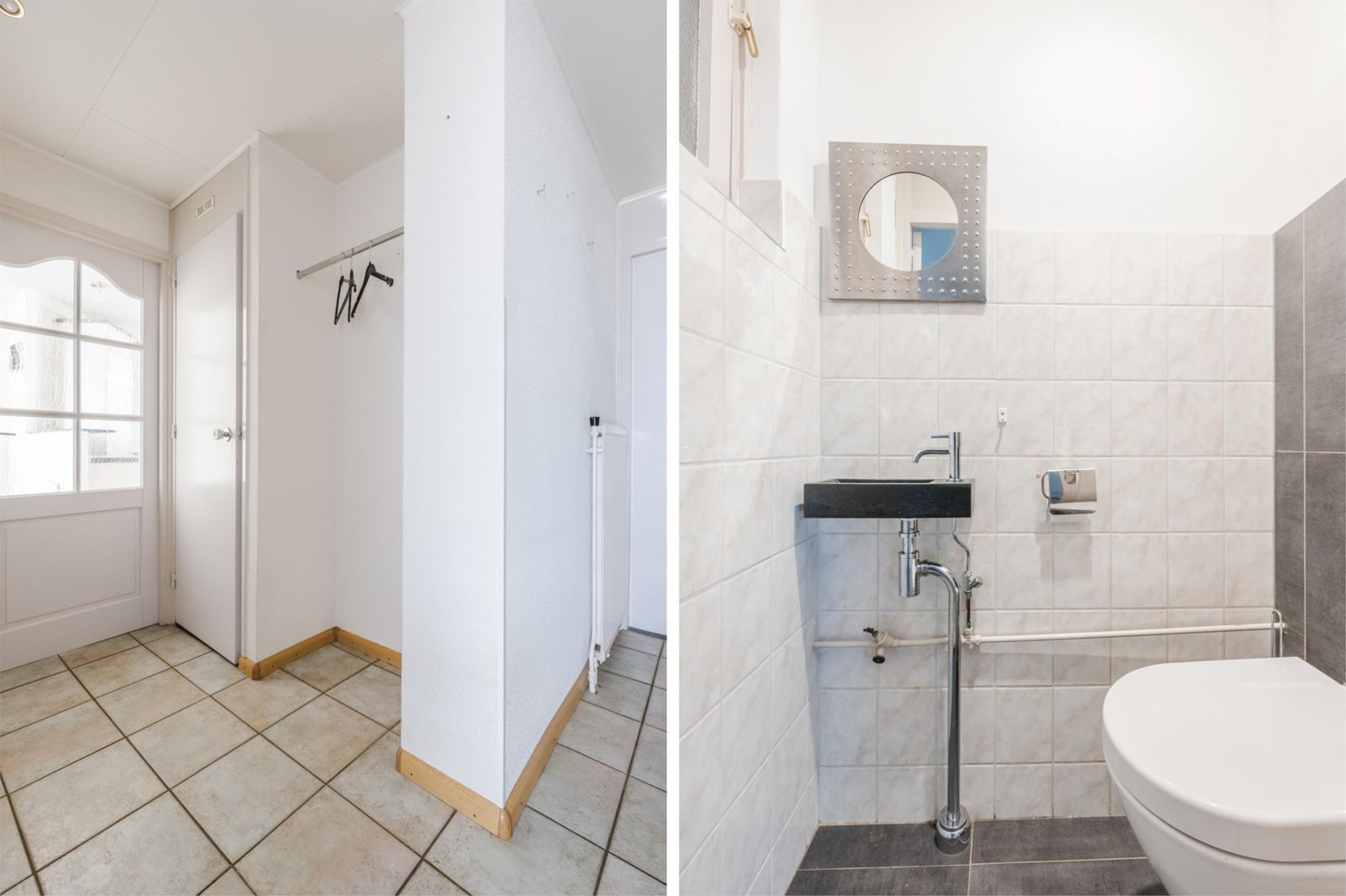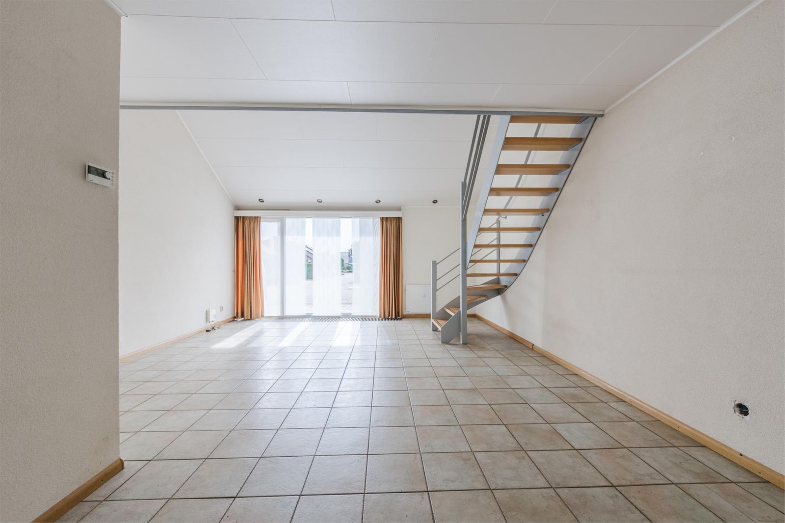 Via de entree kom je in de hal met meterkast, garderobe en toiletruimte. De ruime woonkamer heeft grote raampartijen, waardoor er veel natuurlijk licht binnenvalt en je geniet van het uitzicht op de tuin. De open verbinding met de eethoek zorgt voor een gezellige leefruimte.