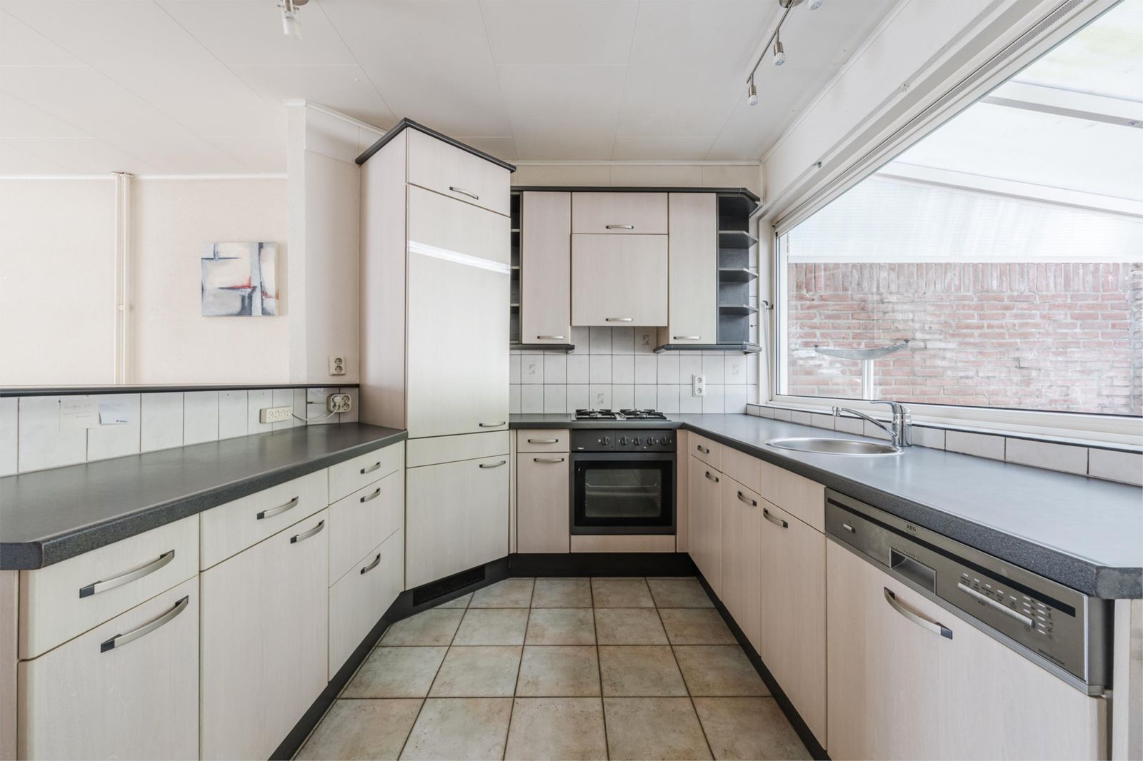 De aangrenzende U-keuken is praktisch ingedeeld en biedt volop opbergruimte. Vanuit de keuken loop je zo door naar de overkapping in de achtertuin – ideaal om buiten te eten of gewoon even te ontspannen. Zowel vanuit de woonkamer als de keuken heb je vrij uitzicht aan de achterzijde, zonder directe inkijk.