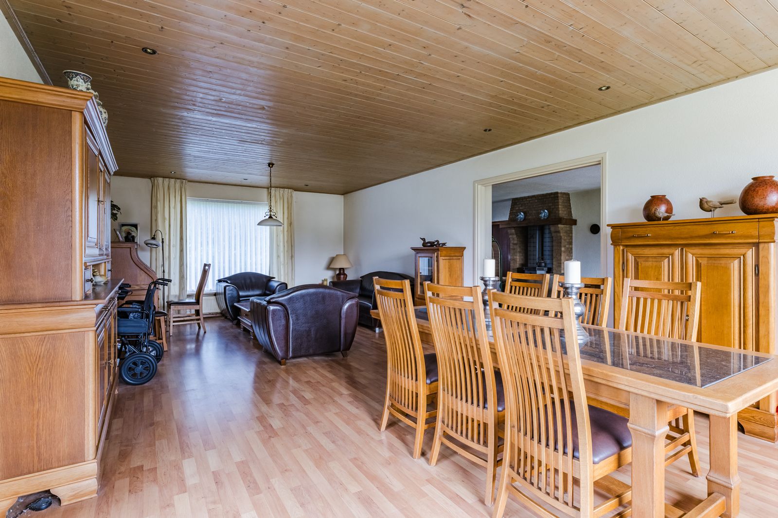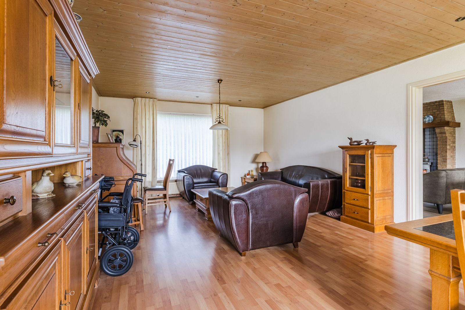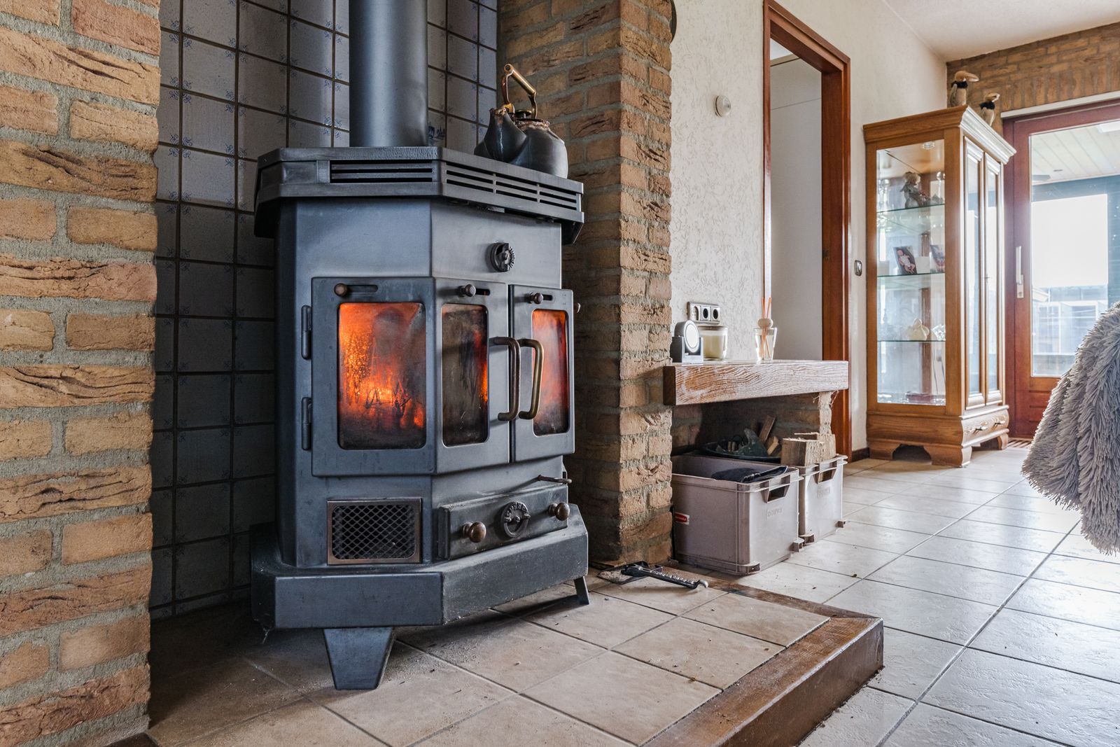 De riante living is voorzien van een schuifpui en een dubbele draaideur en heeft een oppervlakte van ong. 80 m2,heeft in een deel vloerverwarming en er staat een houtkachel