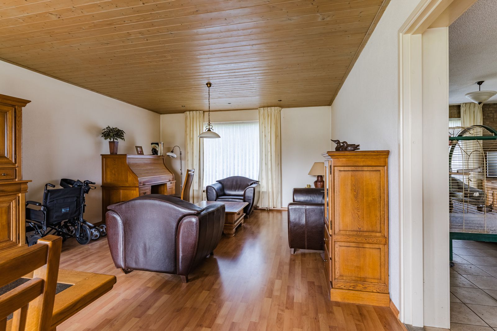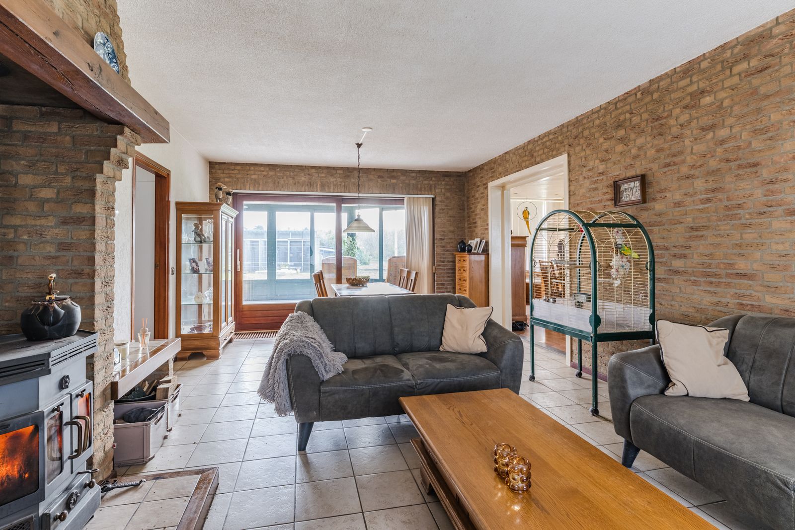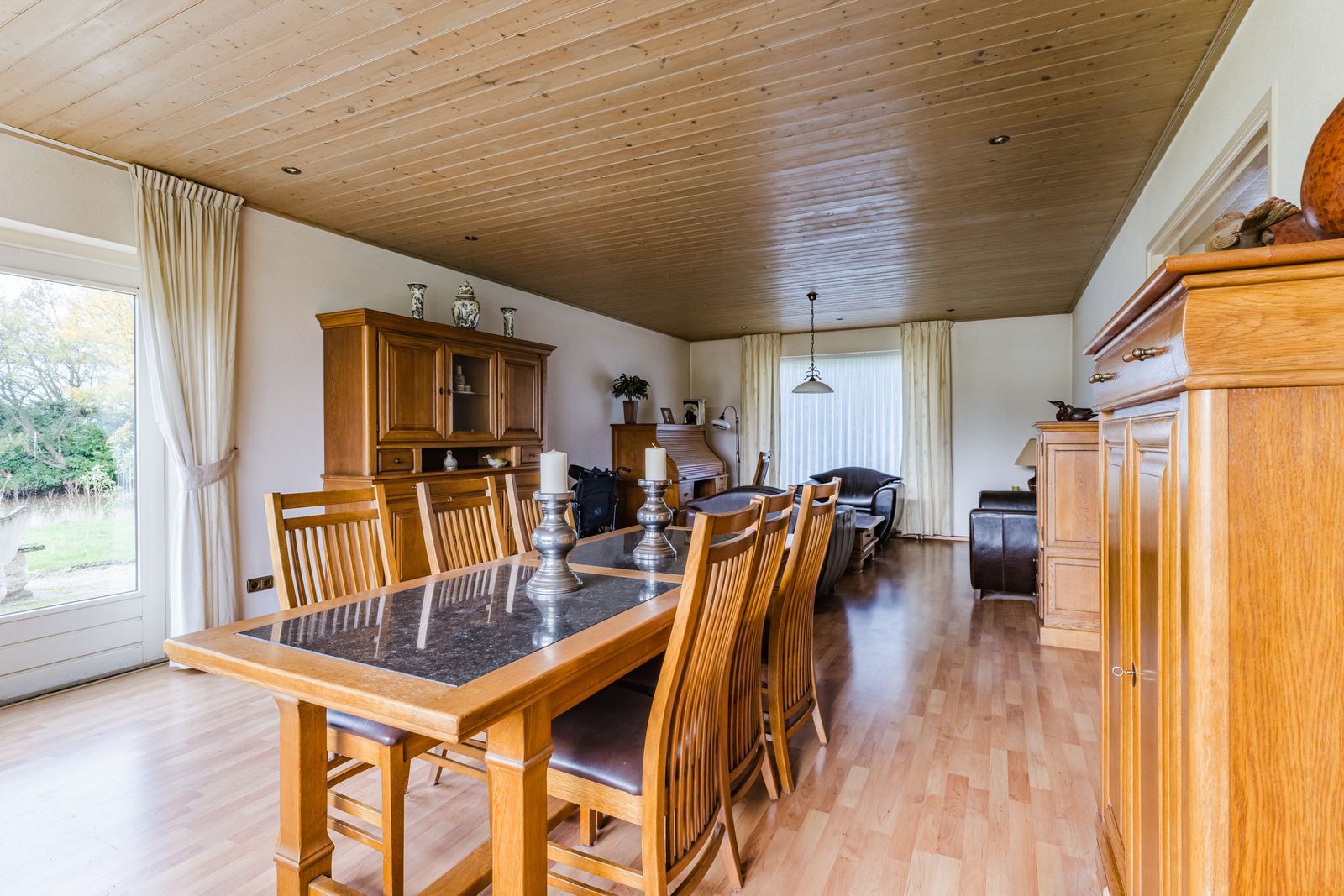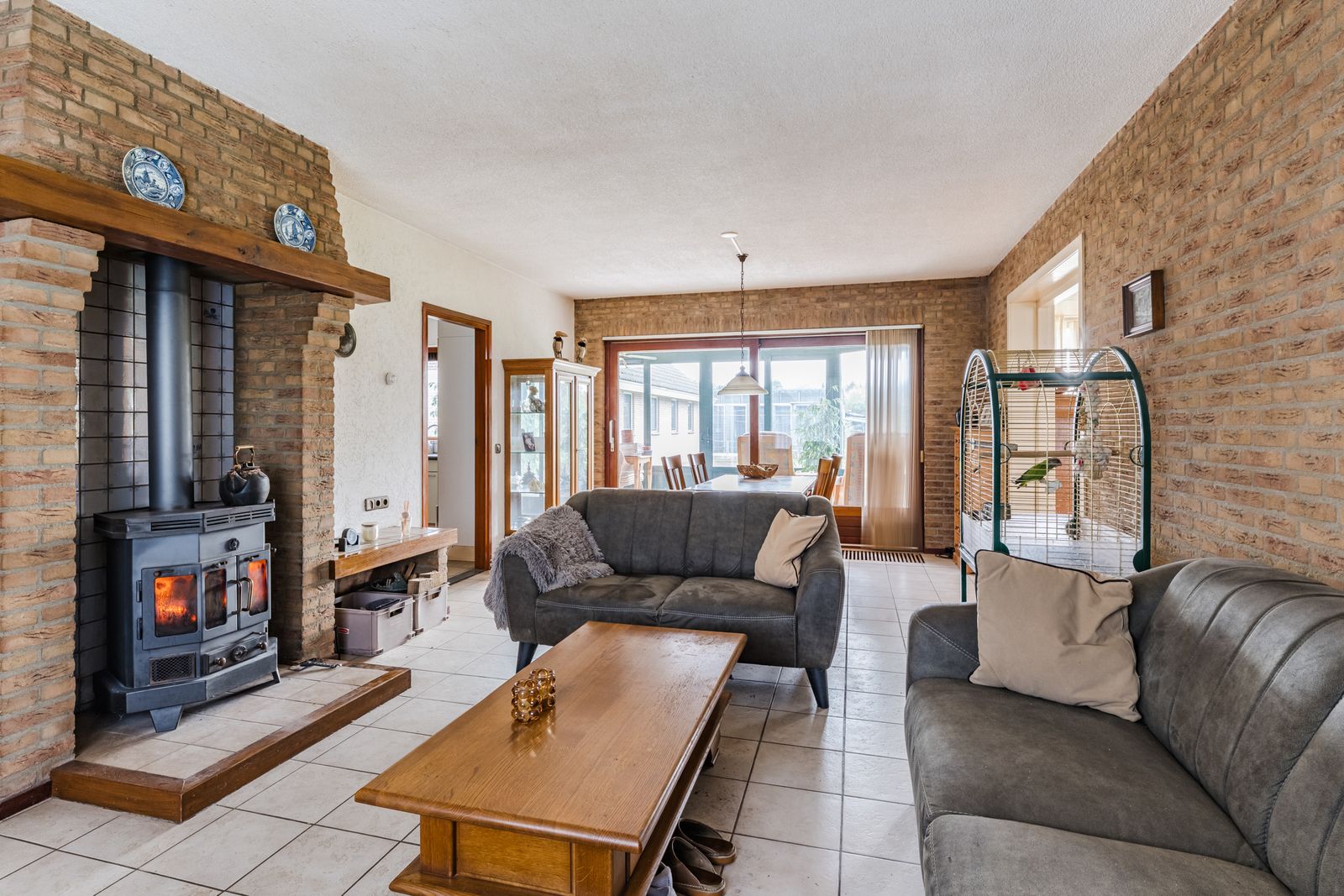 De riante living is voorzien van een schuifpui en een dubbele draaideur en heeft een oppervlakte van ong. 80 m2,heeft in een deel vloerverwarming en er staat een houtkachel