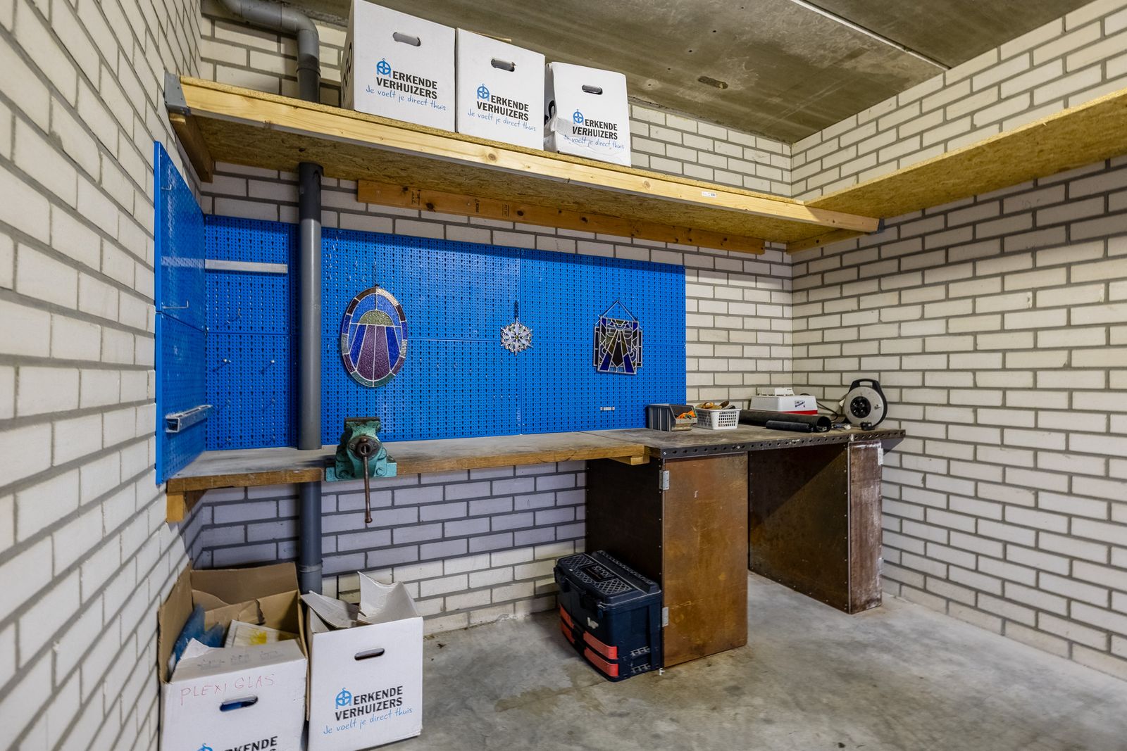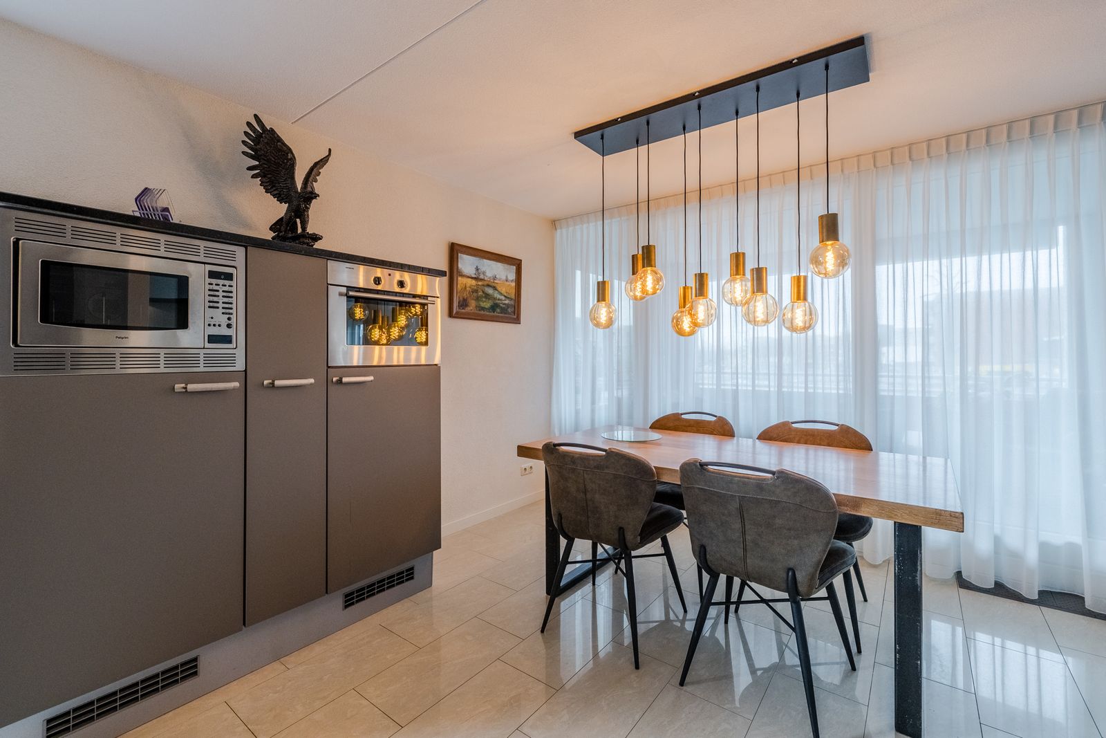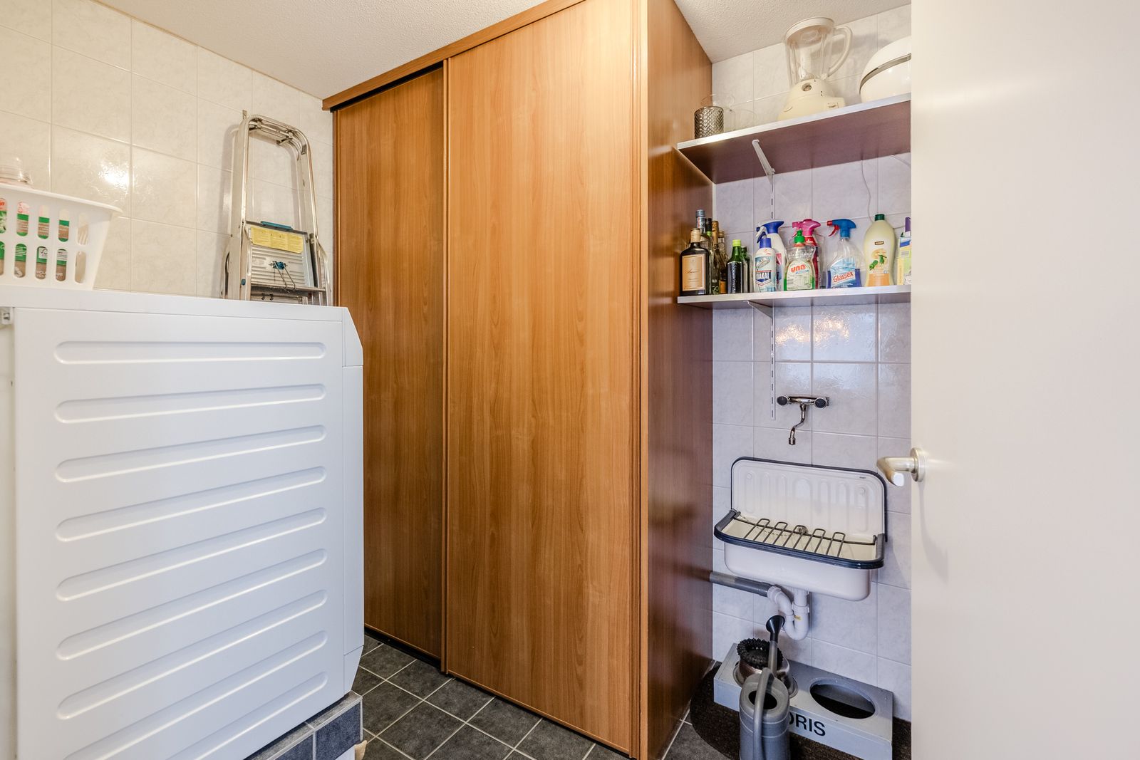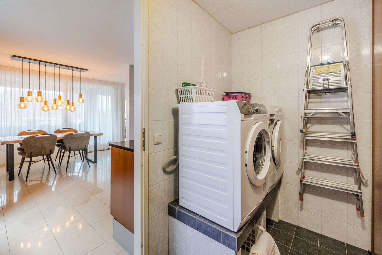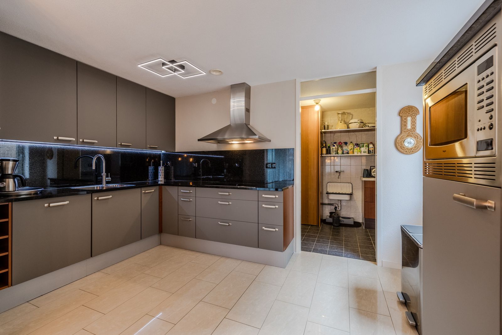 De woonkamer is royaal en licht, met grote raampartijen en voldoende ruimte voor een comfortabele zithoek en een ruime eethoek. De open keuken sluit hier naadloos op aan en is praktisch ingericht met inbouwapparatuur en veel bergruimte. Aangrenzend bevindt zich een inpandige berging met aansluiting voor de wasmachine en ruimte voor een wasdroger. Alles op werkhoogte.