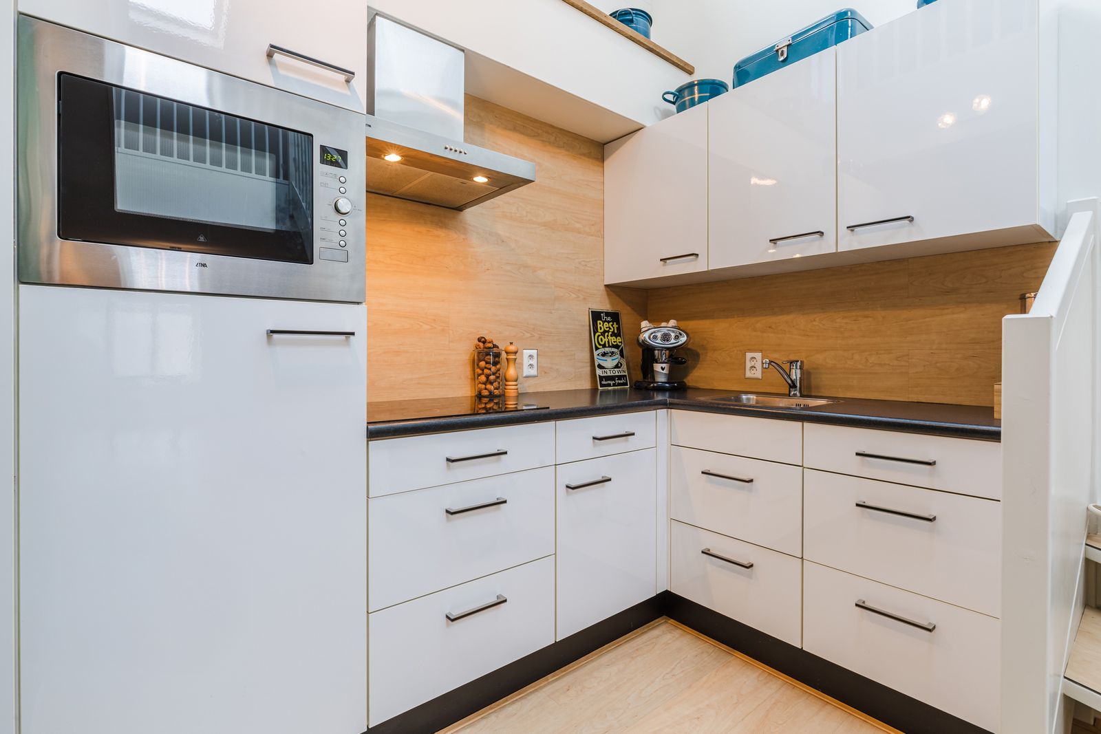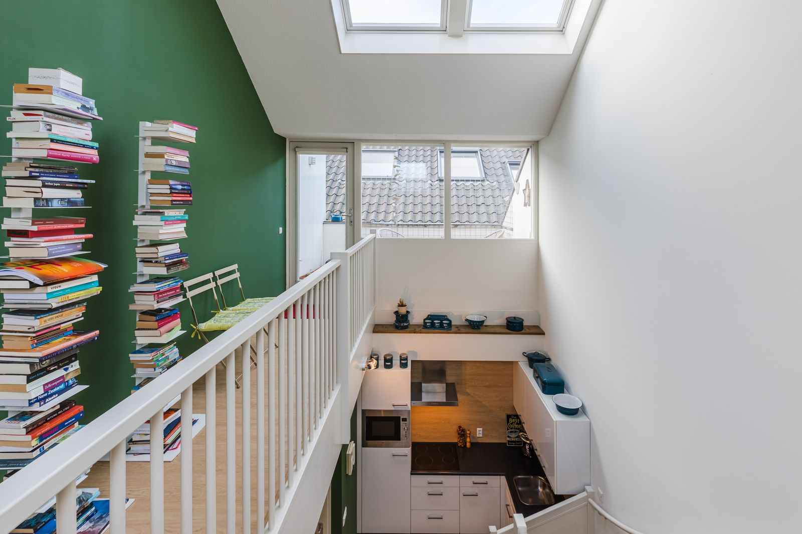 De woonverdieping is voorzien van een lichte living met een keuken, inclusief oven, koelkast en keramische kookplaat. Via de open trap bereik je de lichte vide: een unieke ruimte die je kunt gebruiken als werkplek, extra slaapruimte of loungeplek; het geeft tevens toegang tot het balkon. Daarnaast beschikt het appartement over een ruime slaapkamer, een nette badkamer, een toilet en voldoende bergruimte. Velux-ramen kunnen op afstand bediend worden (openen/sluiten en verduistering).
