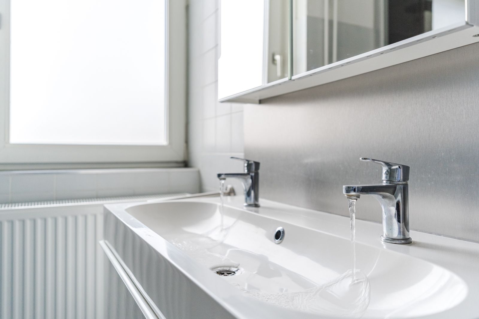 De ruime badkamer is voorzien van een ligbad, een luxe inloopdouche met thermostaatkraan en regendouche, een dubbele wastafel met spiegelkast en ingebouwde verlichting en een tweede toilet. De badkamer is uitgevoerd met een lichte wandbetegeling en een antracietkleurige PVC-vloer. Alle slaapkamers en badkamer zijn voorzien van insectenhorren.