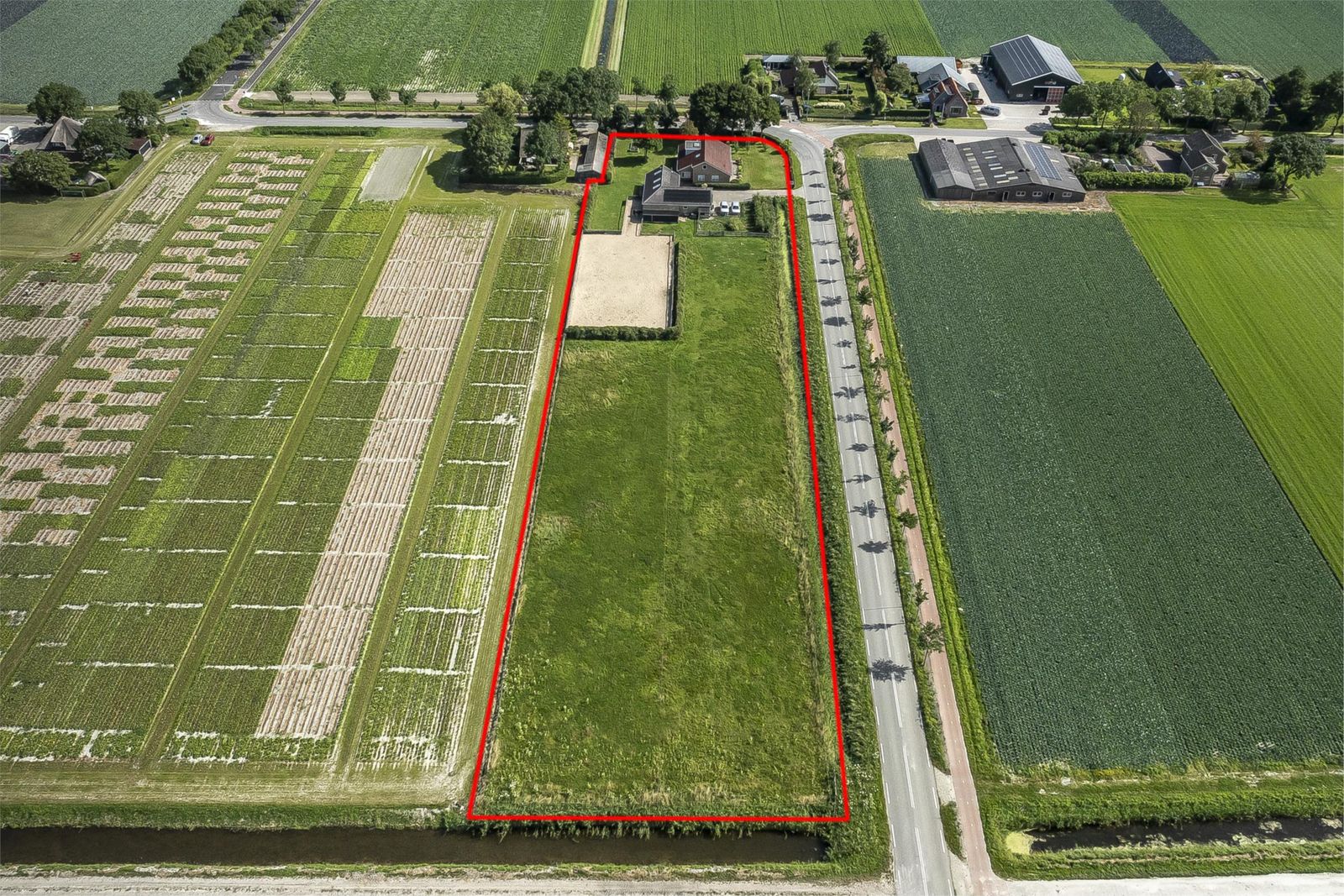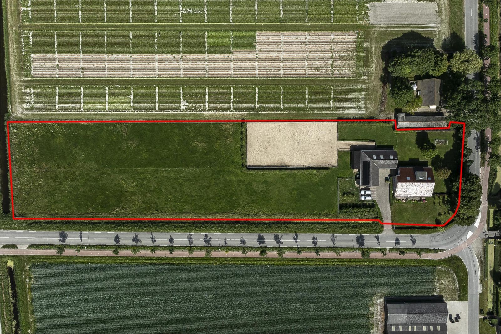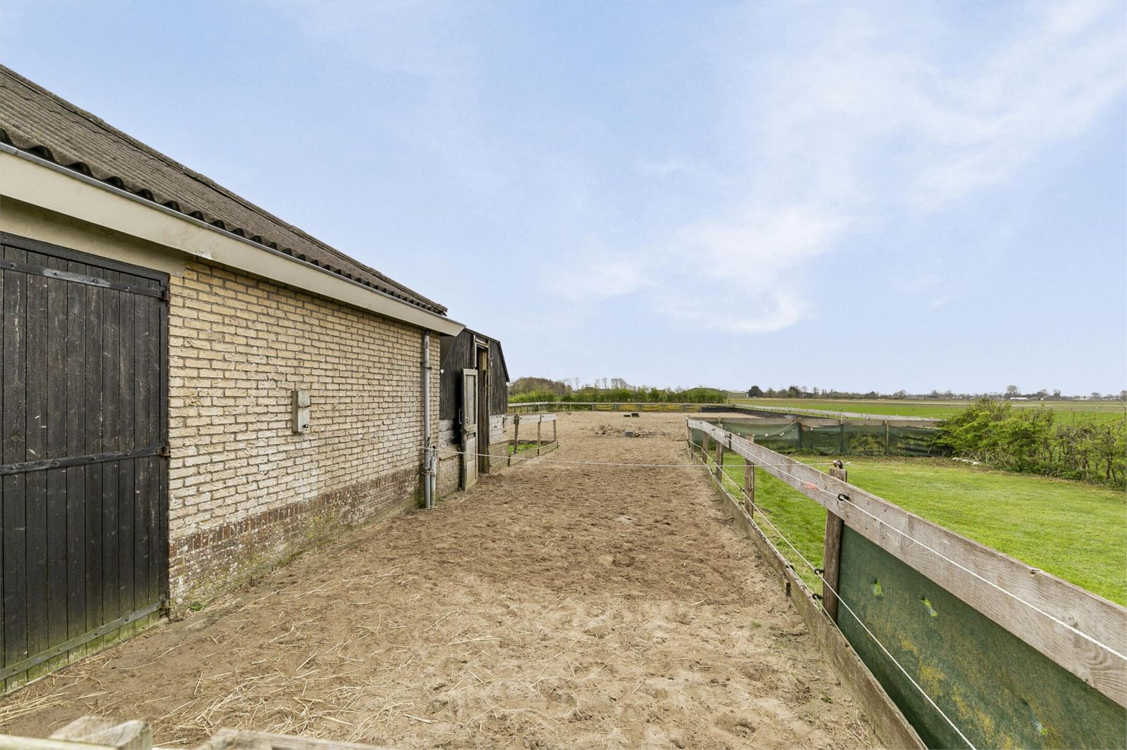 Grenzend aan de schuur bevindt zich een hoge paardeninloopstal van circa 31 m2, een royale paarden(zand)bak/rijbak van 800 m2 (40 bij 20) en voldoende grasland. Uw paarden kunnen hier in alle vrijheid rondlopen.