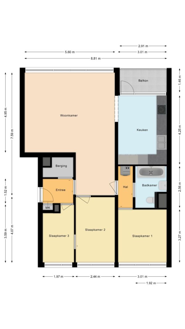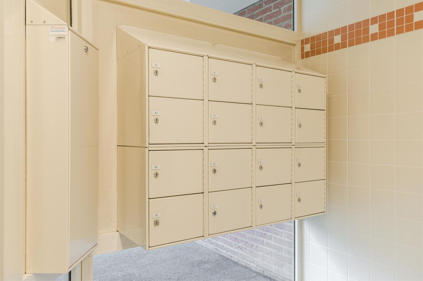 Appartement: entree, hal, berging, slaapkamer aan de voorzijde, lichte woonkamer met een groot raamoppervlak en een parketvloer, toegang naar de keuken voorzien van inbouwapparatuur en toegang naar het balkon gelegen op het zuidoosten. Tweede slaapkamer aan de voorzijde, gang, wasmachineaansluiting, badkamer met ligbad, toilet, wastafel en wastafelmeubel, derde slaapkamer aan de voorzijde.