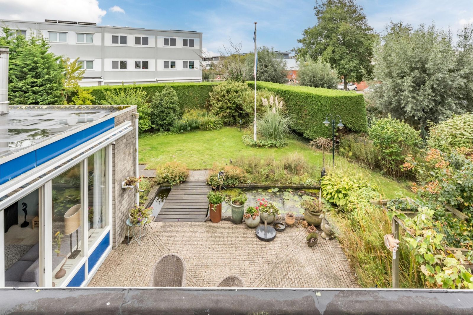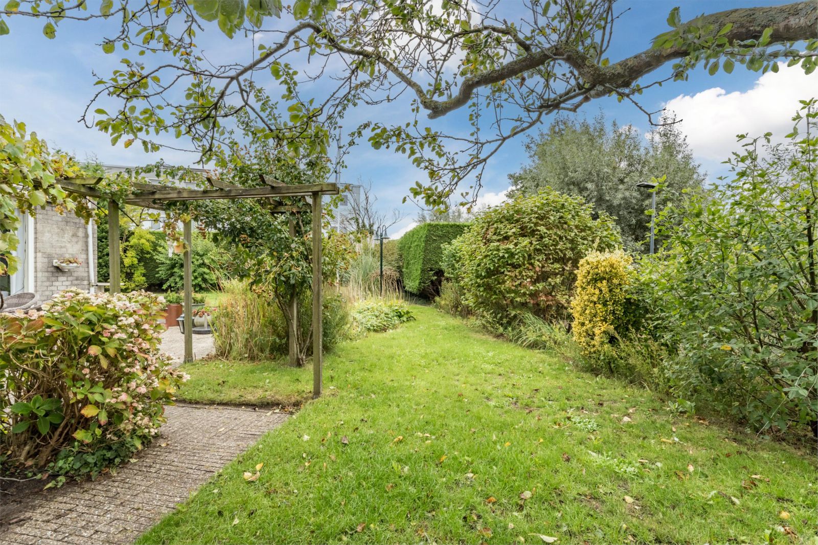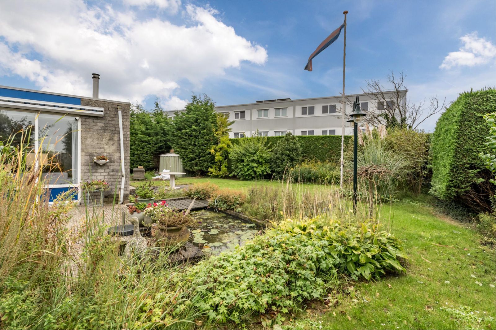 De royale woonkamer met grote ramen, een open haard en een schuifpui naar terras en tuin biedt een prachtige verbinding tussen binnen en buiten. Hier loopt het woongedeelte naadloos over in de zonnige tuin van maar liefst 372 m². De tuin is sfeervol aangelegd met een ruim terras voorzien van elektrisch zonnescherm en een vijver, deels omsloten door een coniferenhaag voor extra privacy, én voorzien van een achterom – praktisch en comfortabel.