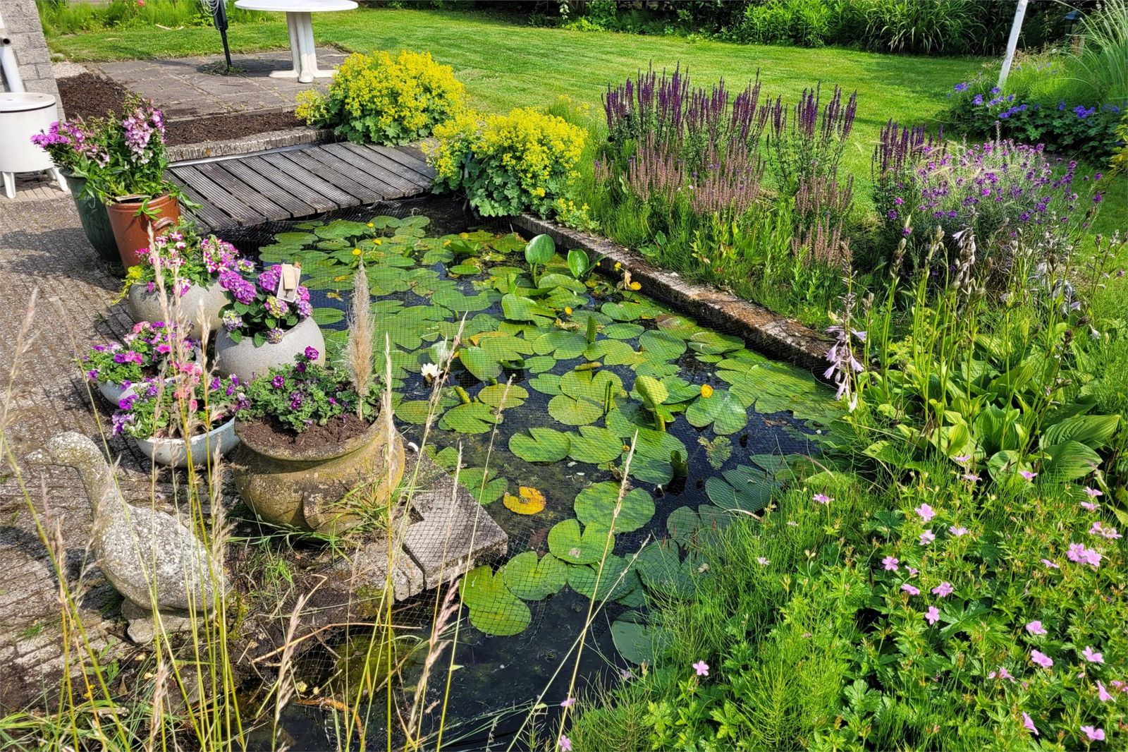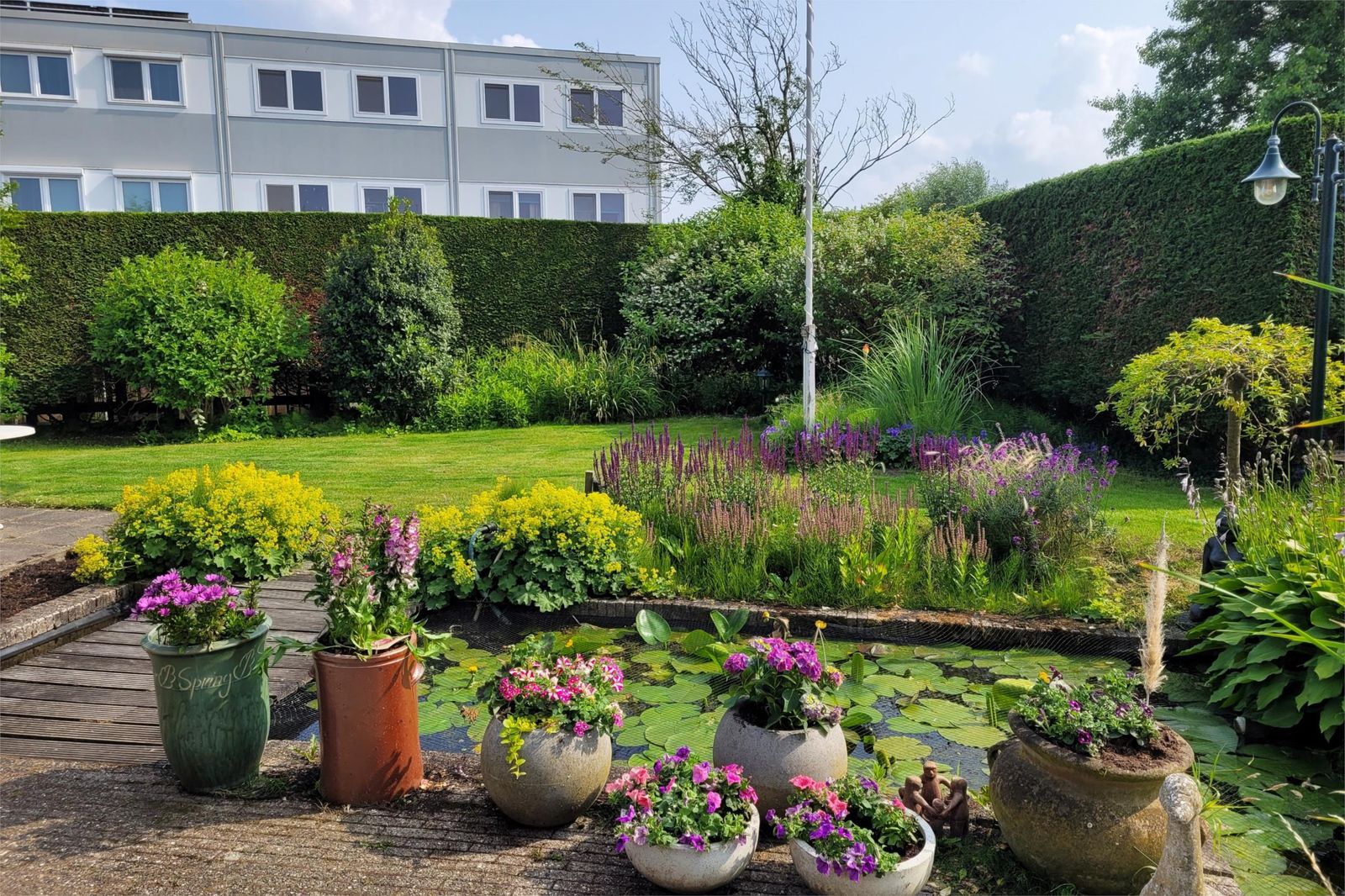 Tuin in L-vorm met ruim terras, gazon, vijver, achterom en deels omsloten door coniferenhaag voor extra privacy
