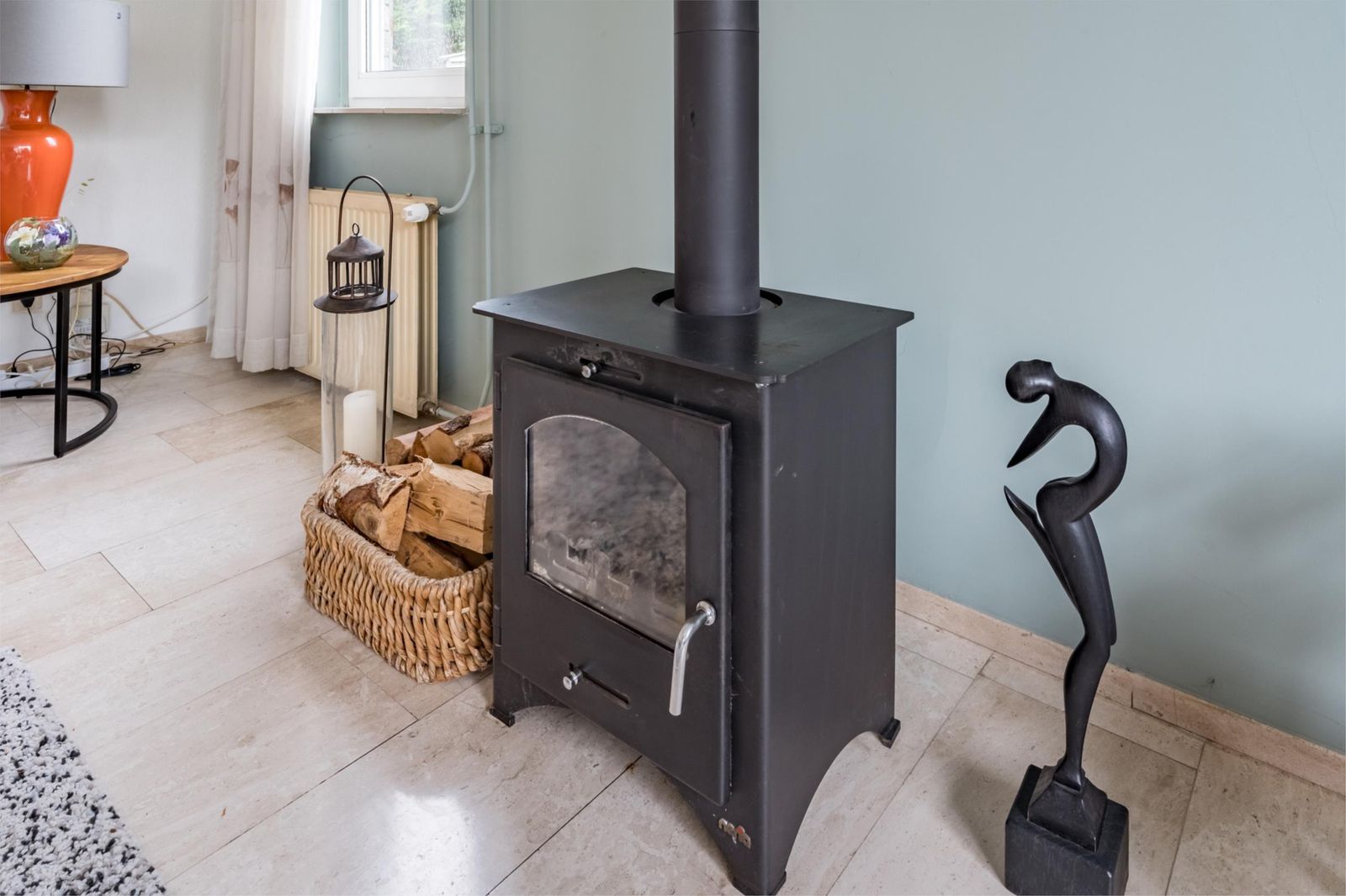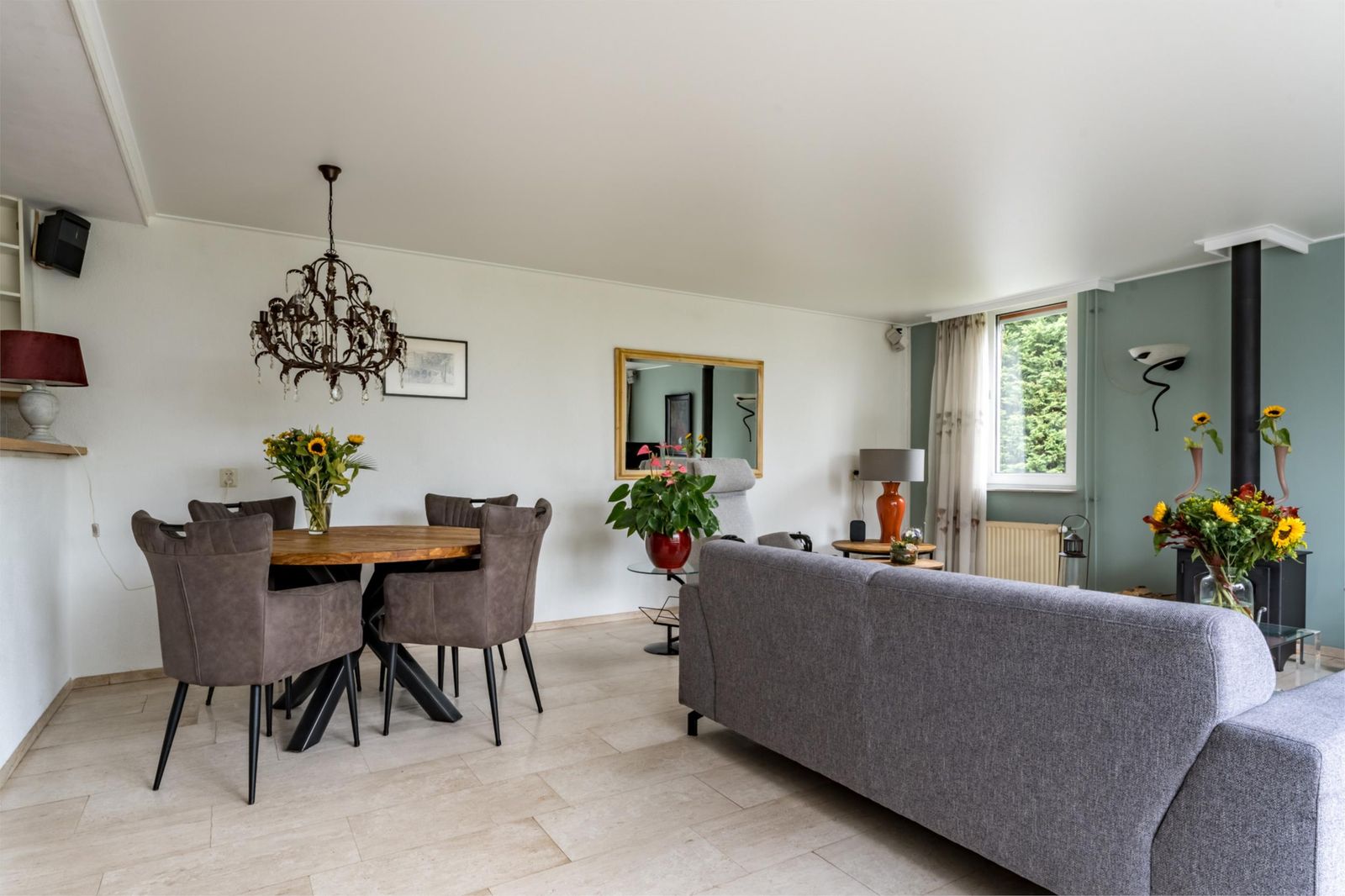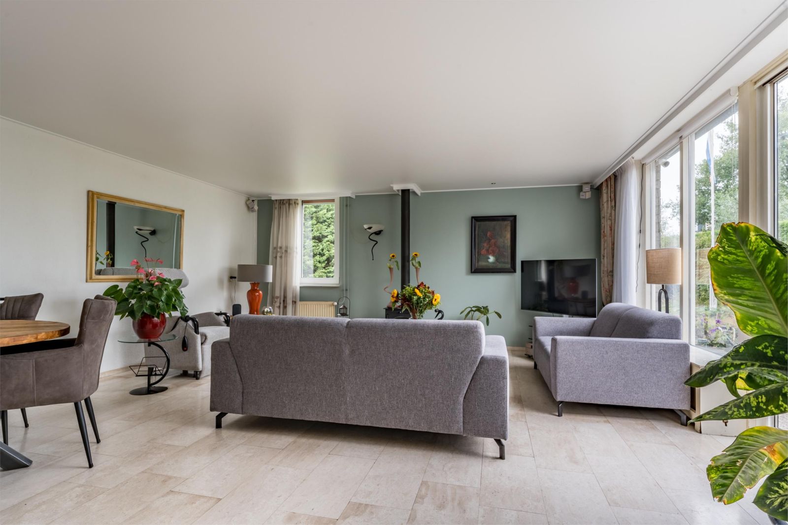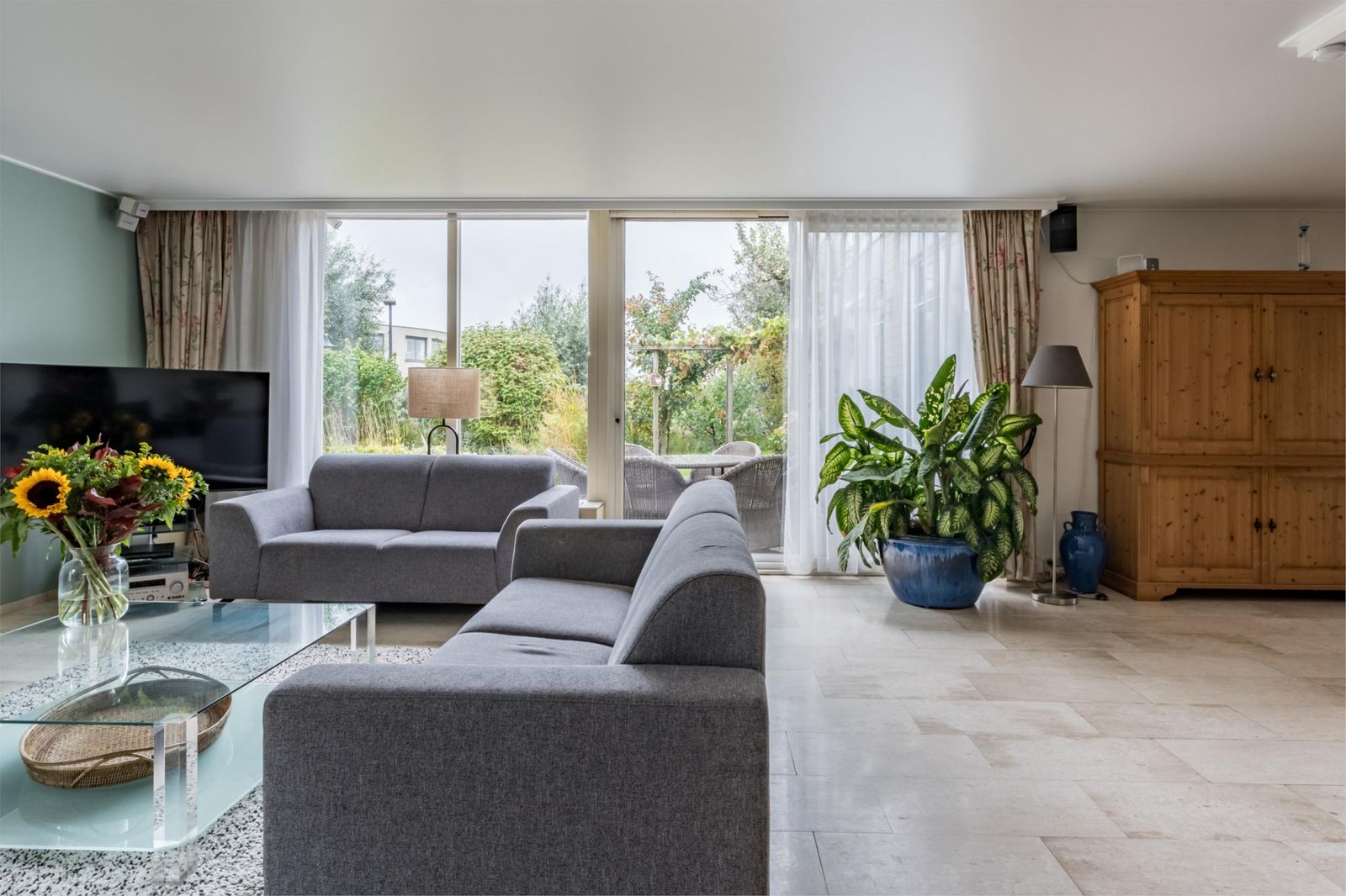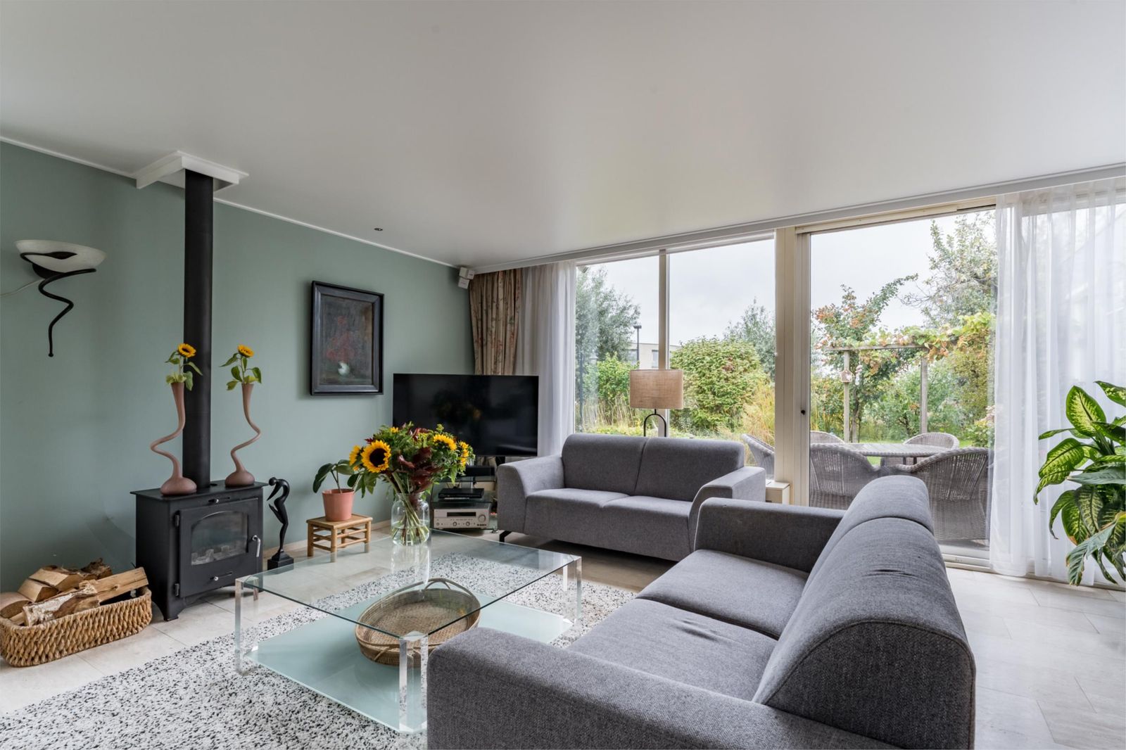 Lichte woonkamer met open haard en schuifpui naar de tuin