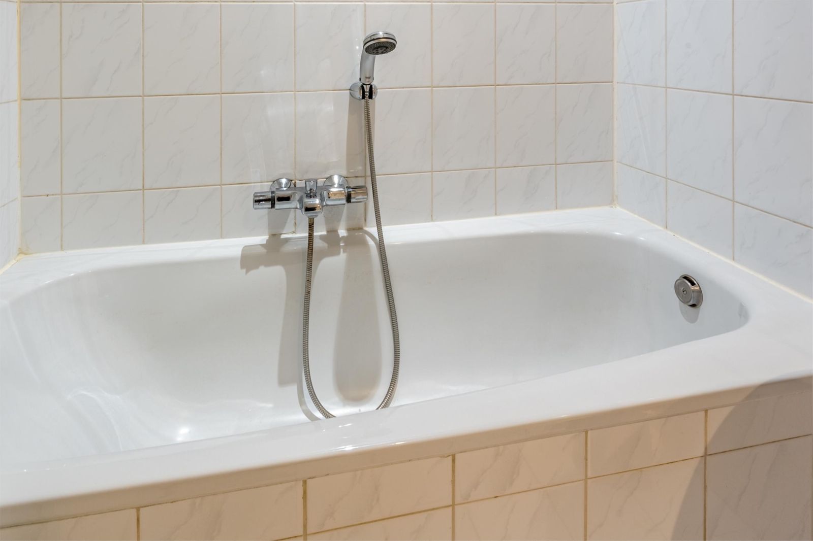 Badkamer met inloopdouche en ligbad (gedateerd, biedt kansen voor modernisering)