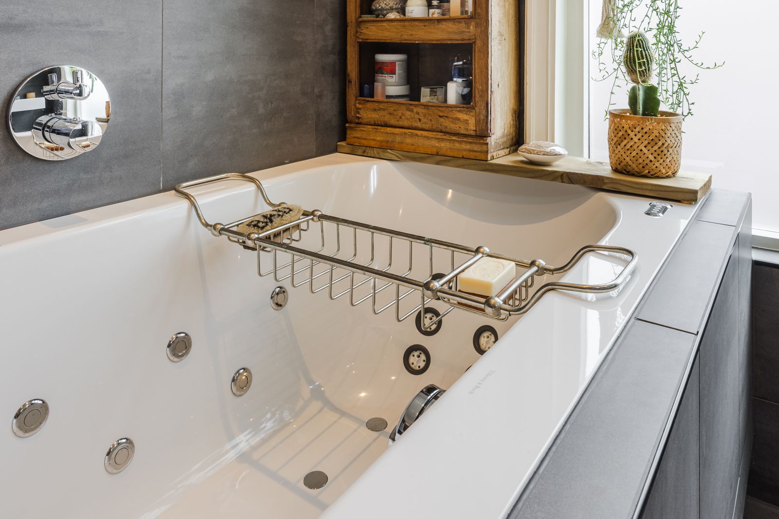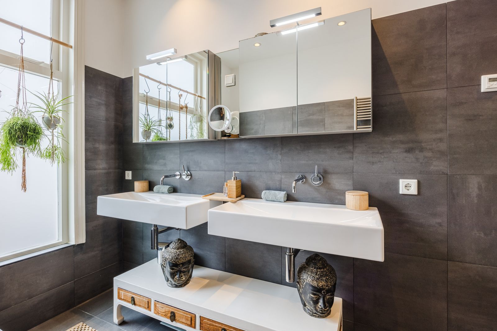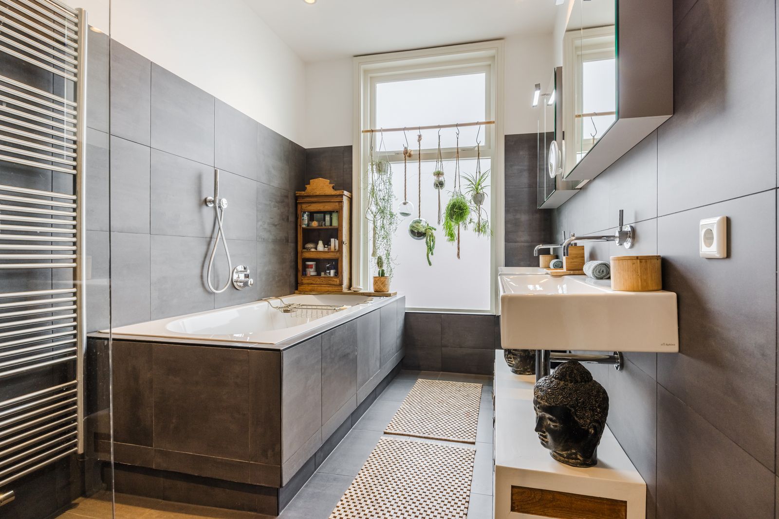 Luxe badkamer met whirlpool-ligbad, inloopdouche, dubbele wastafel, handdoekradiator en vloerverwarming.