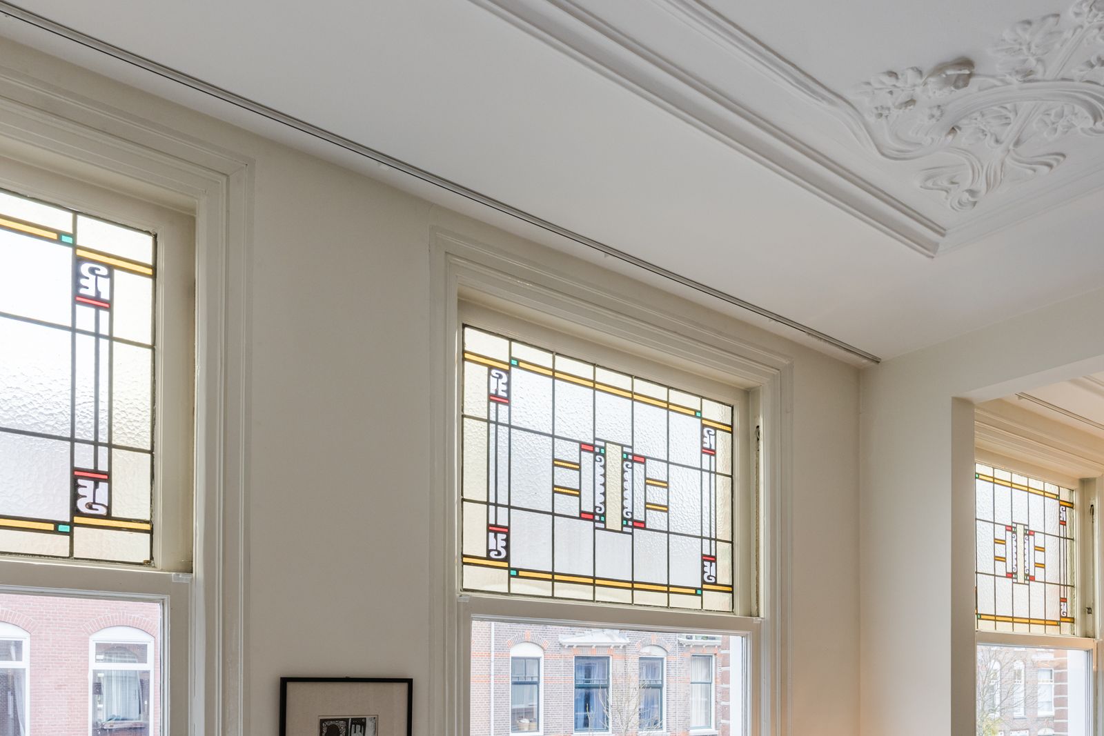 •Houten kozijnen grotendeels met monumentaal dubbelglas en glas-in-lood met voorzetramen