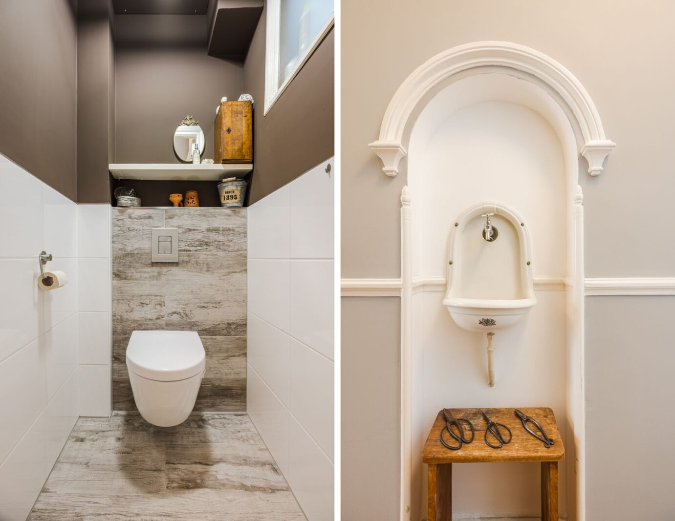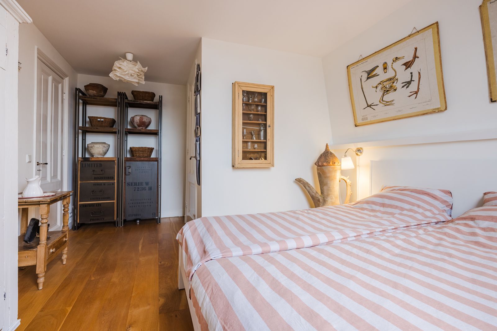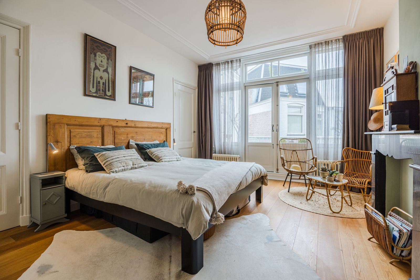 Overloop met originele muurfontein en modern toilet, bergkast. Meerdere slaapkamers, waaronder een royale suite met schuifdeur naar ruime achterkamer met stenen schouw. Balkon aan achterzijde (ca. 3.70 × 2.50), waarbij de houten achterpui met openslaande deuren en balkonhekwerk volledig zijn vernieuwd.