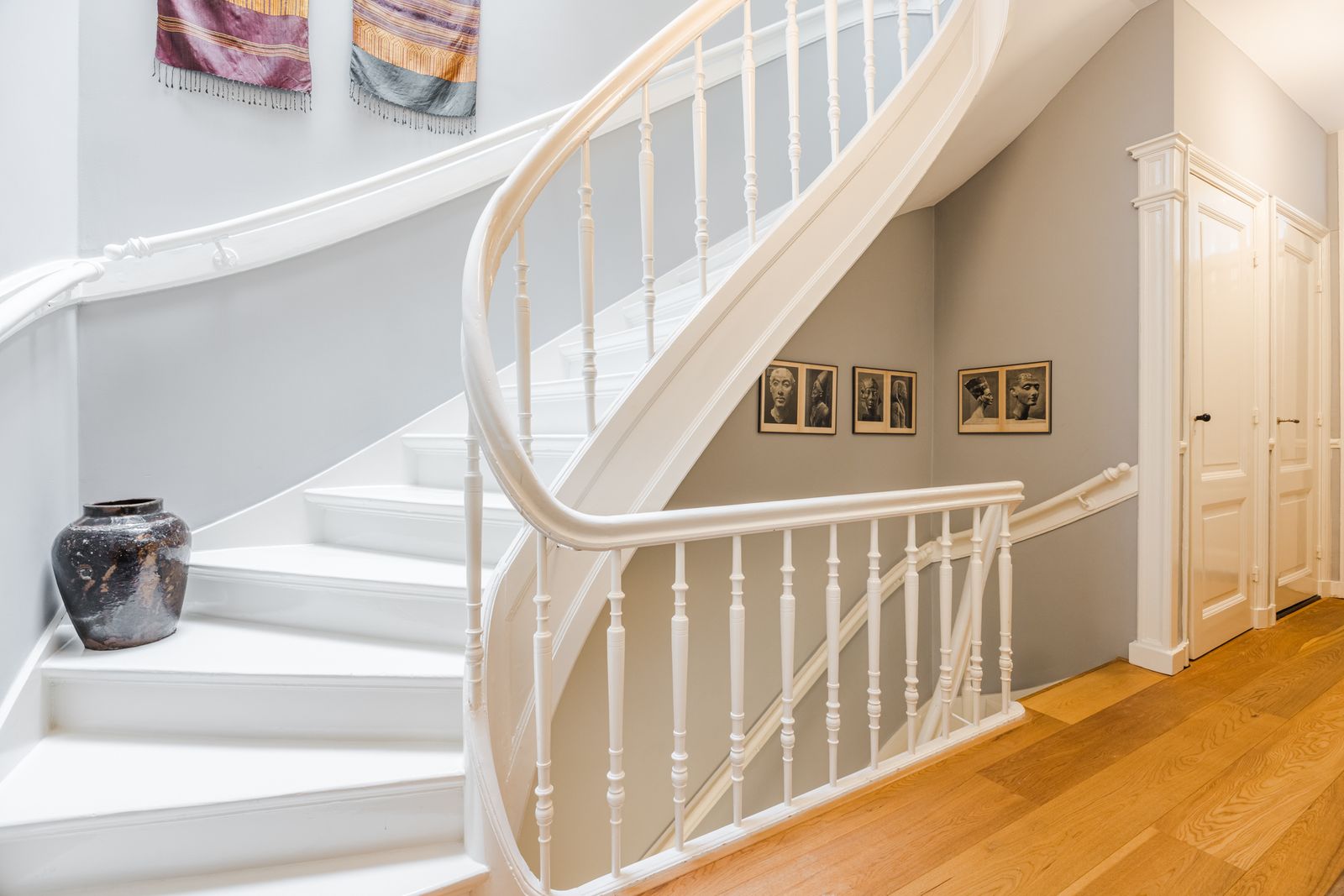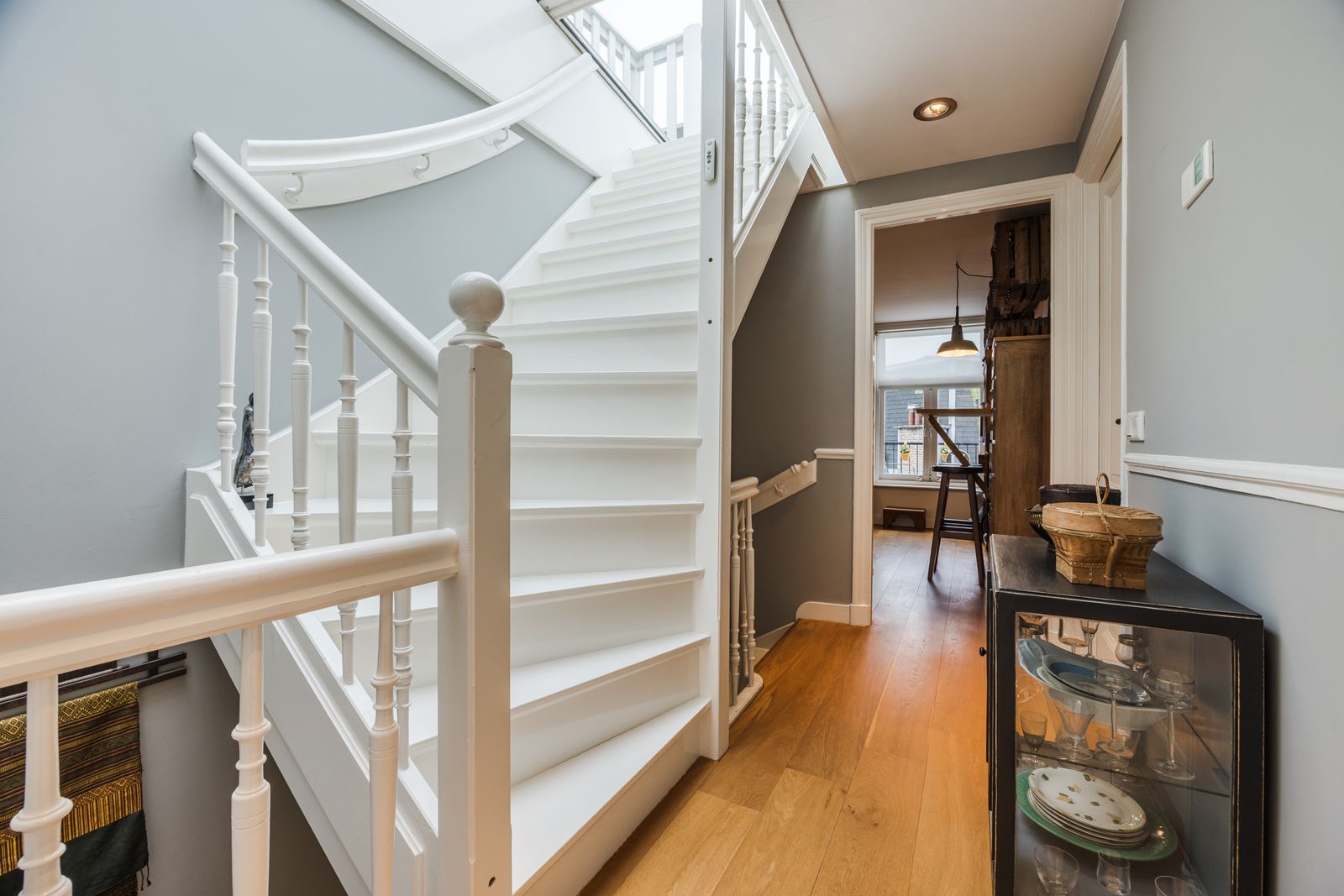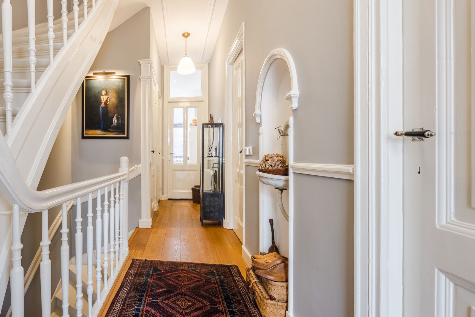 Statige entree met Portugese tegels en originele trapopgang.