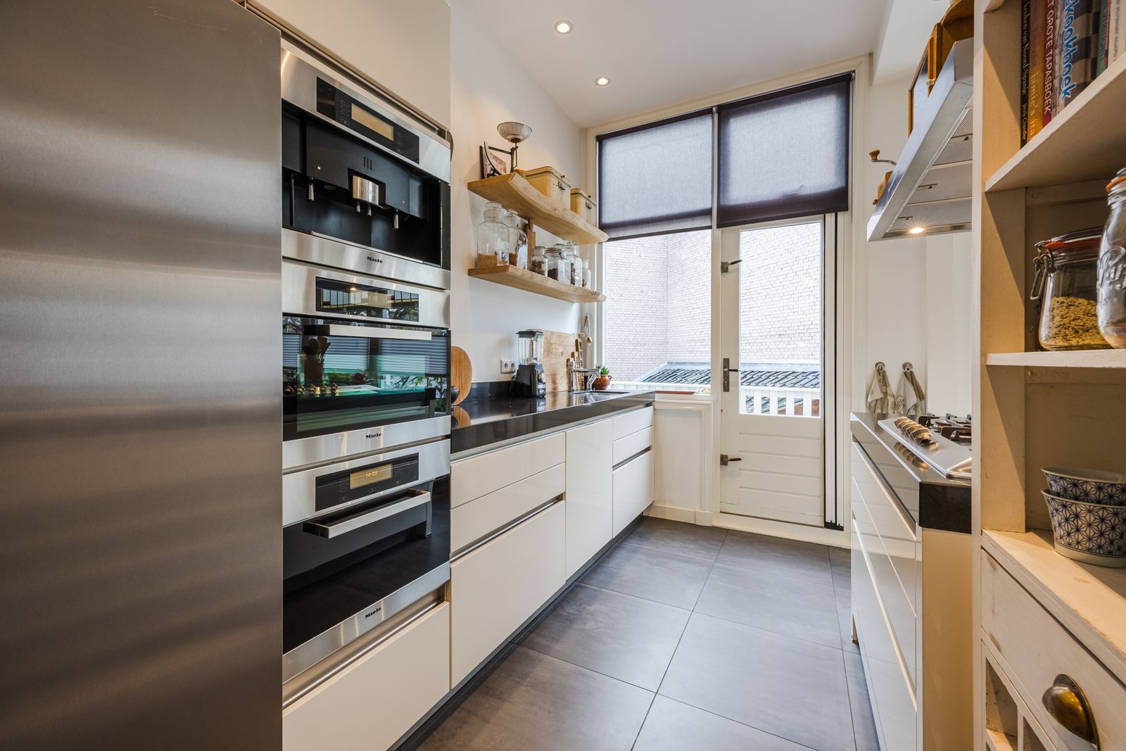 Moderne halfopen keuken met Quooker, vaatwasser, coffeemaker, oven, stoomoven, Amerikaanse koelkast en 5-pits gaskookplaat met rvs afzuiging.