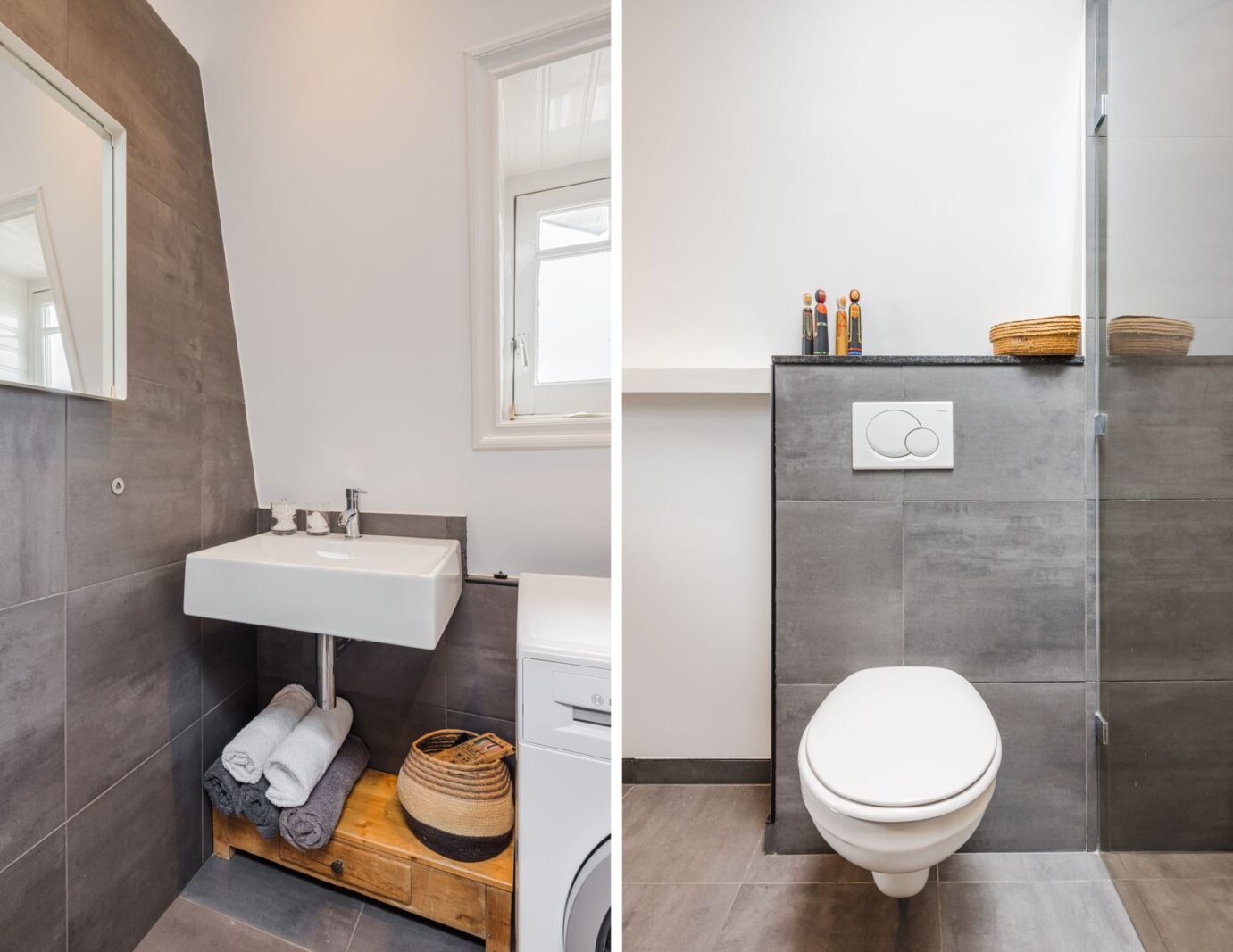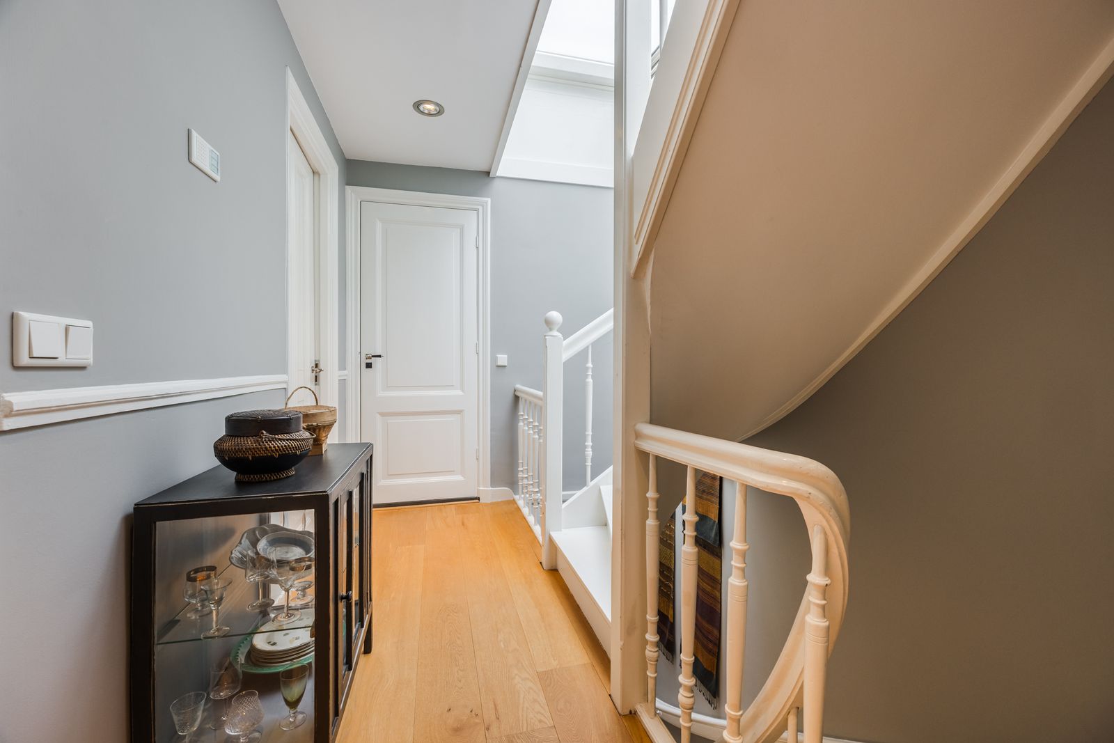 Overloop met veel lichtinval dankzij elektrisch schuifdak en vaste trap naar dakterras. Tweede moderne badkamer met inloopdouche, toilet, handdoekradiator, wasmachine-/drogeraansluiting, dakraam, originele erker en vloerverwarming.